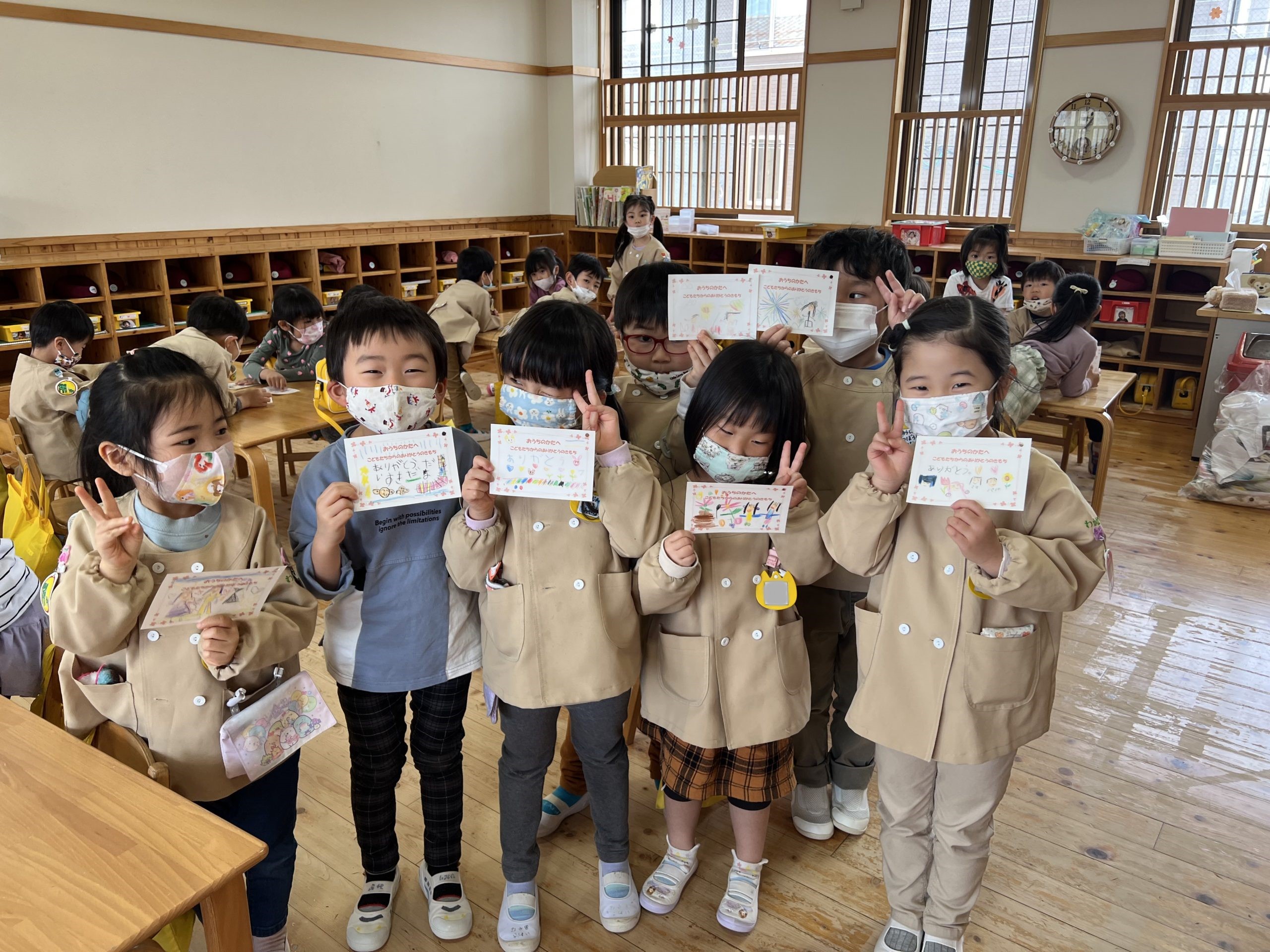 たんぽぽ組のお当番さん、今日が最後ということで全員が集まって出席報告に来てくれました。