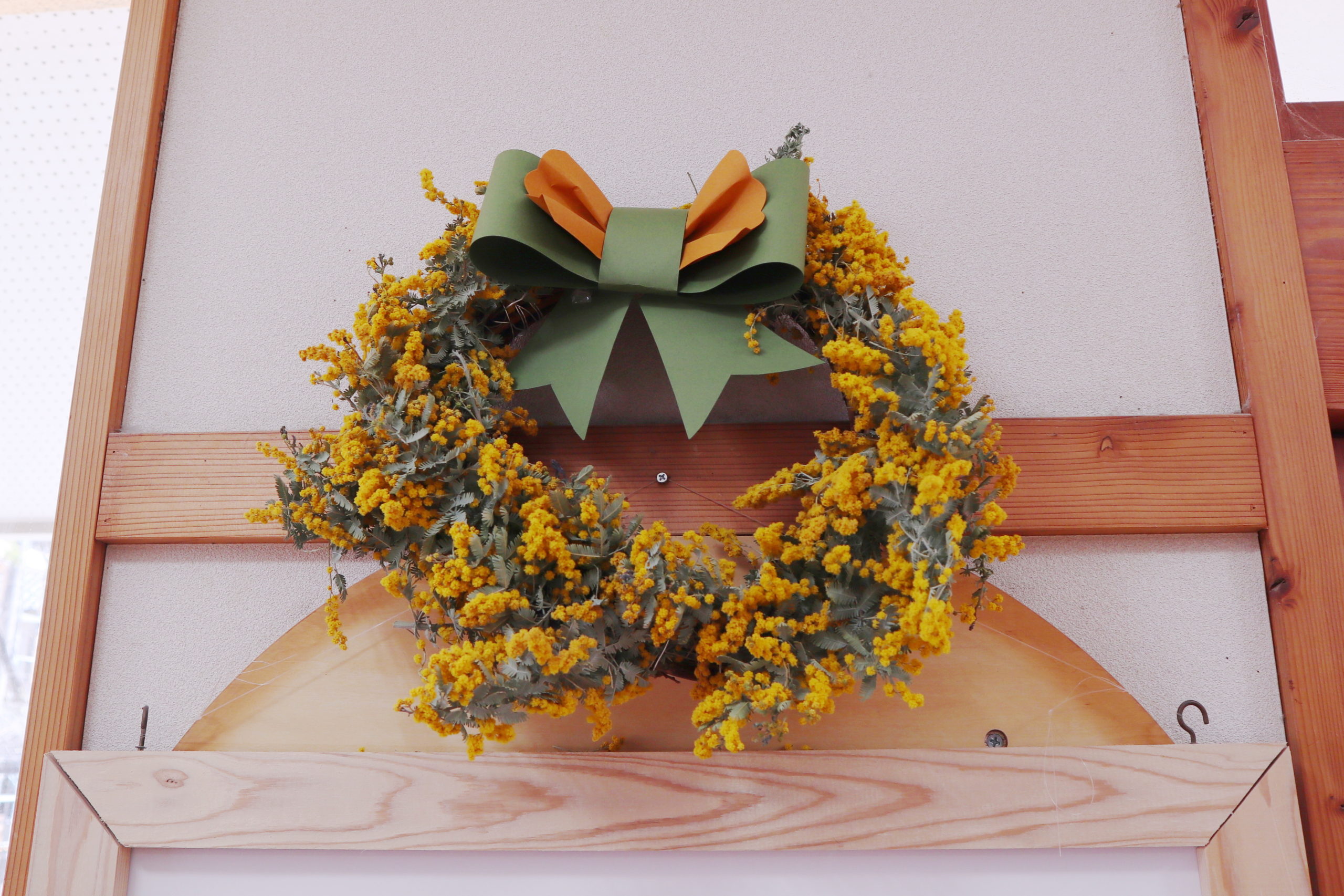 令和3年度「最後の日」を飾ったミモザの花木をリースにして、令和4年度「出発の日」、玄関ホール(はぐもー)に飾りました。
