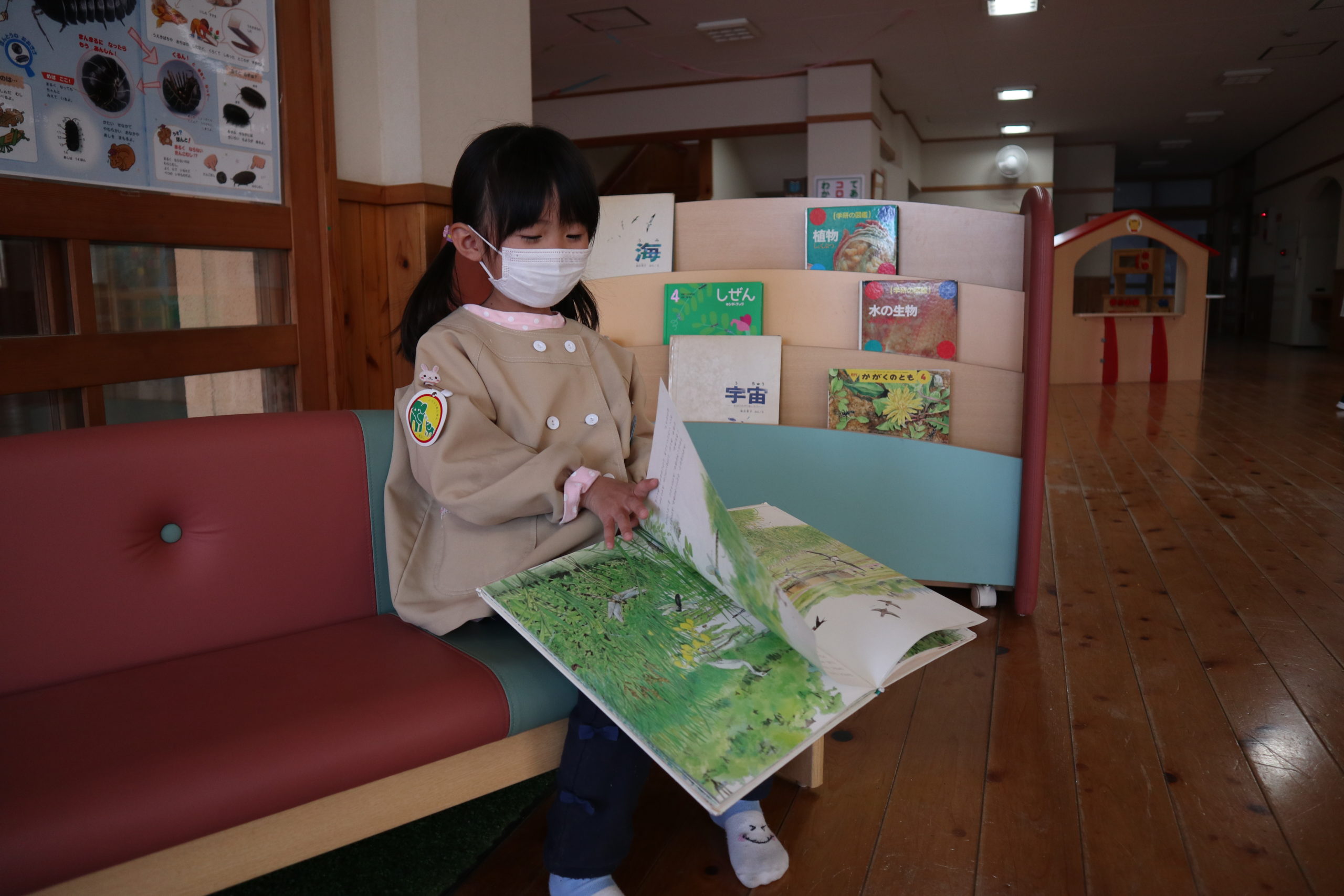 絵本を読んだり、虫や爬虫類や金魚を見たり、玄関のホールをHUGMO(ハグモー)と名付け新設しました。
