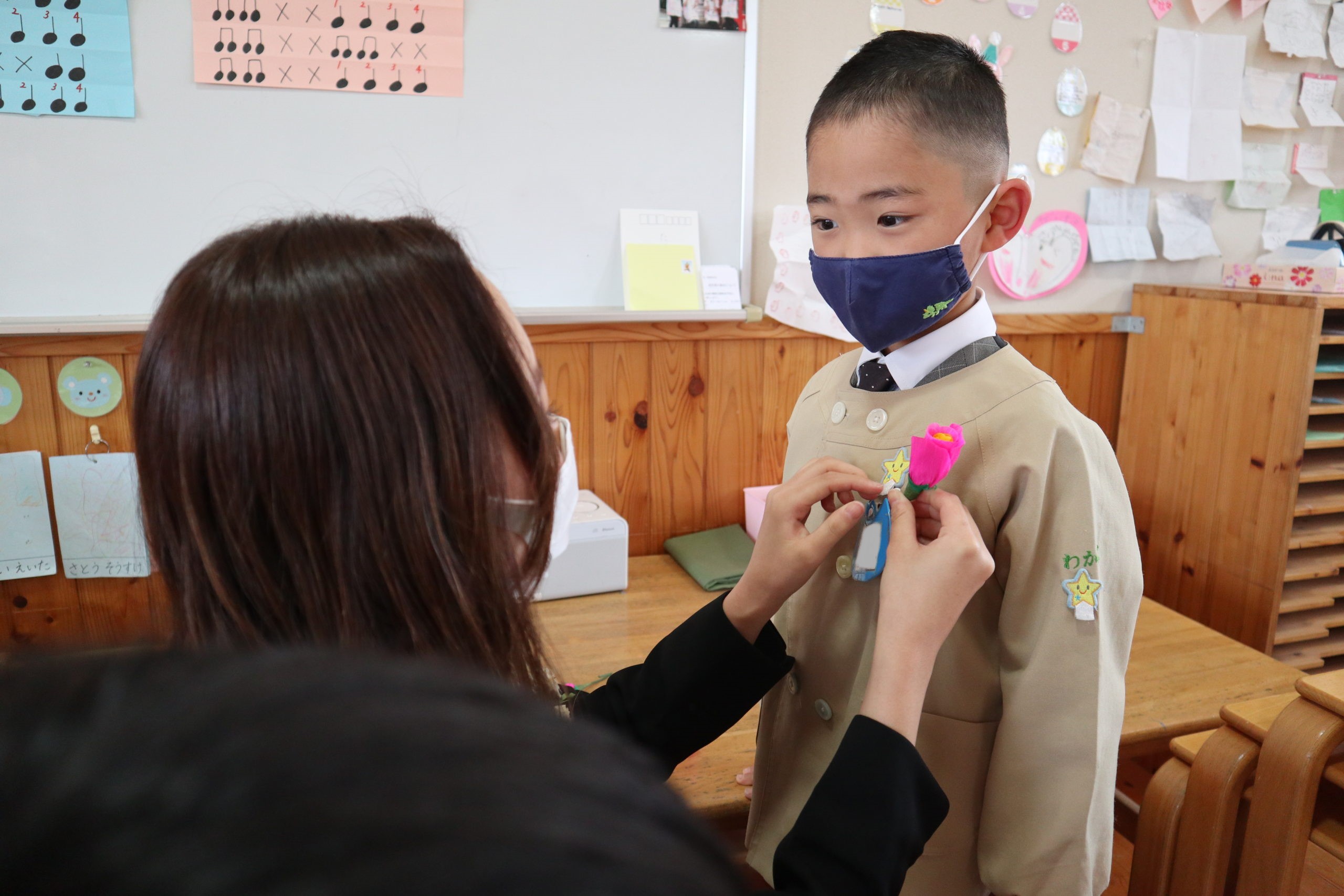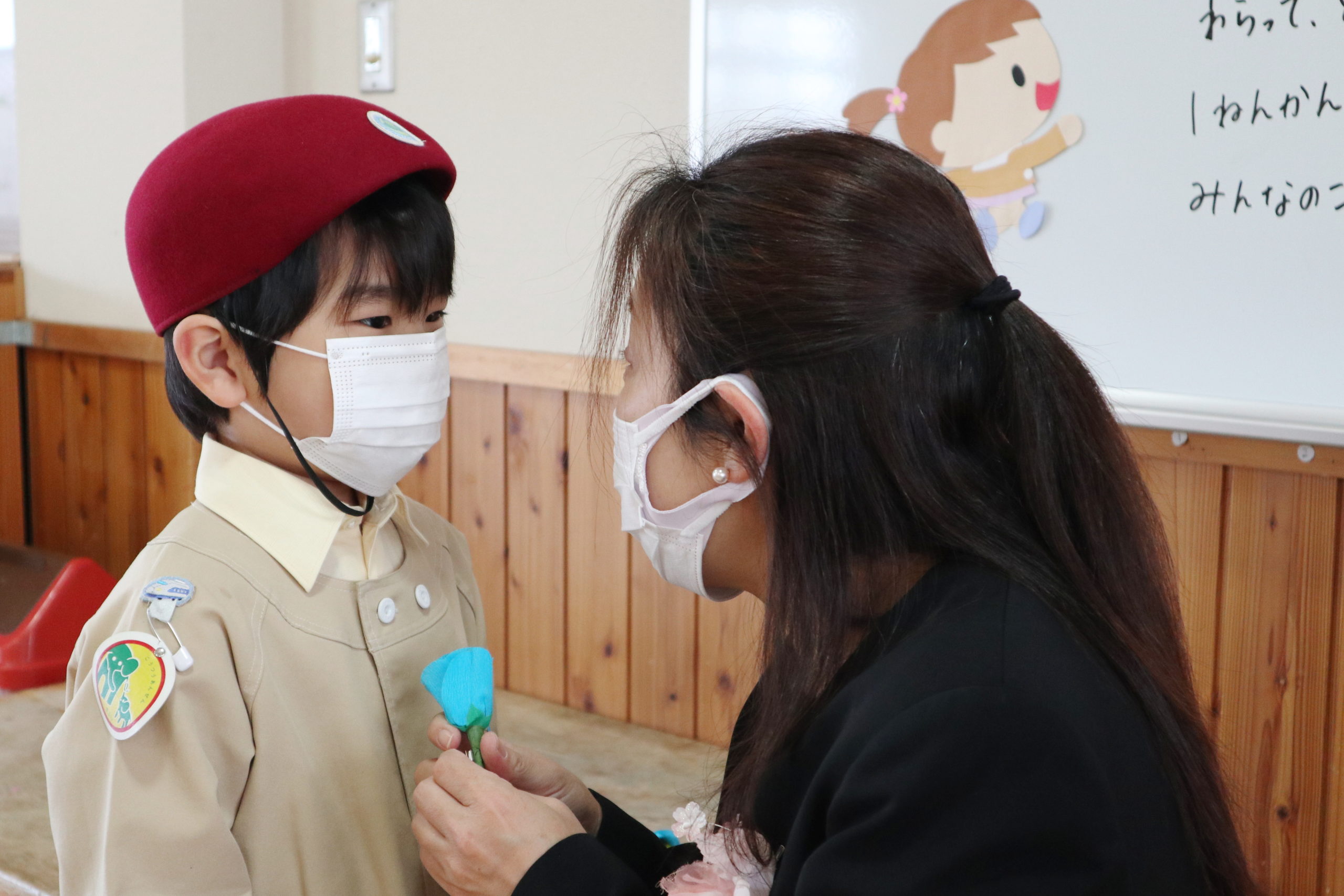 「おめでとう!いよいよ卒園式だね。がんばろうね。」先生から声を掛けられお花を胸につけてもらうとちょっぴり緊張した面持ちからにこっといつものお顔になりました。