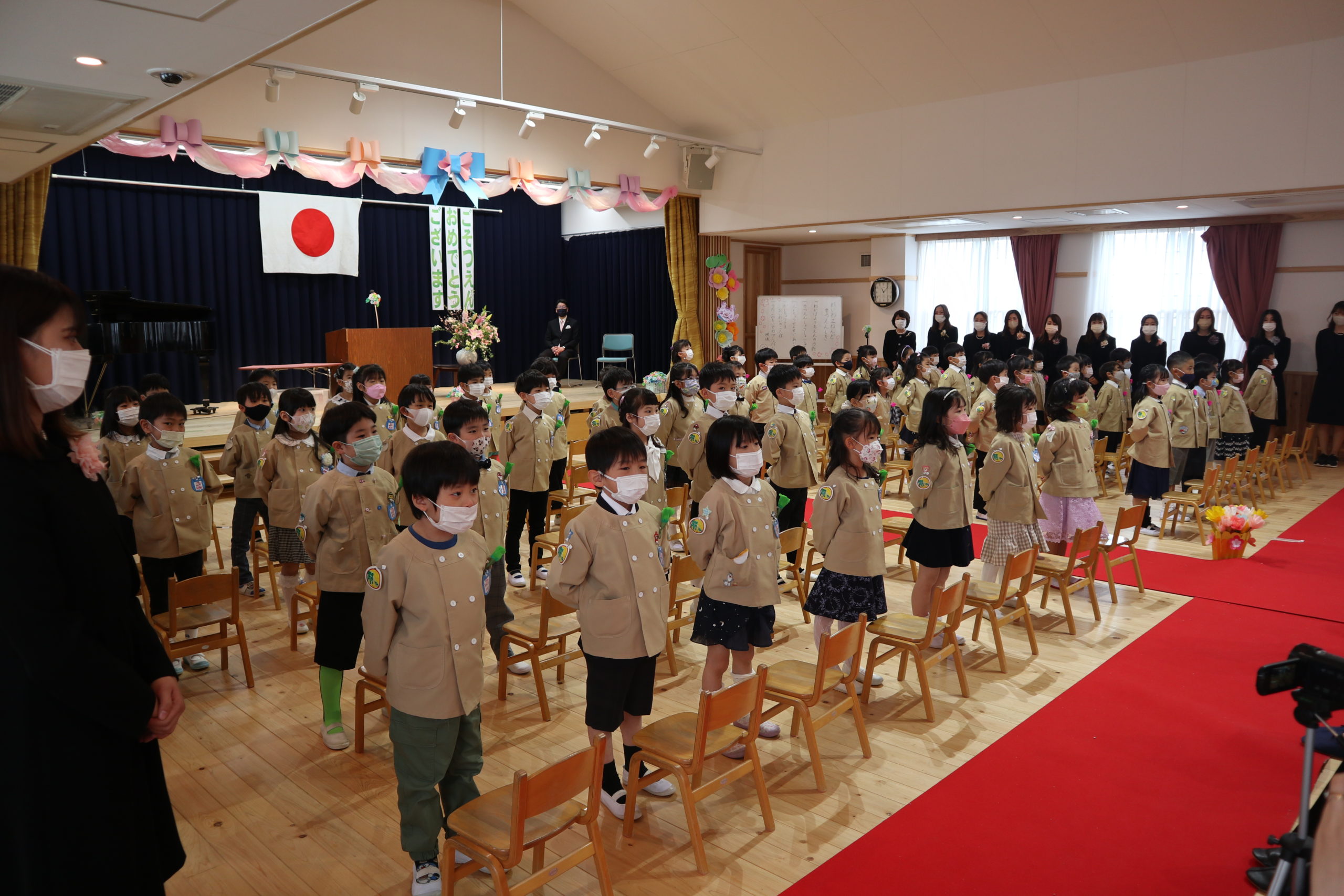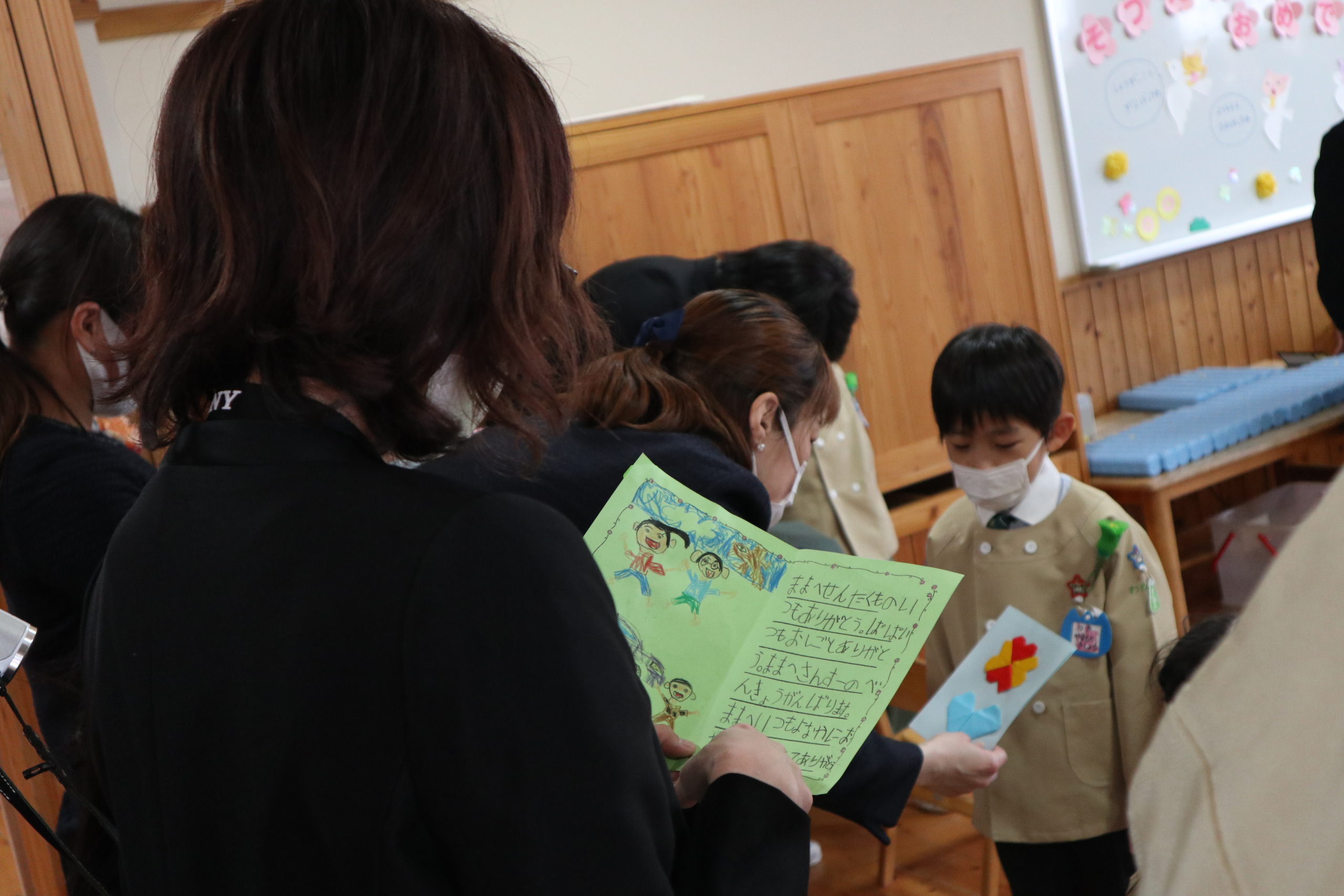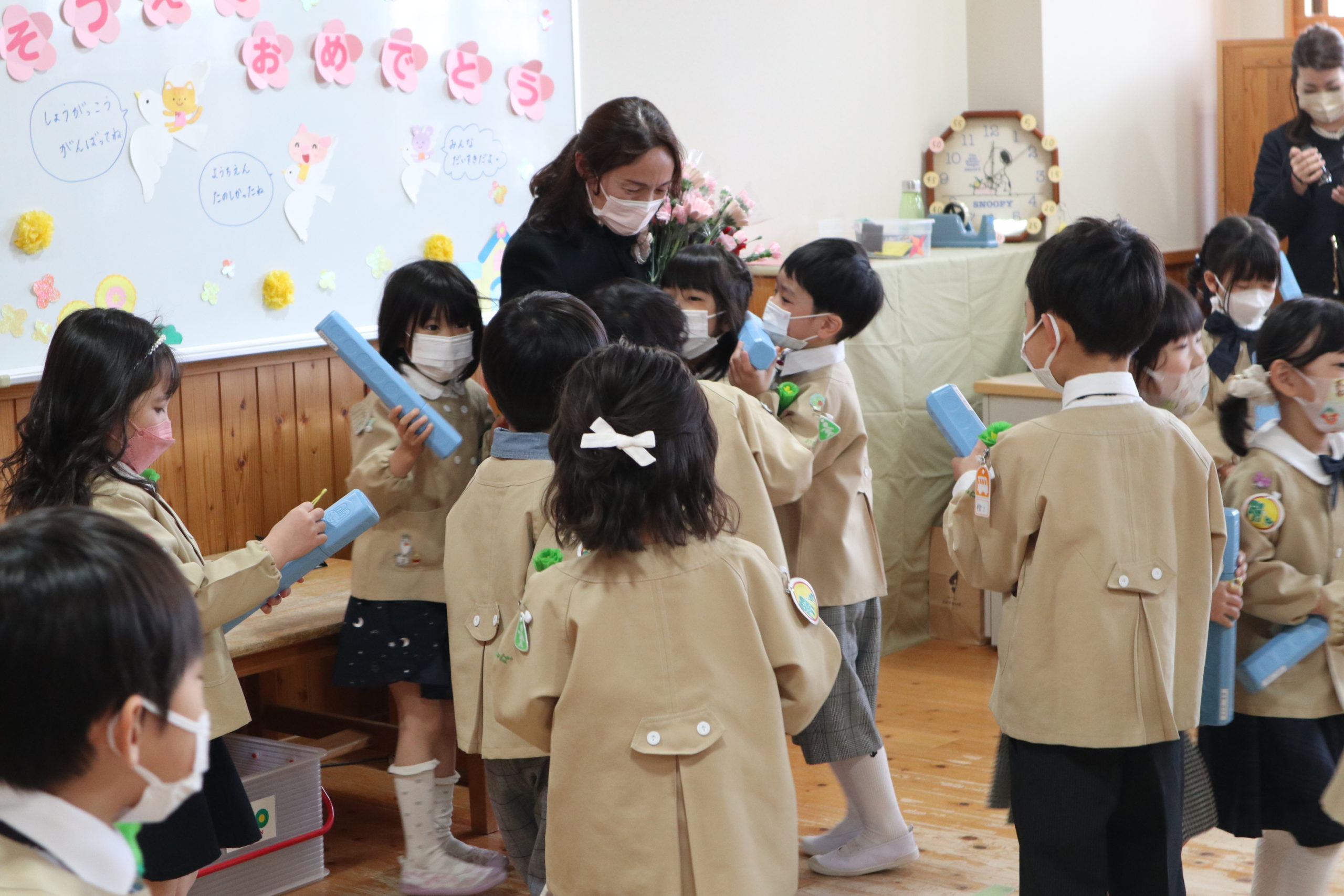 園長先生は「ご卒園おめでとうございます。みなさんには強い人、優しい人になってほしいです。強い人とは、目標や目的に向かって、嫌なことでも取り組む強い意志を持って頑張る人です。嫌なことや困ったりした時は、自分の気持ちを相手に伝えられる強さを持ってほしいです。困っている人にはどうしたの?と声を掛けてあげたり、手を差し伸べられる優しい人になってほしいです。」と願いをこどもたちにお話されました。