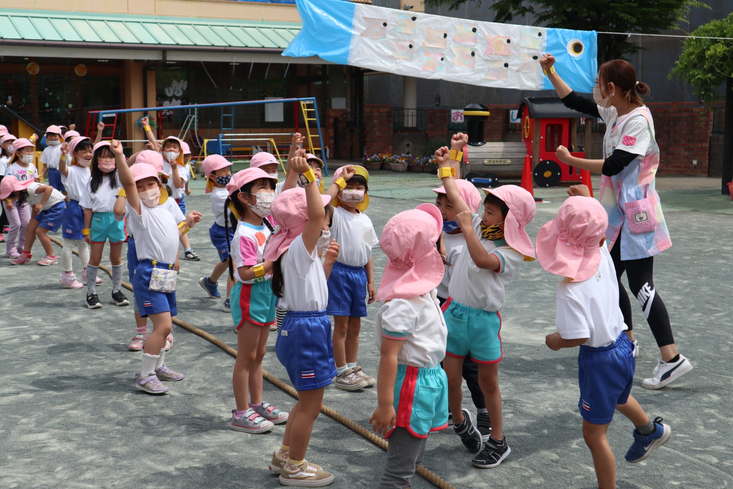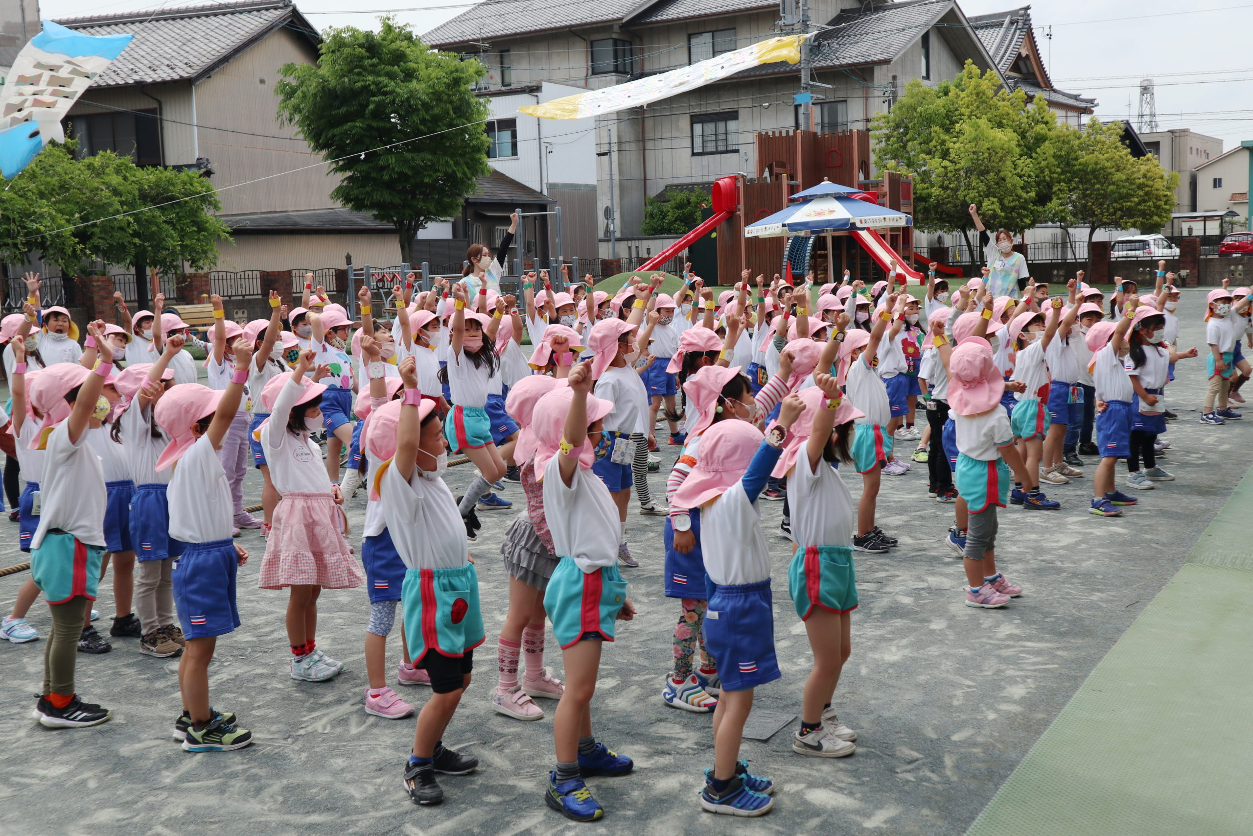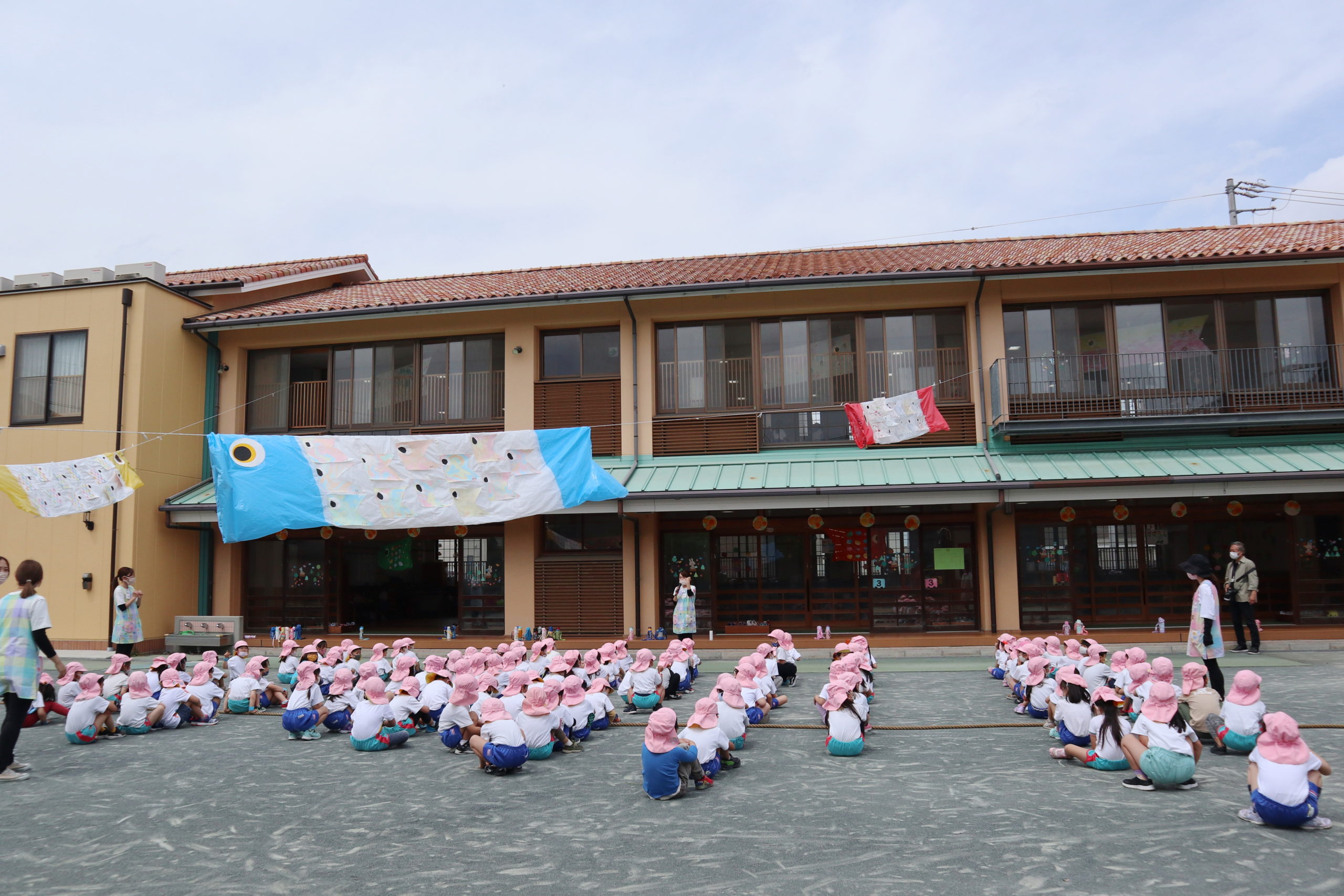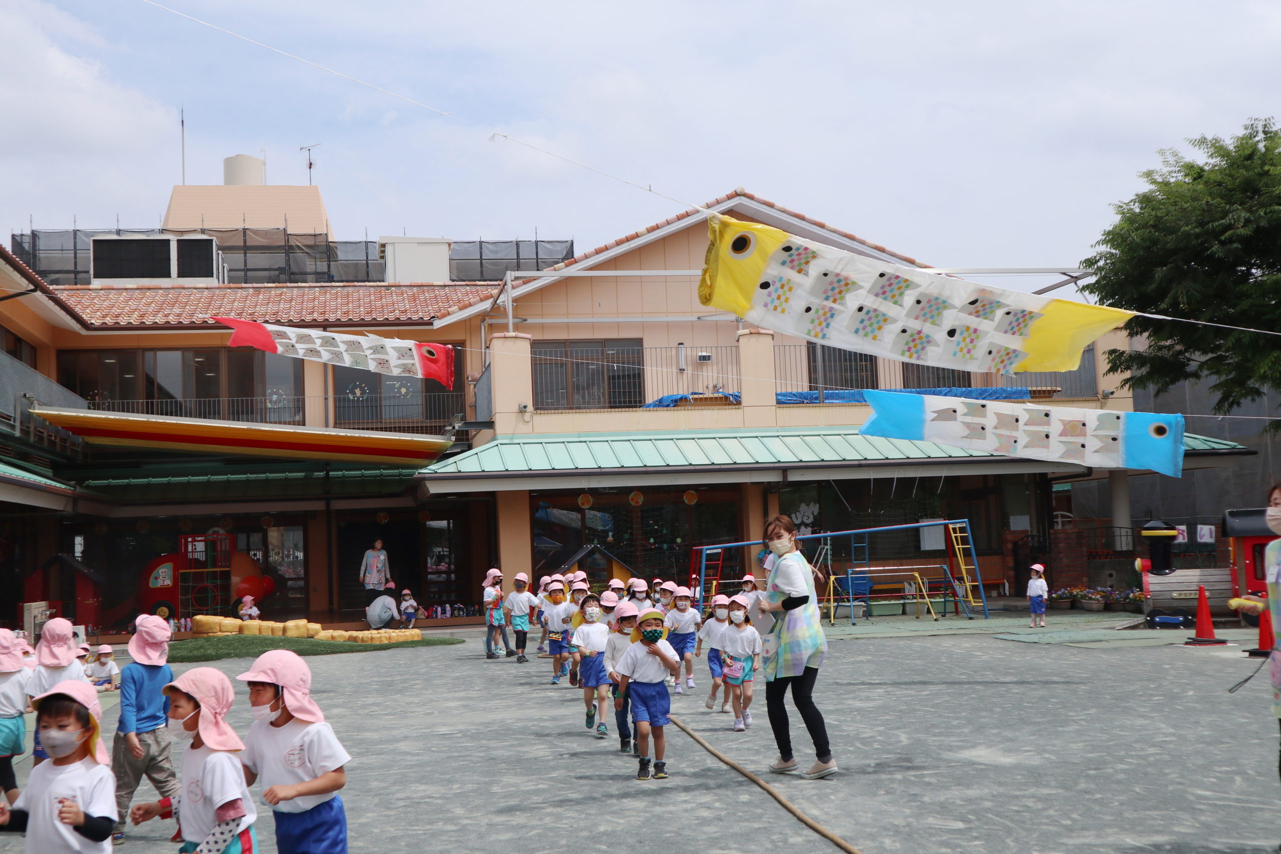園長先生よりお話がありました。「昨日は5月5日こどもの日だったね。お家でみんなの成長をお祝いをして頂いたと思います。みんなが大きくなったのは誰のお陰かな?」「パパやママ!」「そうだね。お父さんやお母さんが大事に皆さんを育ててくださったからですね。だからこどもの日はみんなの成長をお祝いする日だけでなくみんながお父さんお母さんにありがとうと感謝する日でもあるんだよ。こいのぼりはどうしてあげられるようになったか知ってる?昔中国の黄河という川の上流に、とても高く流れの早い滝(龍門)がありました。たくさんのお魚の中でもどのお魚が水の流れに逆らって滝を登ったと思う?」と園長先生が尋ねるとこどもたちは「鯉!」と元気いっぱいに答えていました。「そう!鯉だね。滝を登った鯉がお空にあがったことからこいのぼりをあげるようになったのですね。このお話は登竜門と呼ばれているよ。静かにお話を聞いてくれてありがとう!それではこいのぼりフェスティバルをみんなで楽しんでくださいね。」
