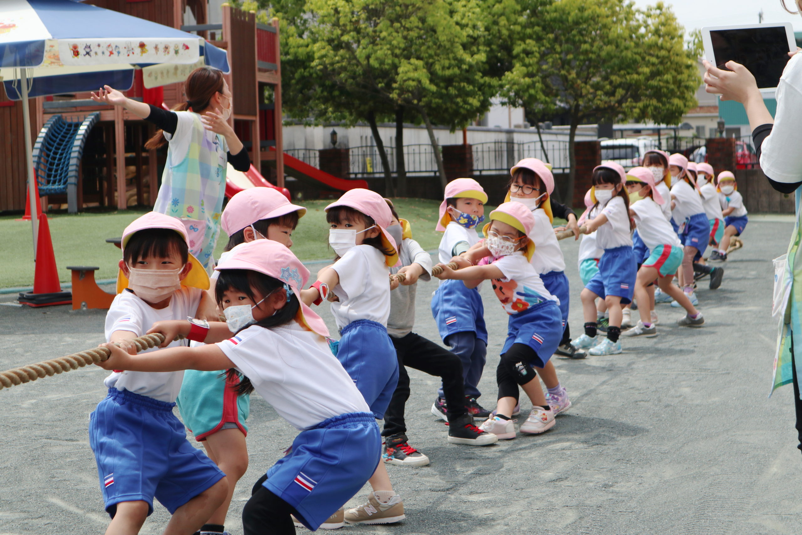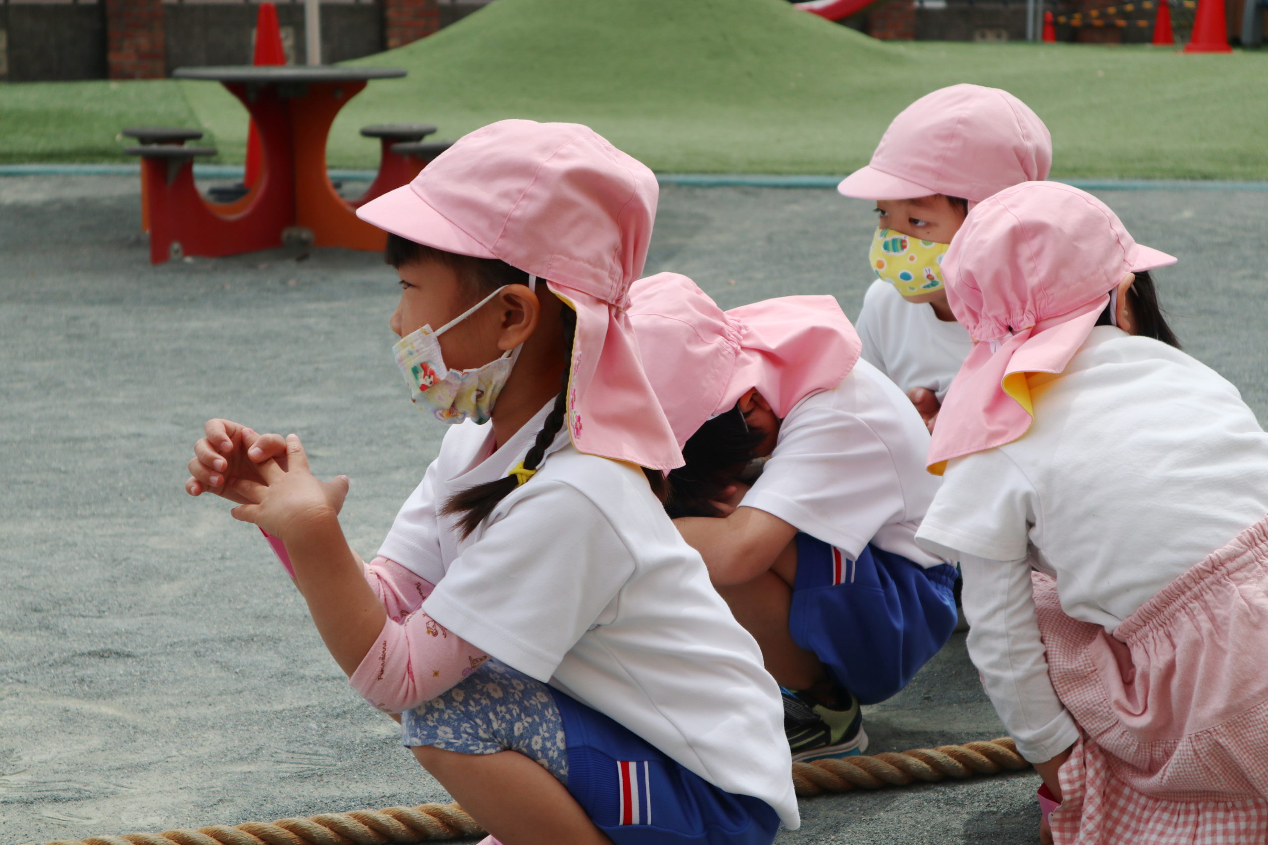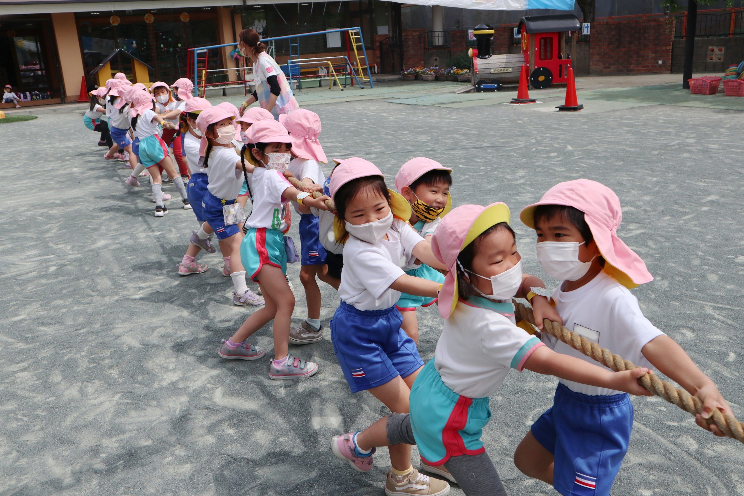 「がーんばれ!がーんばれ!」みほ先生のかけ声に合わせて必死に縄をひっぱるゆき組さん。おっとっと、相手はなかなか手強いね。引っ張られながらも踏ん張るよ!「そーれ!そーれ!」最後まで絶対諦めないにじ組さん。やる時はやるよ!普段はおっとりさんも逞しいお顔を見せてくれました。やったーと跳びあがって喜ぶこどもたち。