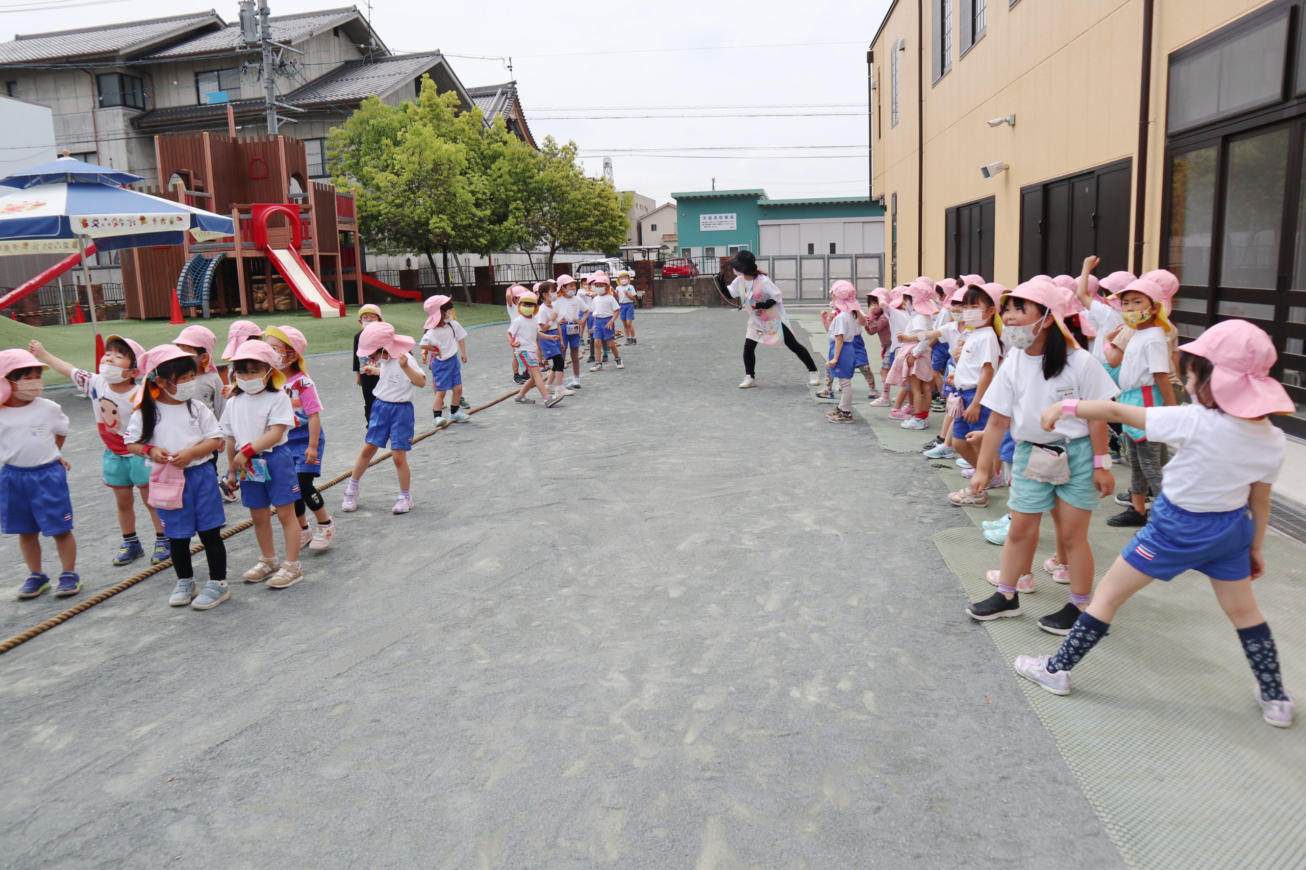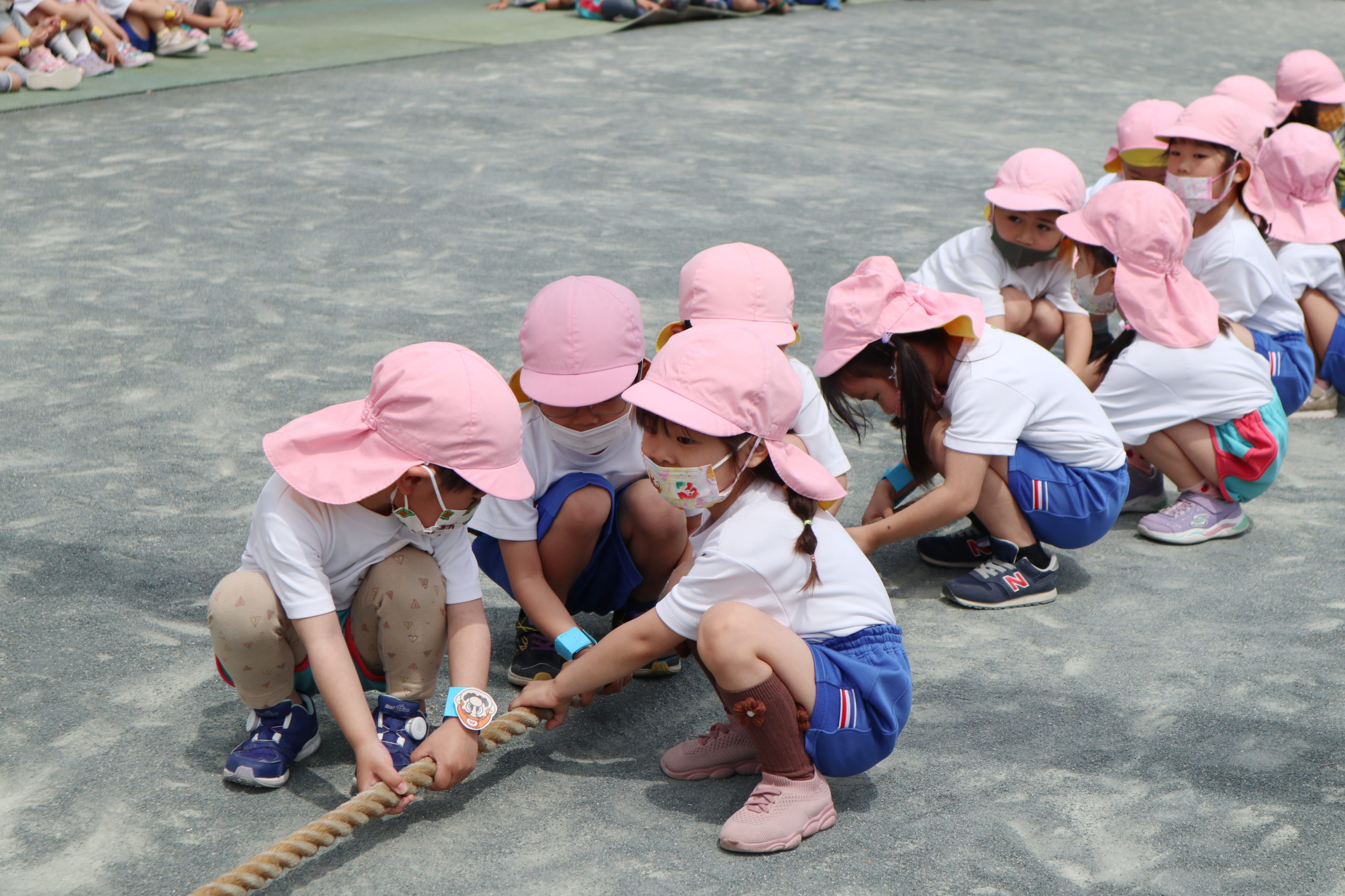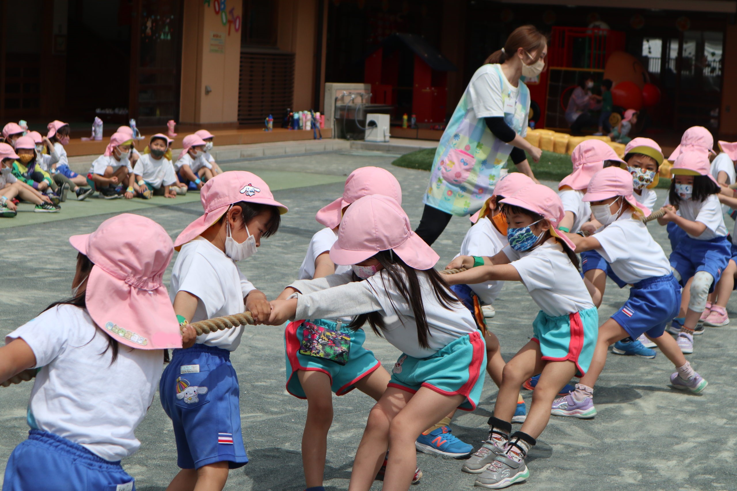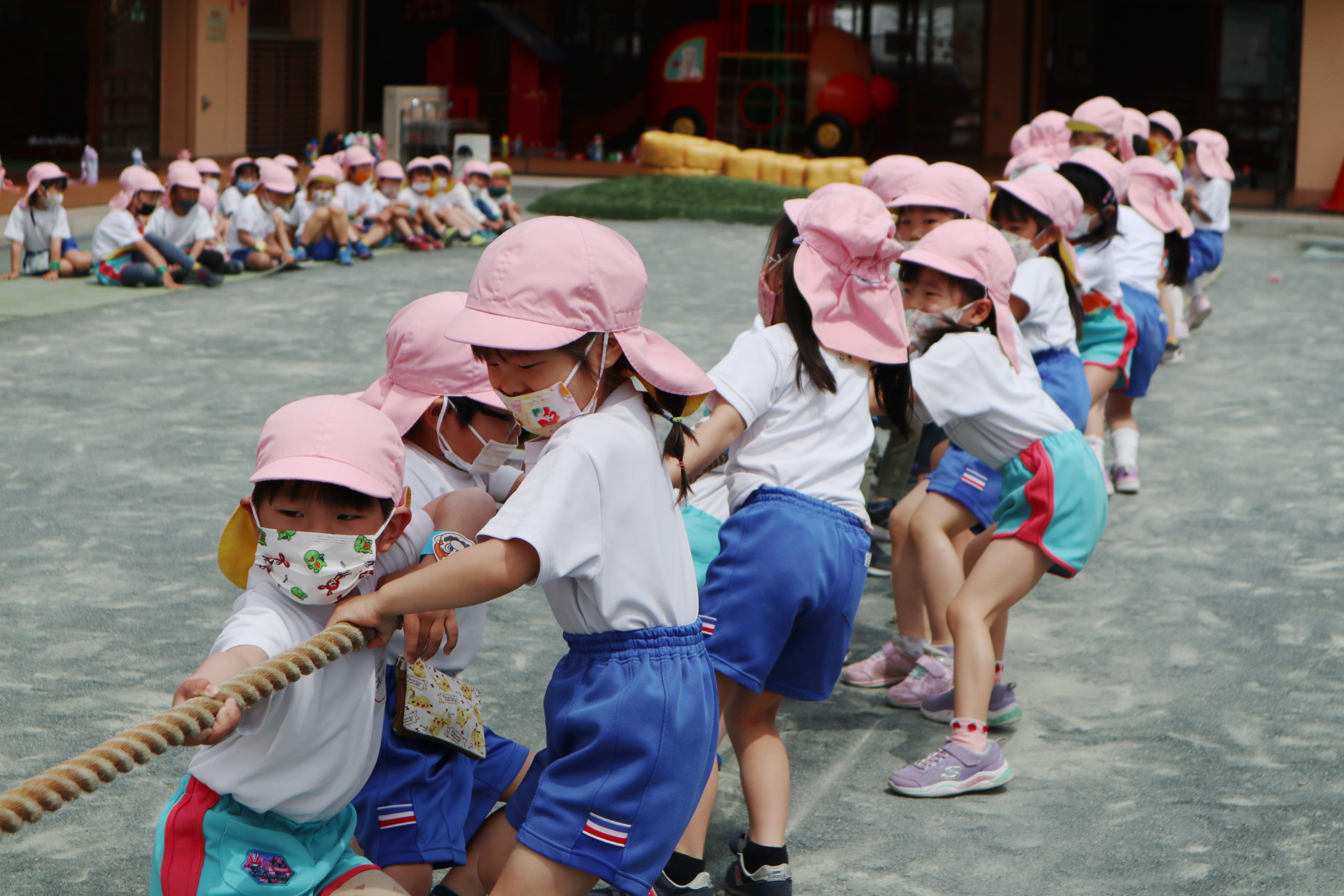 「がーんばれ!がーんばれ!」みほ先生のかけ声に合わせて必死に縄をひっぱるゆき組さん。おっとっと、相手はなかなか手強いね。引っ張られながらも踏ん張るよ!「そーれ!そーれ!」最後まで絶対諦めないにじ組さん。やる時はやるよ!普段はおっとりさんも逞しいお顔を見せてくれました。やったーと跳びあがって喜ぶこどもたち。