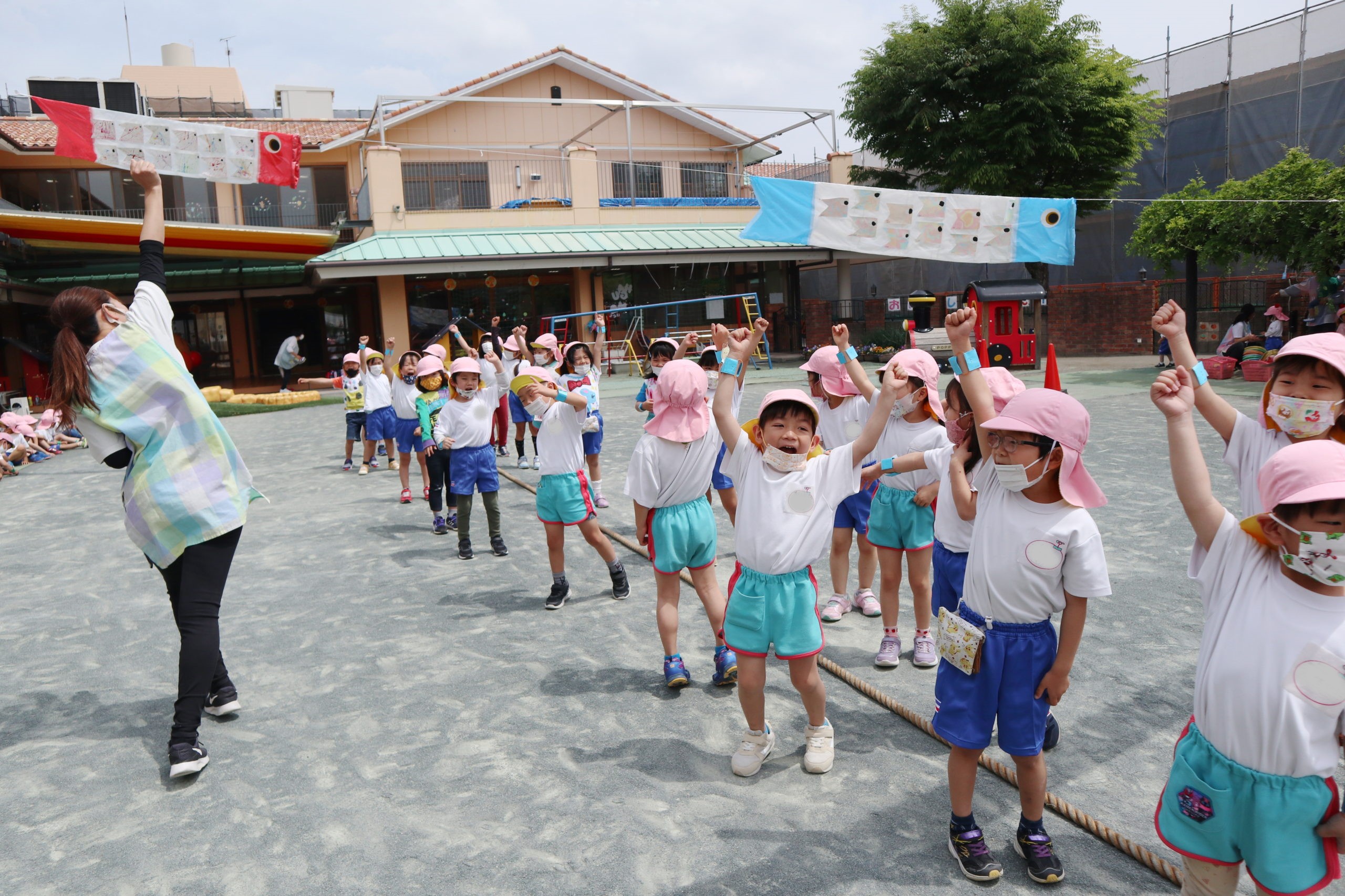 すいすい泳ぐこいのぼりの下、元気なこどもたちが駆け足で入場!「ほし組さん頑張るぞオー!」突き上げた拳に力が入ります。みんな気合十分。そらぐみさんも負けずにがんばるぞオー!縄をつかんで始まりの合図を待ちます。