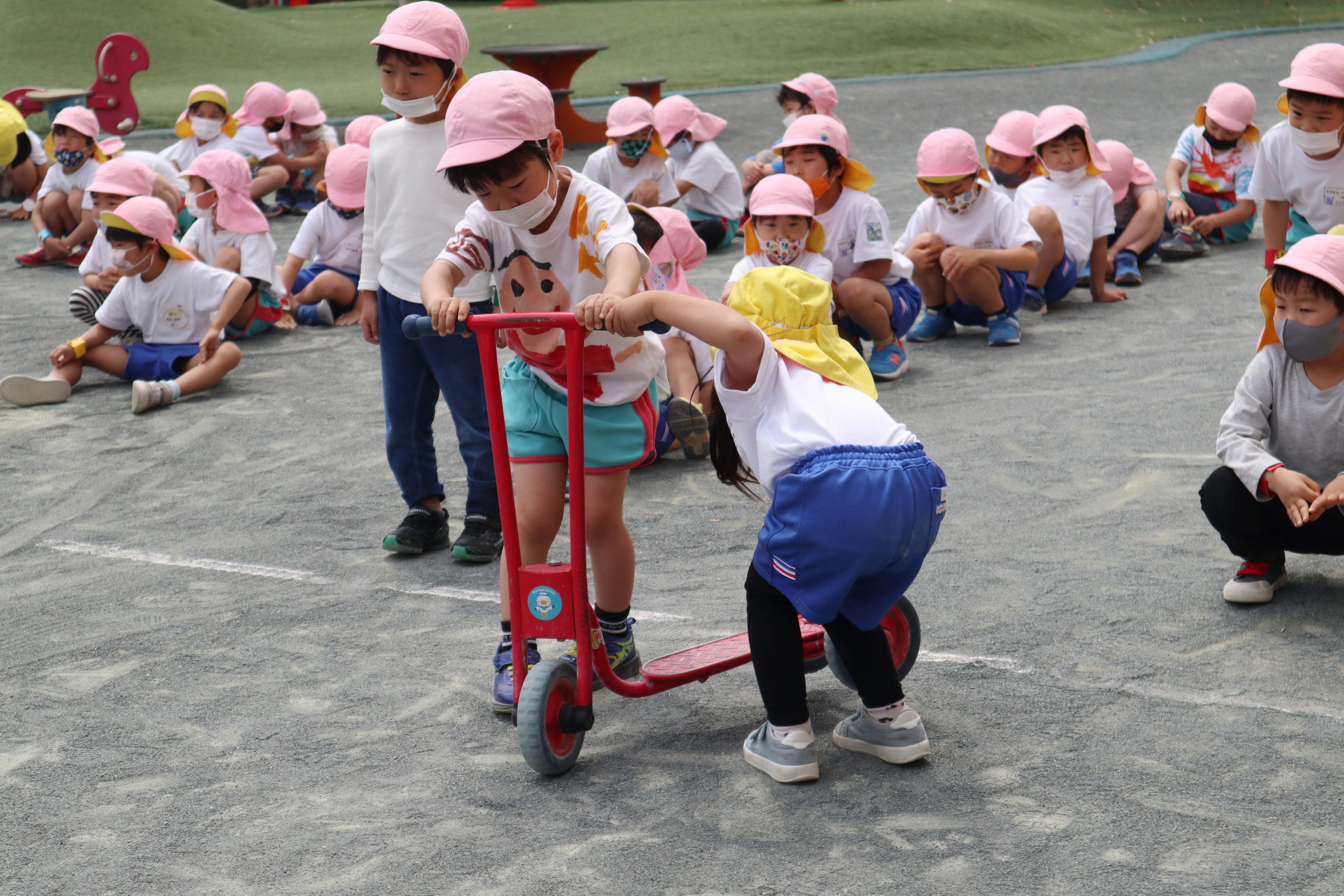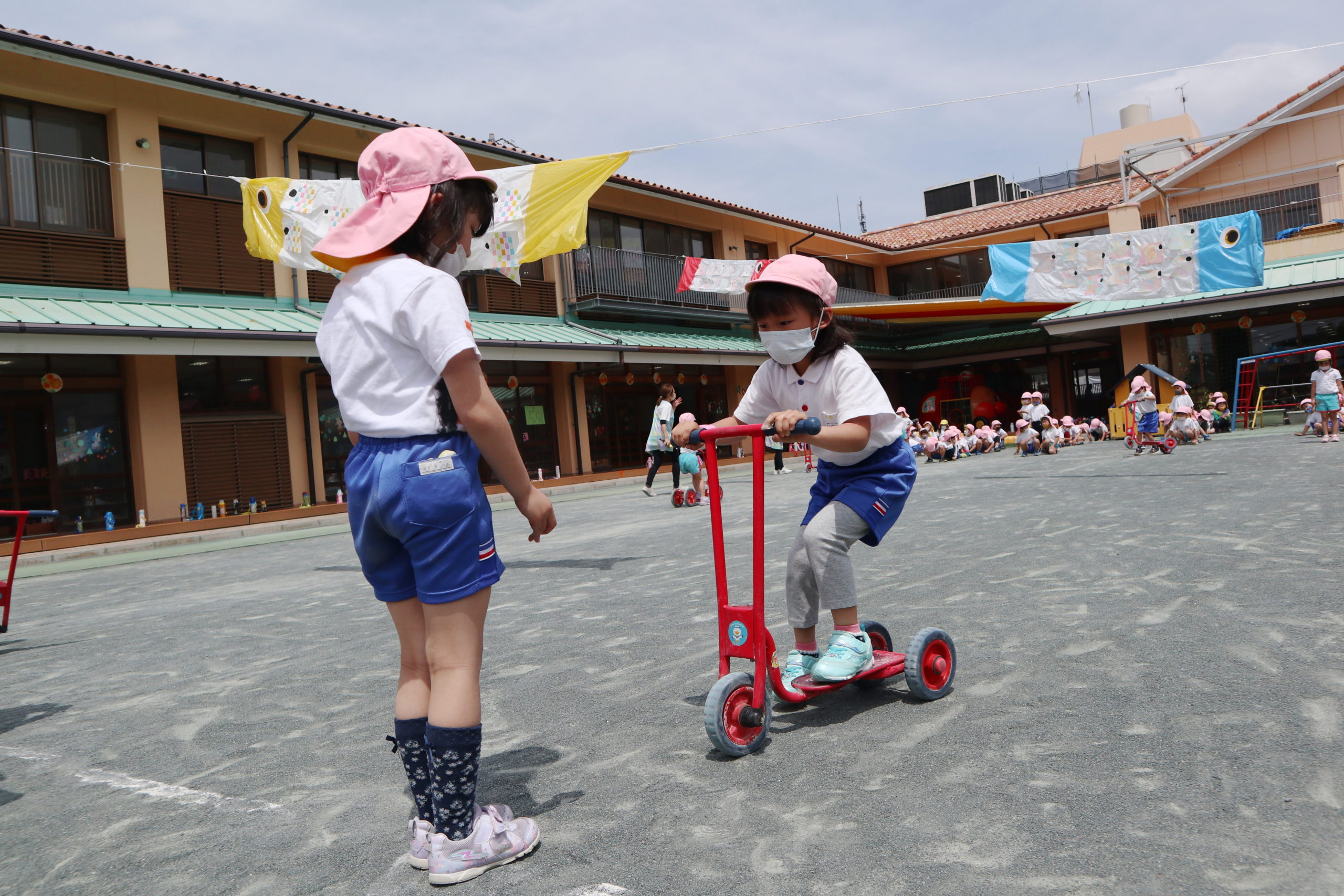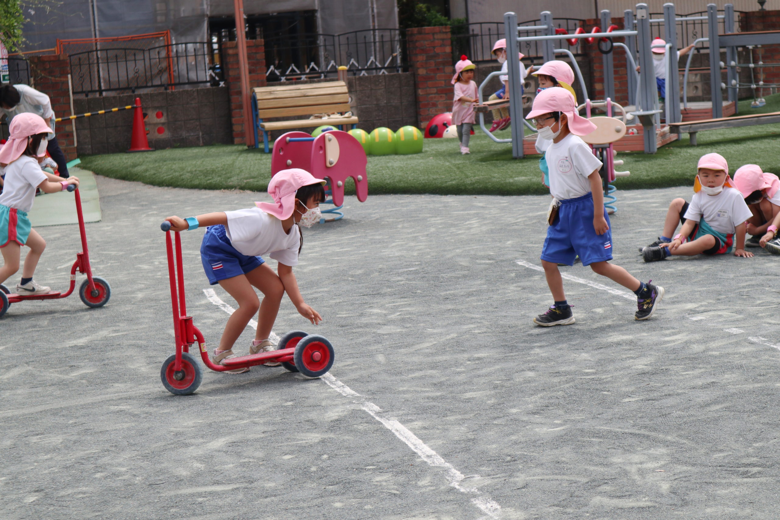 次のおともだちを真っ直ぐ目指して走っていくよ。バトンタッチまであともう少し。スクーターの向きを変えてから次のおともだちにバトンタッチ!丁寧に速く次のおともだちが乗りやすいように気配りできてすごいなと感じたよ。「頑張ってね!」と声をかけ、思いを繋ぐよ。次のおともだちがしっかり乗るまでスクーターを支えるおともだち。スピードに乗って気持ちいいね。