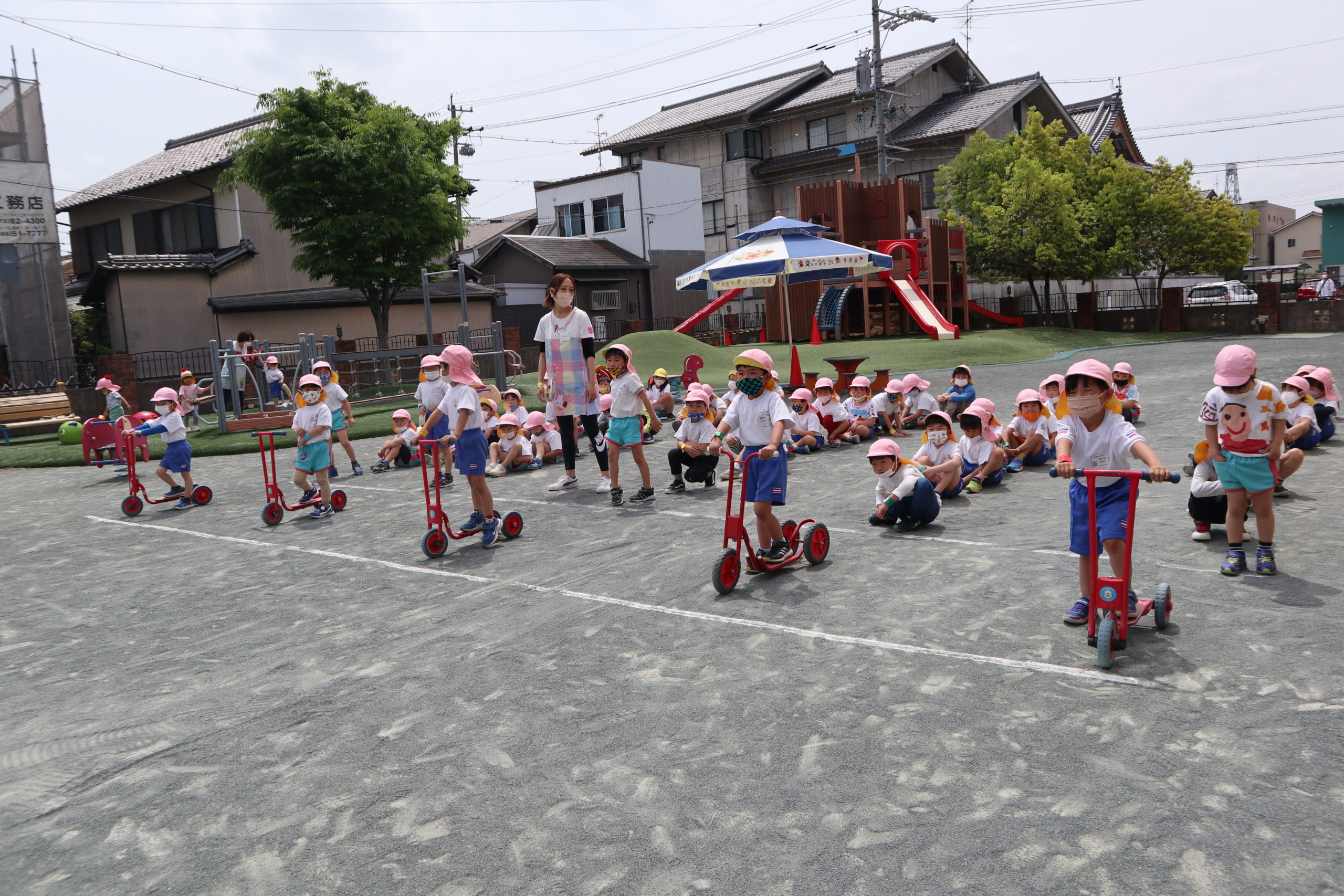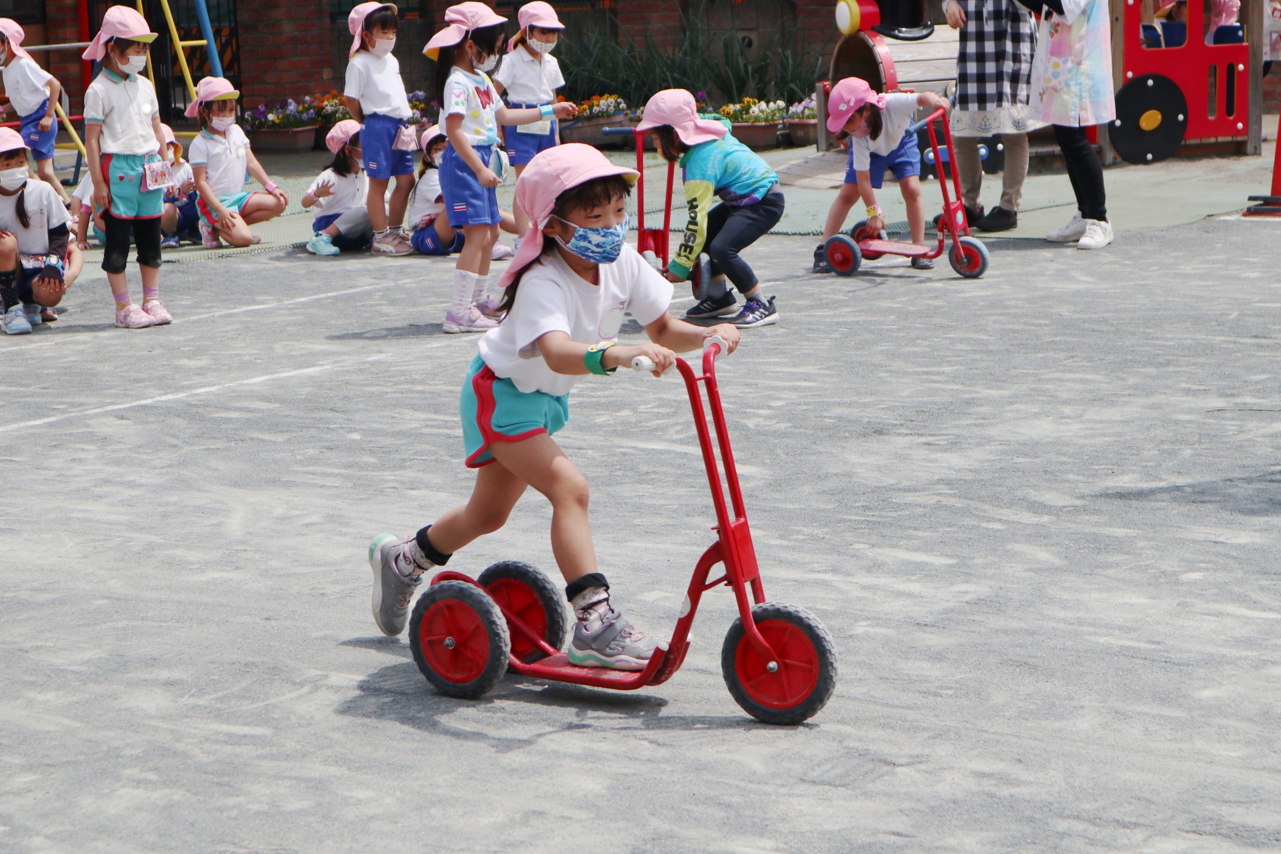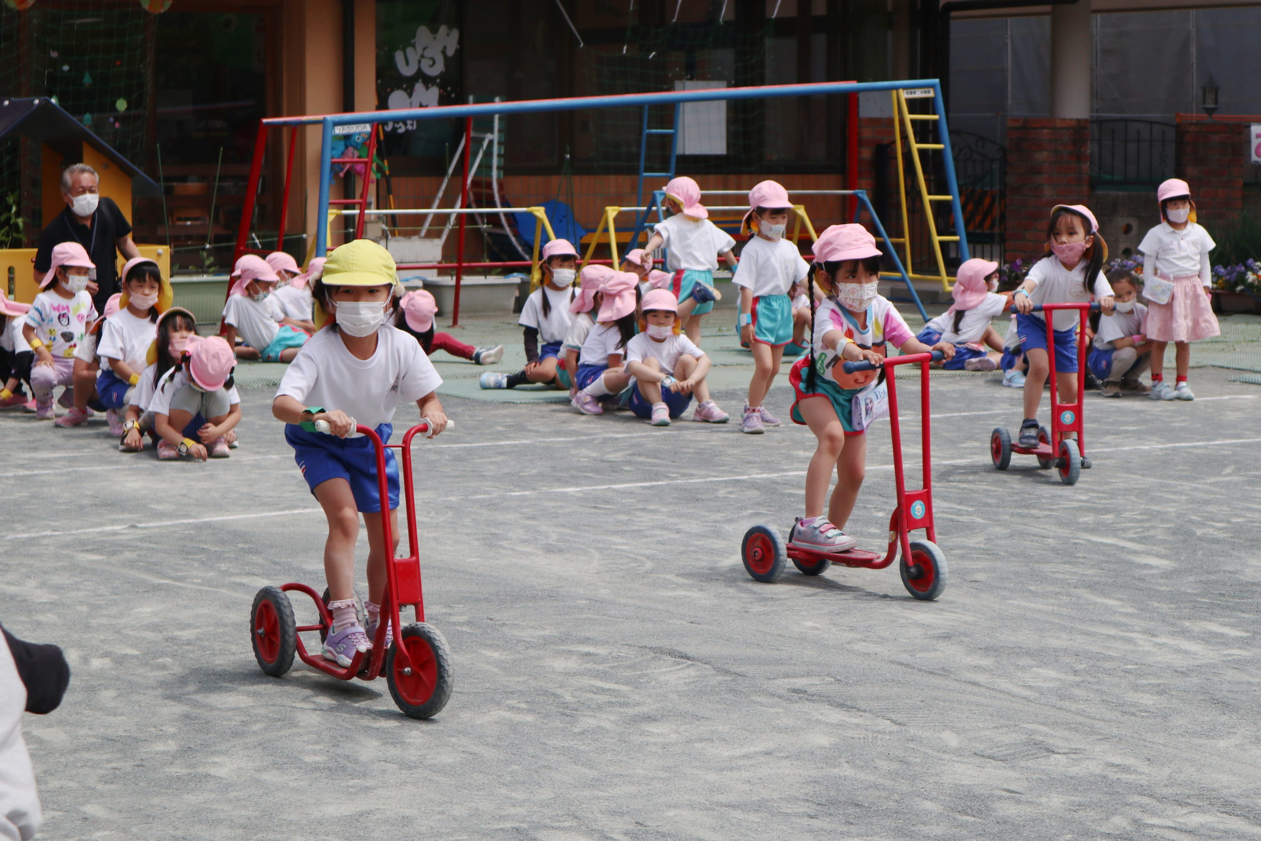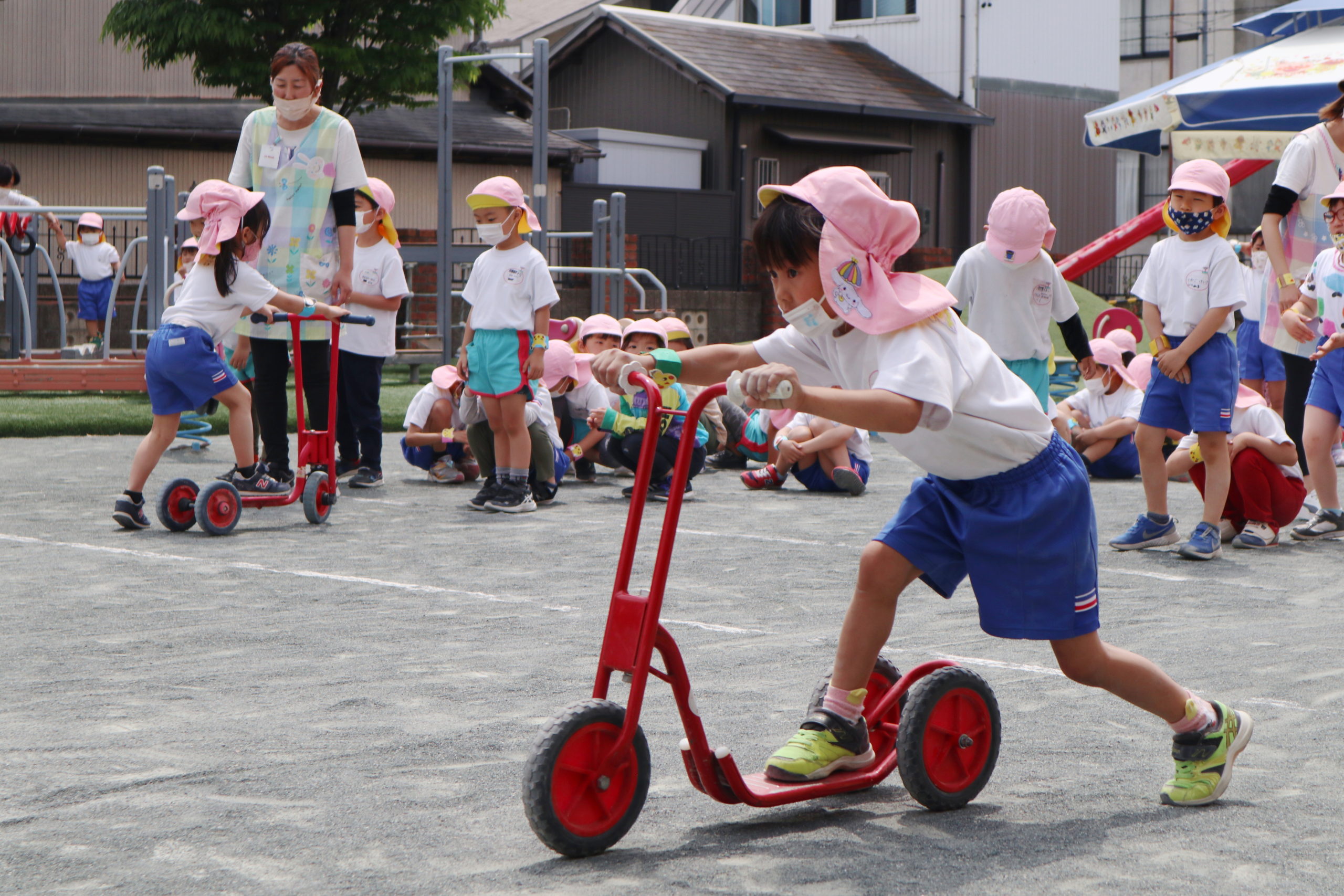 次のおともだちを真っ直ぐ目指して走っていくよ。バトンタッチまであともう少し。スクーターの向きを変えてから次のおともだちにバトンタッチ!丁寧に速く次のおともだちが乗りやすいように気配りできてすごいなと感じたよ。「頑張ってね!」と声をかけ、思いを繋ぐよ。次のおともだちがしっかり乗るまでスクーターを支えるおともだち。スピードに乗って気持ちいいね。