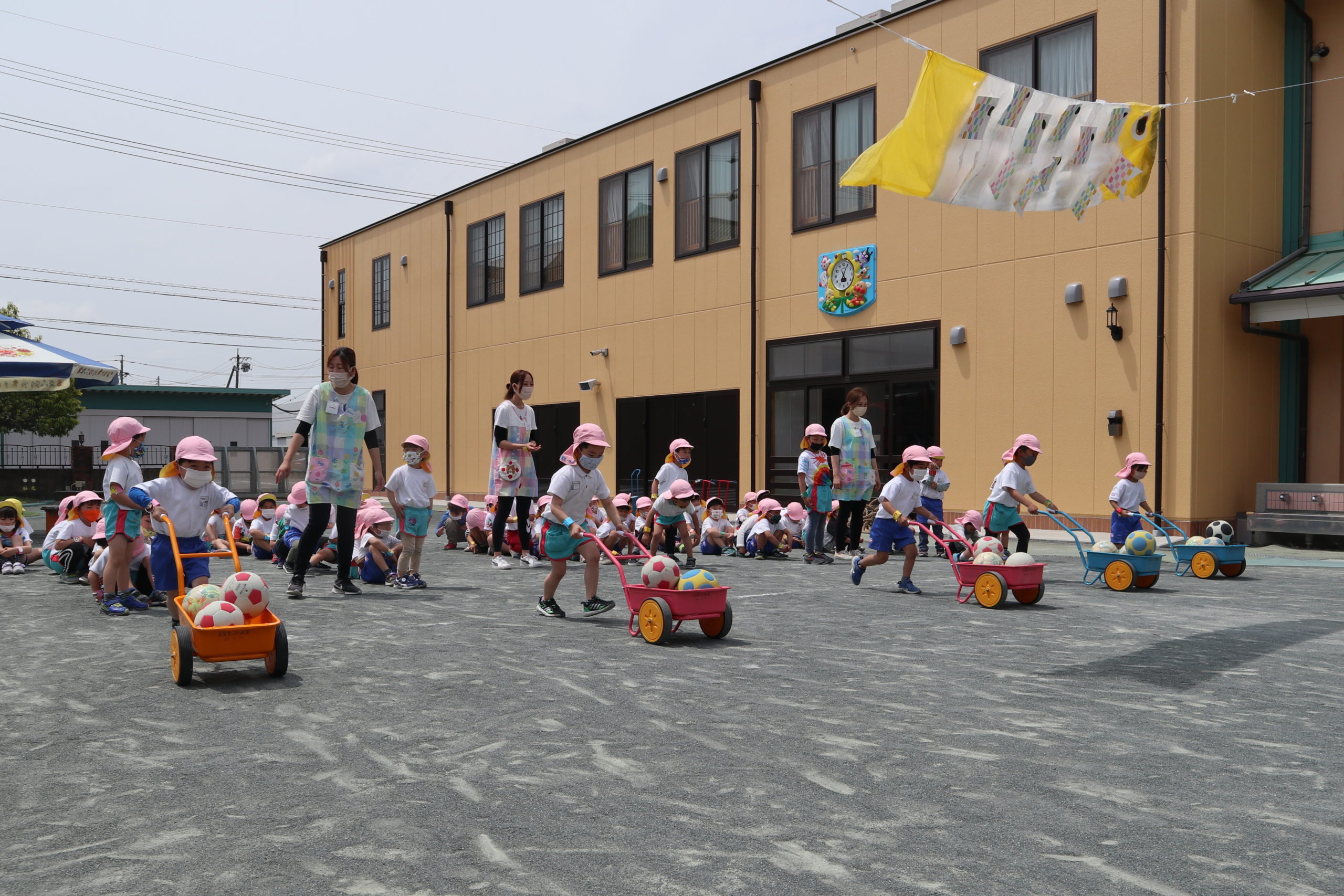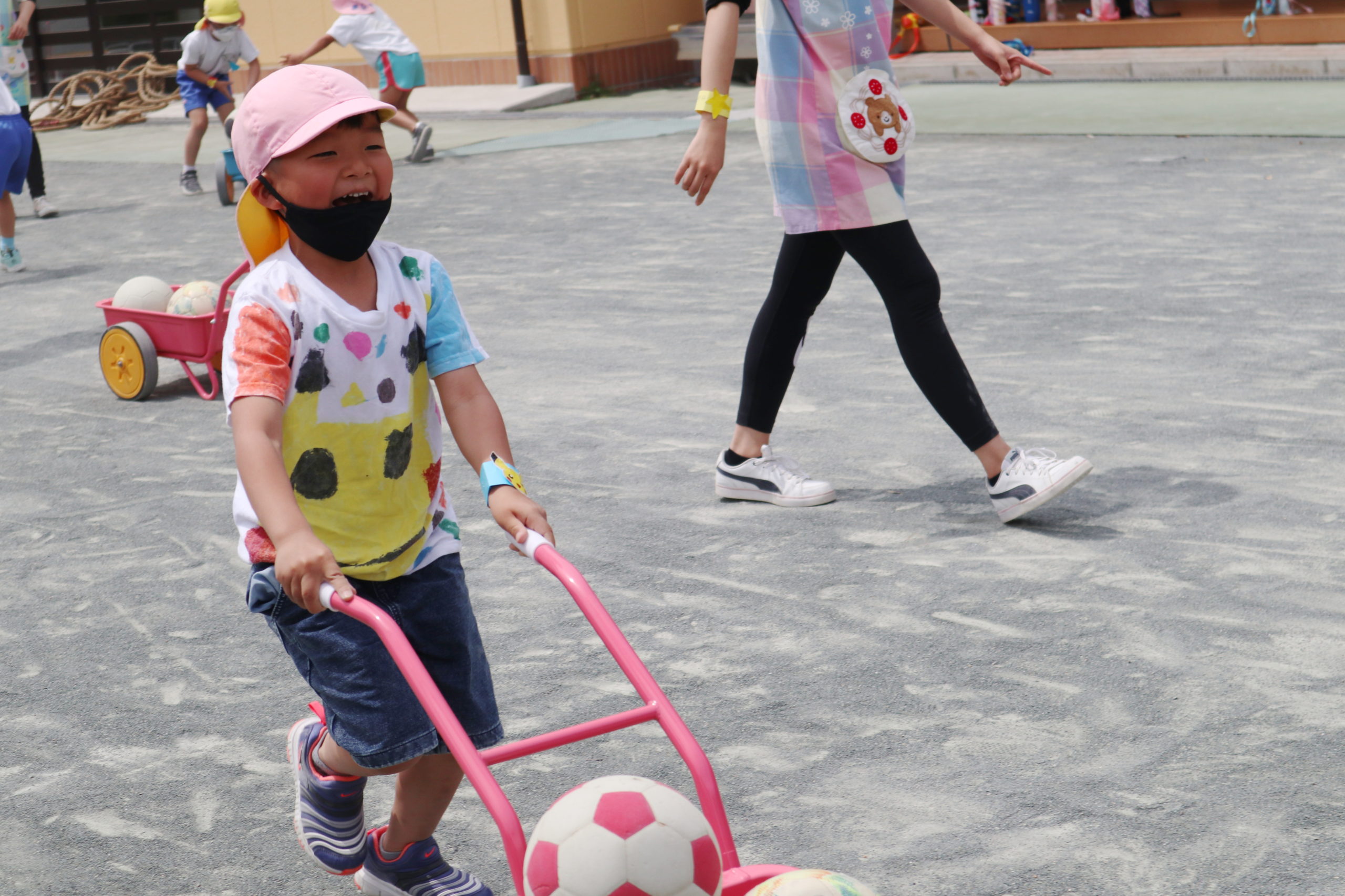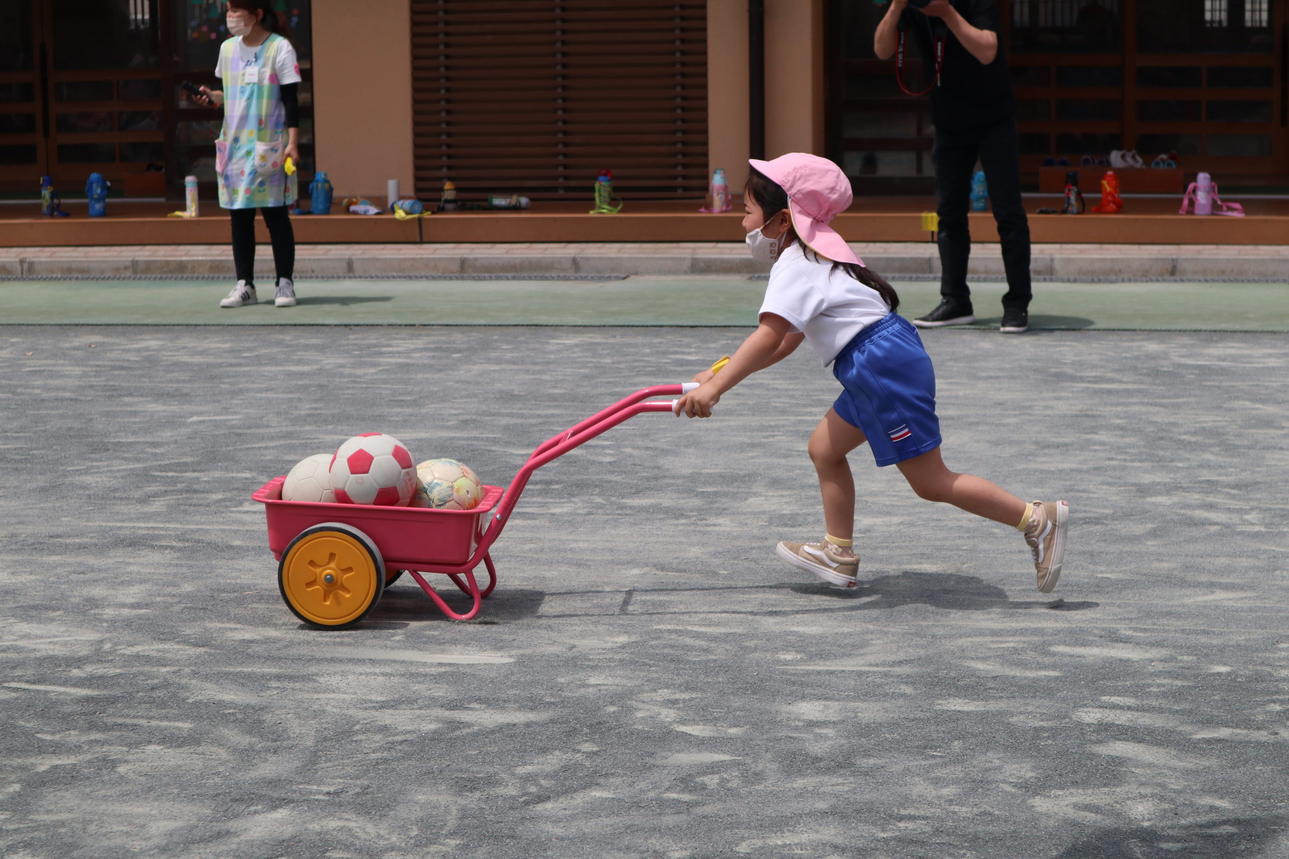 まだまだ続きますよ。今度はボール運びリレー。子どもたち人気のリヤカーでボールを運ぶよ。練習ではボール2つだったのをちょっぴり難しくしてもう一つボールを加えましたよ。その調子その調子。うまくバランスを取りながら駆けていくよ。ボールが落ちないように傾きを加減しながらスピードアップ! おっとっとボールが落ちる!?待て待てーとボールを懸命に追いかけます。