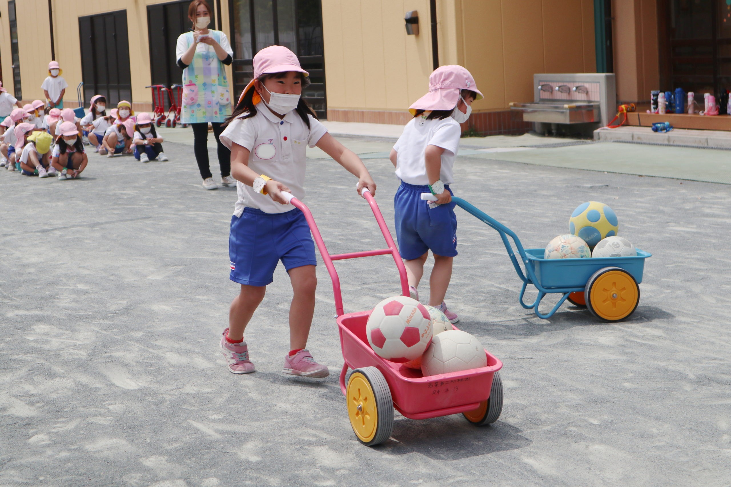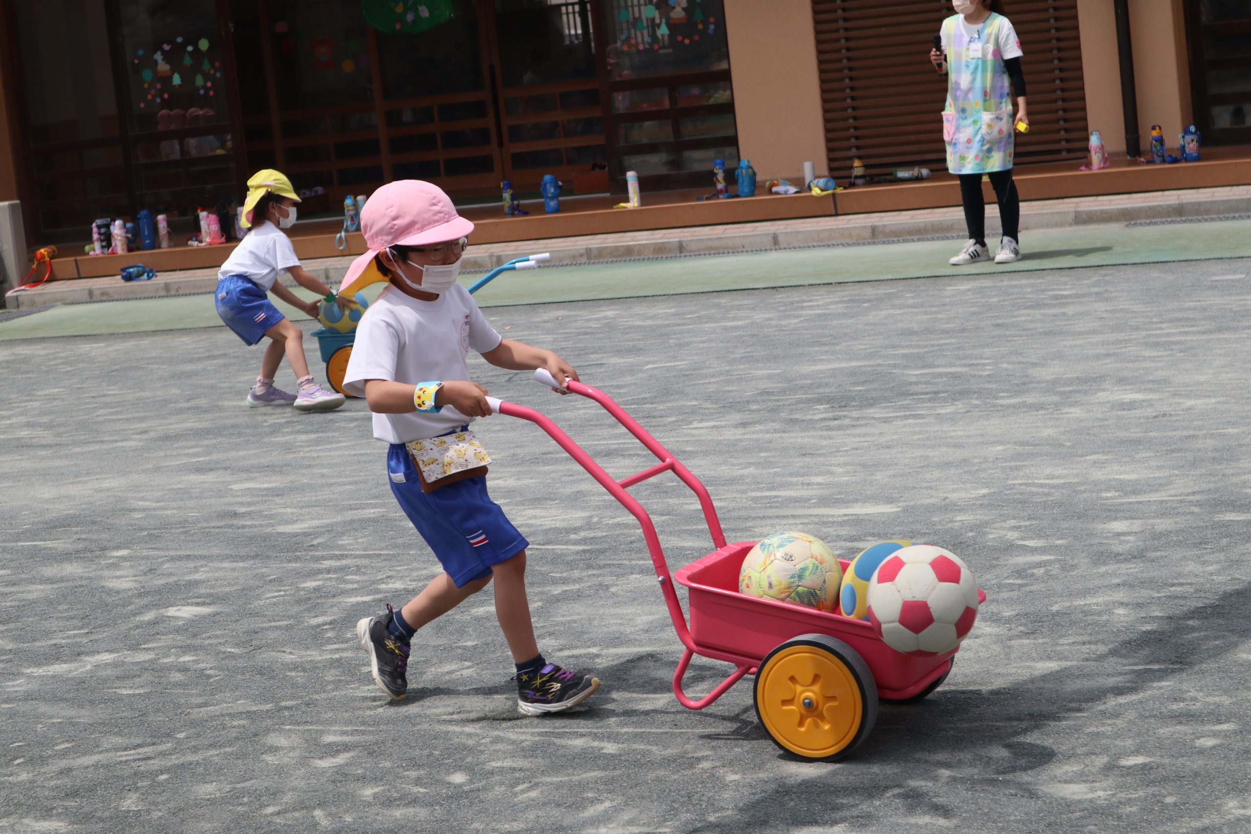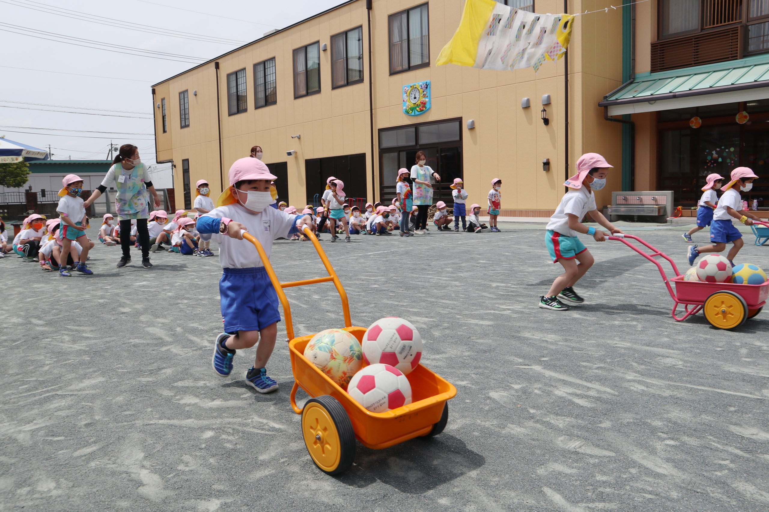 まだまだ続きますよ。今度はボール運びリレー。子どもたち人気のリヤカーでボールを運ぶよ。練習ではボール2つだったのをちょっぴり難しくしてもう一つボールを加えましたよ。その調子その調子。うまくバランスを取りながら駆けていくよ。ボールが落ちないように傾きを加減しながらスピードアップ! おっとっとボールが落ちる!?待て待てーとボールを懸命に追いかけます。