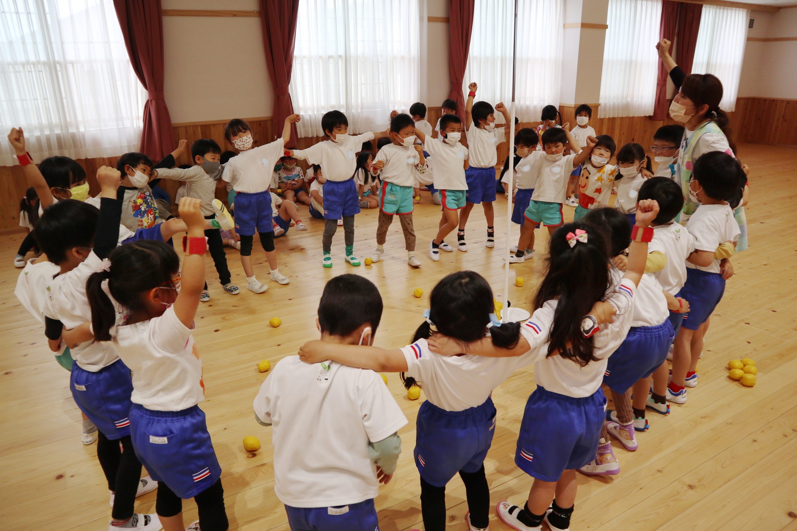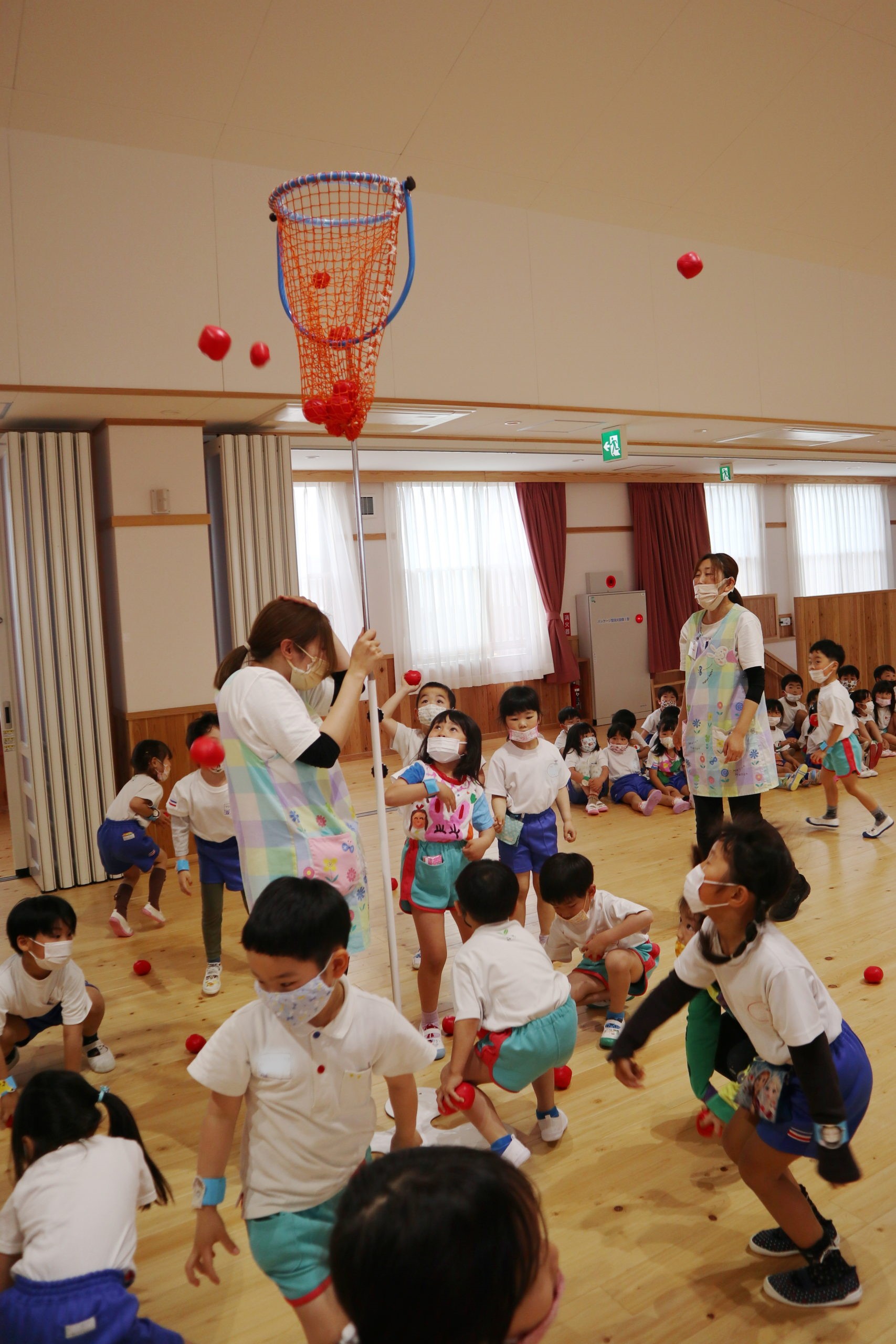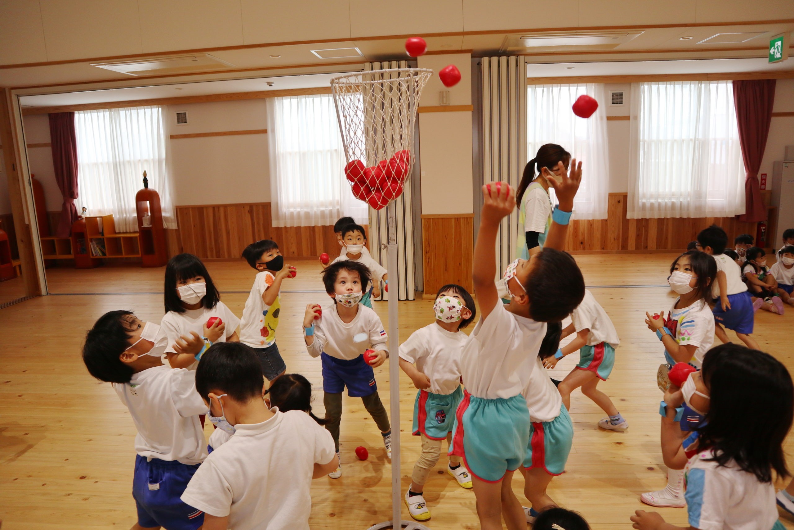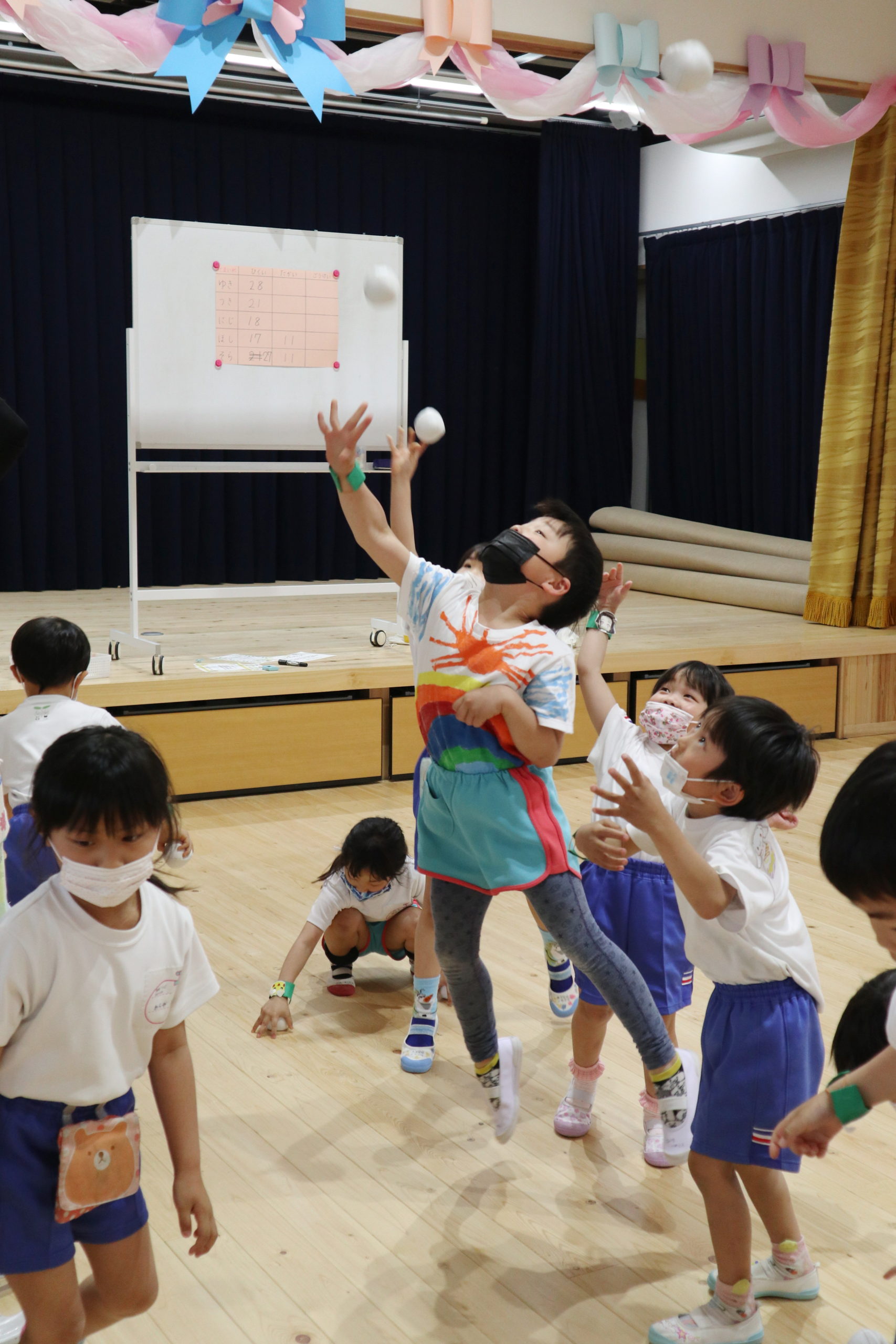 先生の身長と比べてもとても高いですね。こどもたちは後ろに下がって投げてみたり、ジャンプしたりいろいろ工夫して頑張っていましたよ。力強いジャンプショット! かごの高さが低い方と高い方の数を合算していきました。2桁の数でしたが、元気よく答えてくれたおともだちがたくさんいて先生たちもびっくりしましたよ。「ゆきぐみとそらぐみが38個で同点だね。どうやって一位を決める?」とりえ先生が話すと、