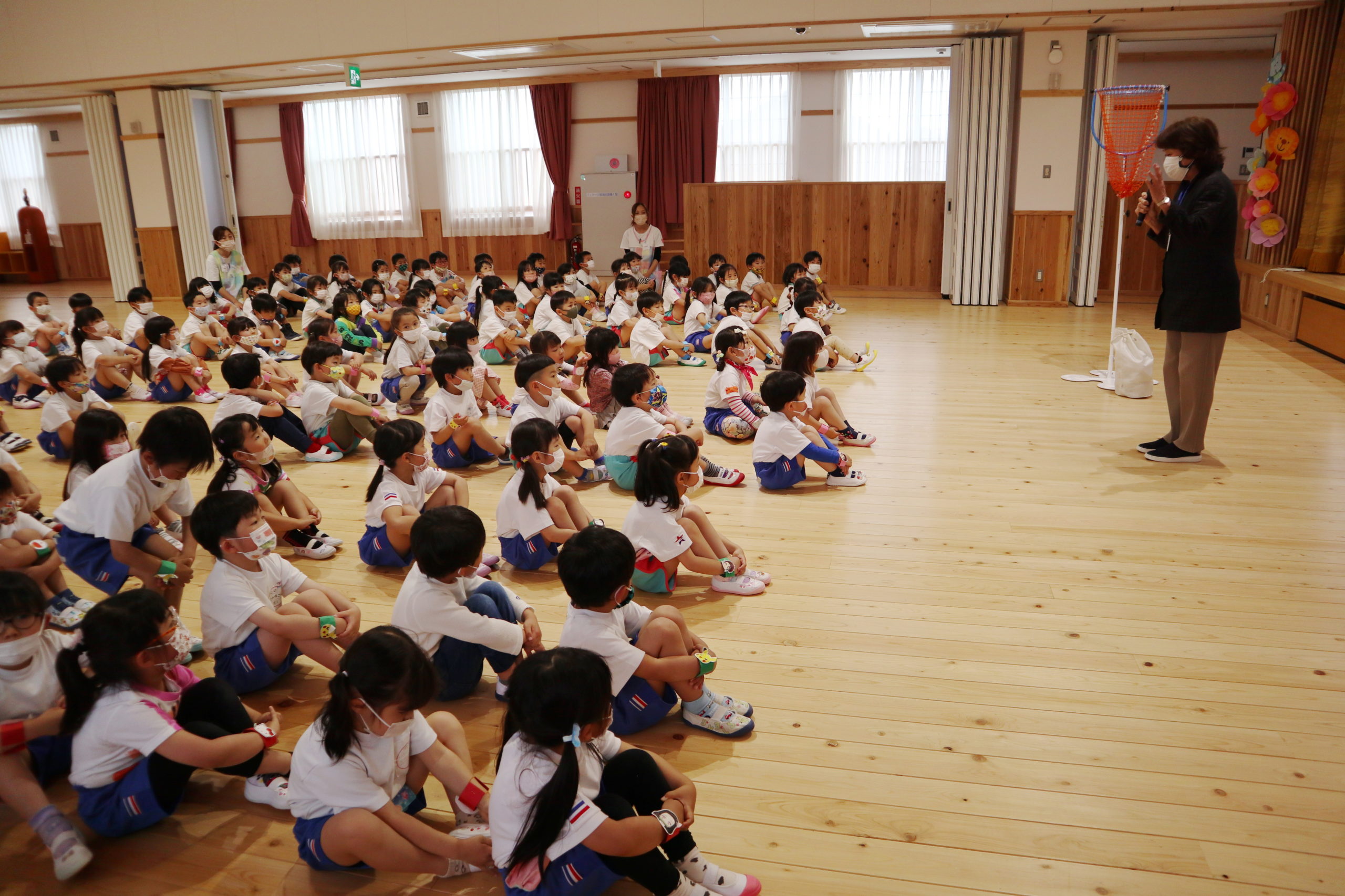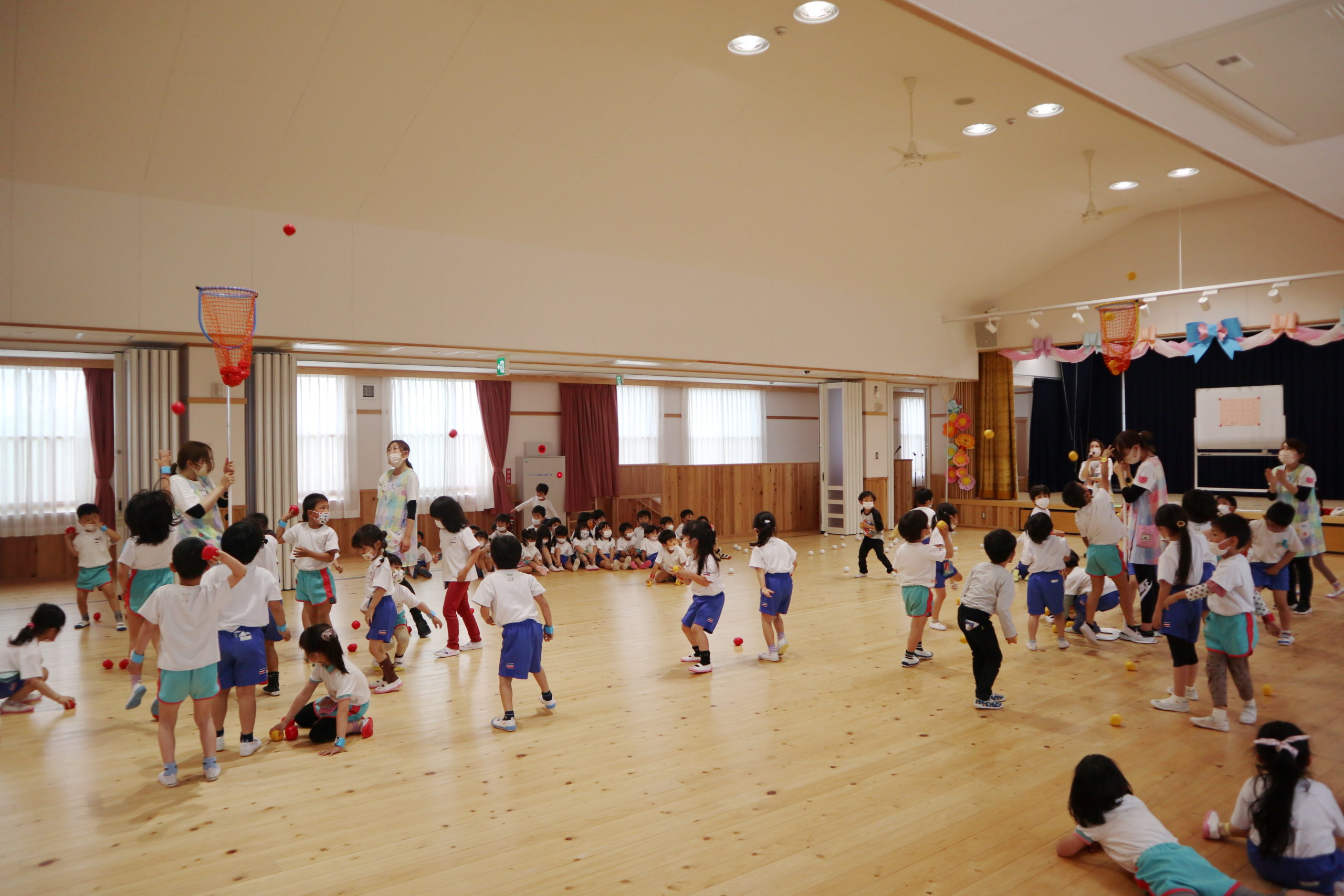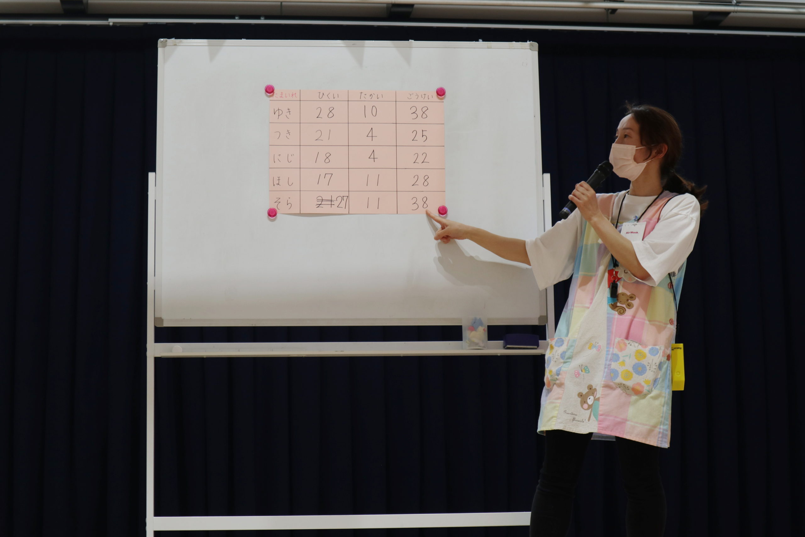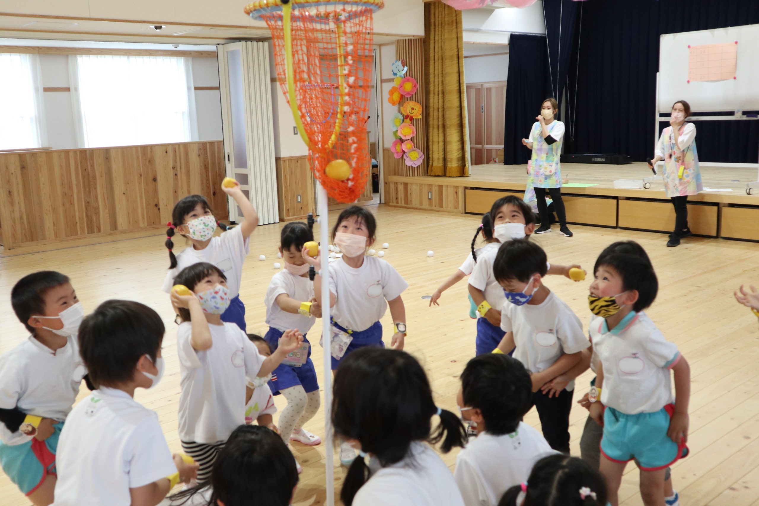 先生の身長と比べてもとても高いですね。こどもたちは後ろに下がって投げてみたり、ジャンプしたりいろいろ工夫して頑張っていましたよ。力強いジャンプショット! かごの高さが低い方と高い方の数を合算していきました。2桁の数でしたが、元気よく答えてくれたおともだちがたくさんいて先生たちもびっくりしましたよ。「ゆきぐみとそらぐみが38個で同点だね。どうやって一位を決める?」とりえ先生が話すと、