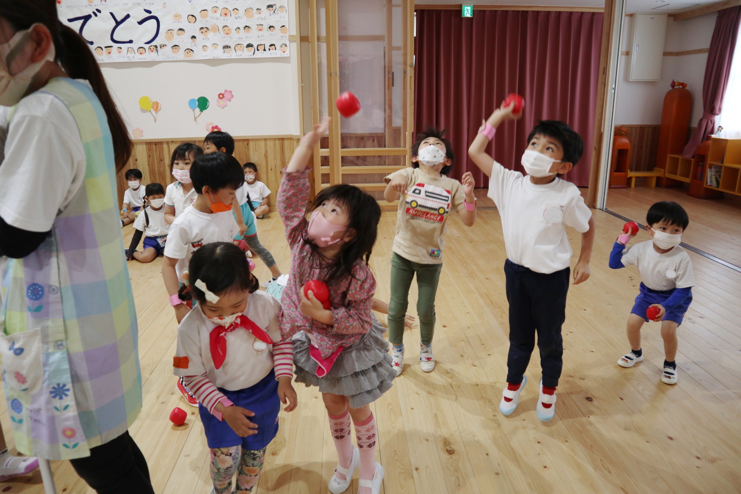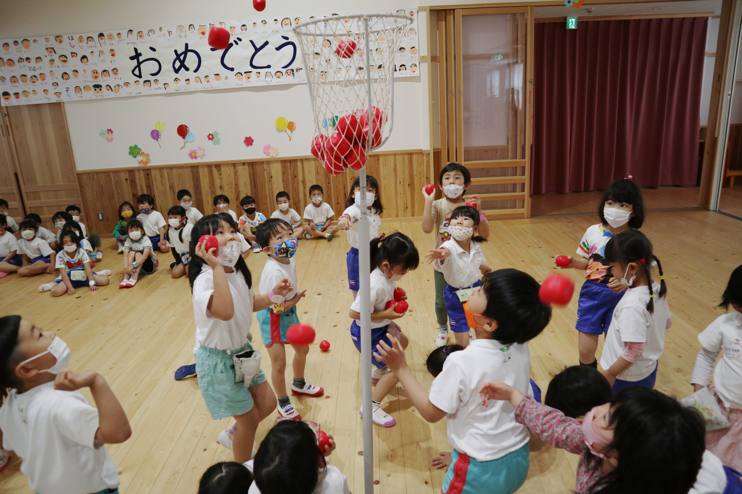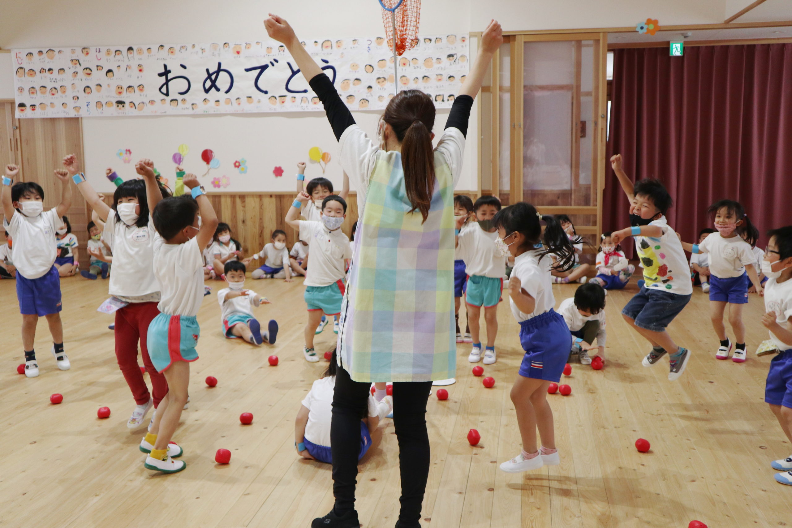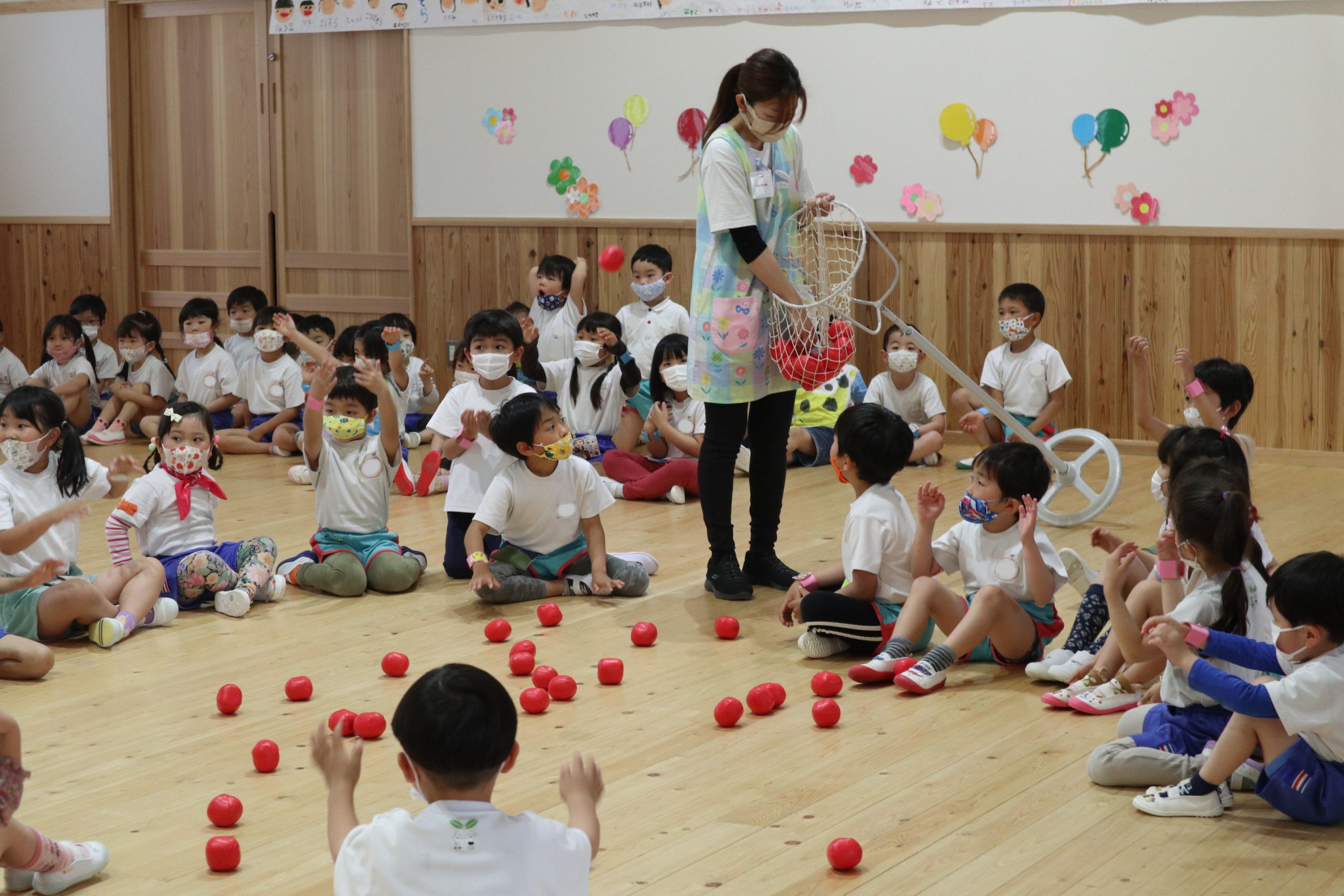 先生の身長と比べてもとても高いですね。こどもたちは後ろに下がって投げてみたり、ジャンプしたりいろいろ工夫して頑張っていましたよ。力強いジャンプショット! かごの高さが低い方と高い方の数を合算していきました。2桁の数でしたが、元気よく答えてくれたおともだちがたくさんいて先生たちもびっくりしましたよ。「ゆきぐみとそらぐみが38個で同点だね。どうやって一位を決める?」とりえ先生が話すと、