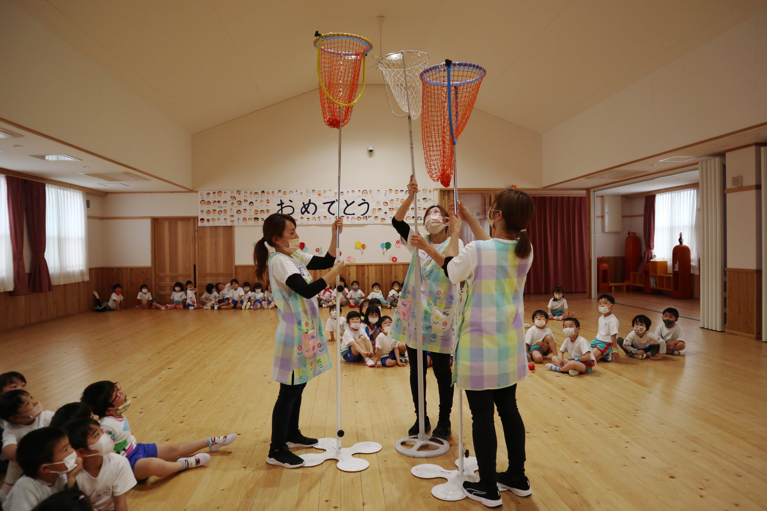 よし君が「それじゃあ、ゆきぐみとそらぐみで決勝戦をしよう!」と提案しました。円陣を組んで心を一つにして臨むゆき組さん。がーんばれ!がーんばれ! 玉入れを制したのはそらぐみさん。おめでとう!