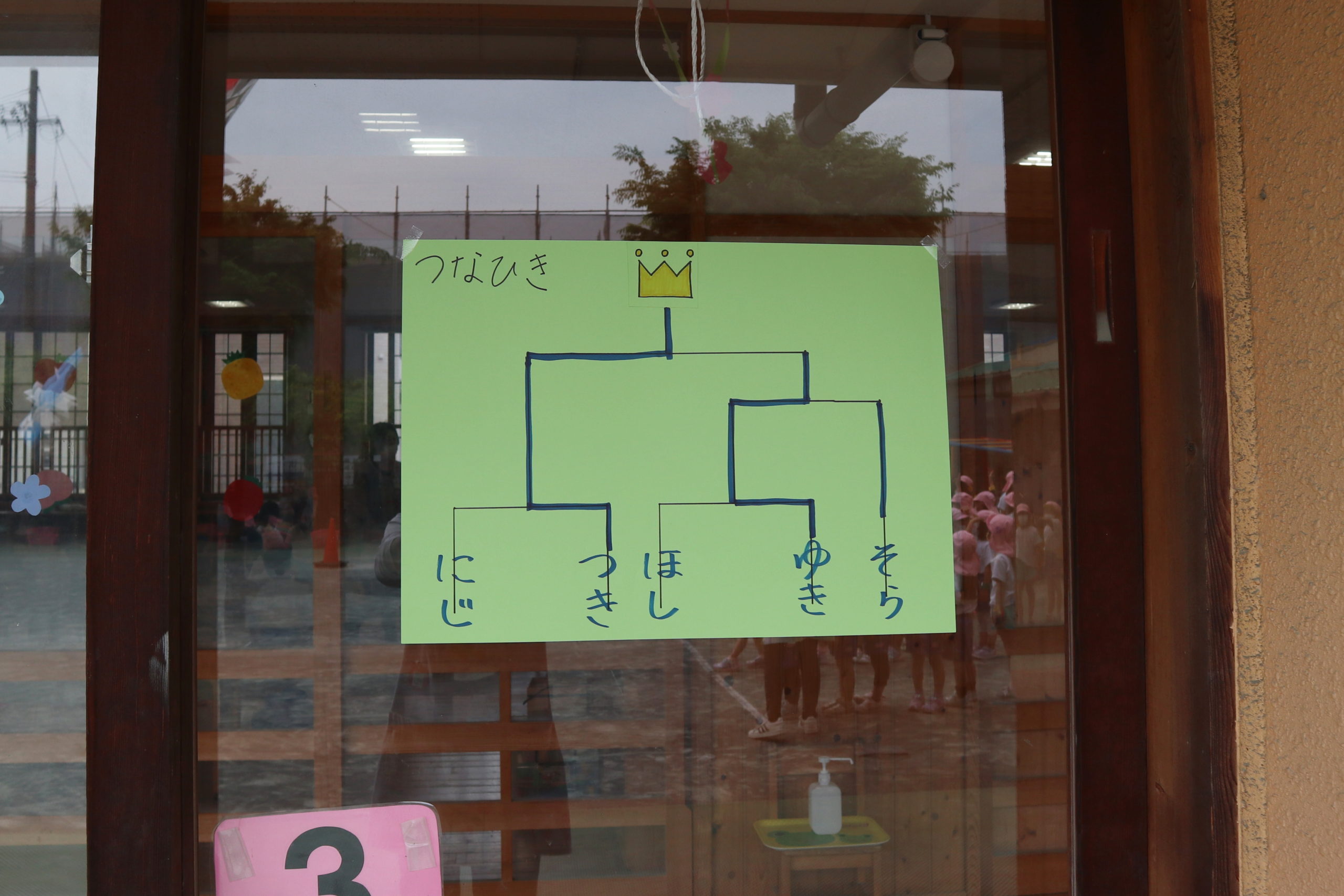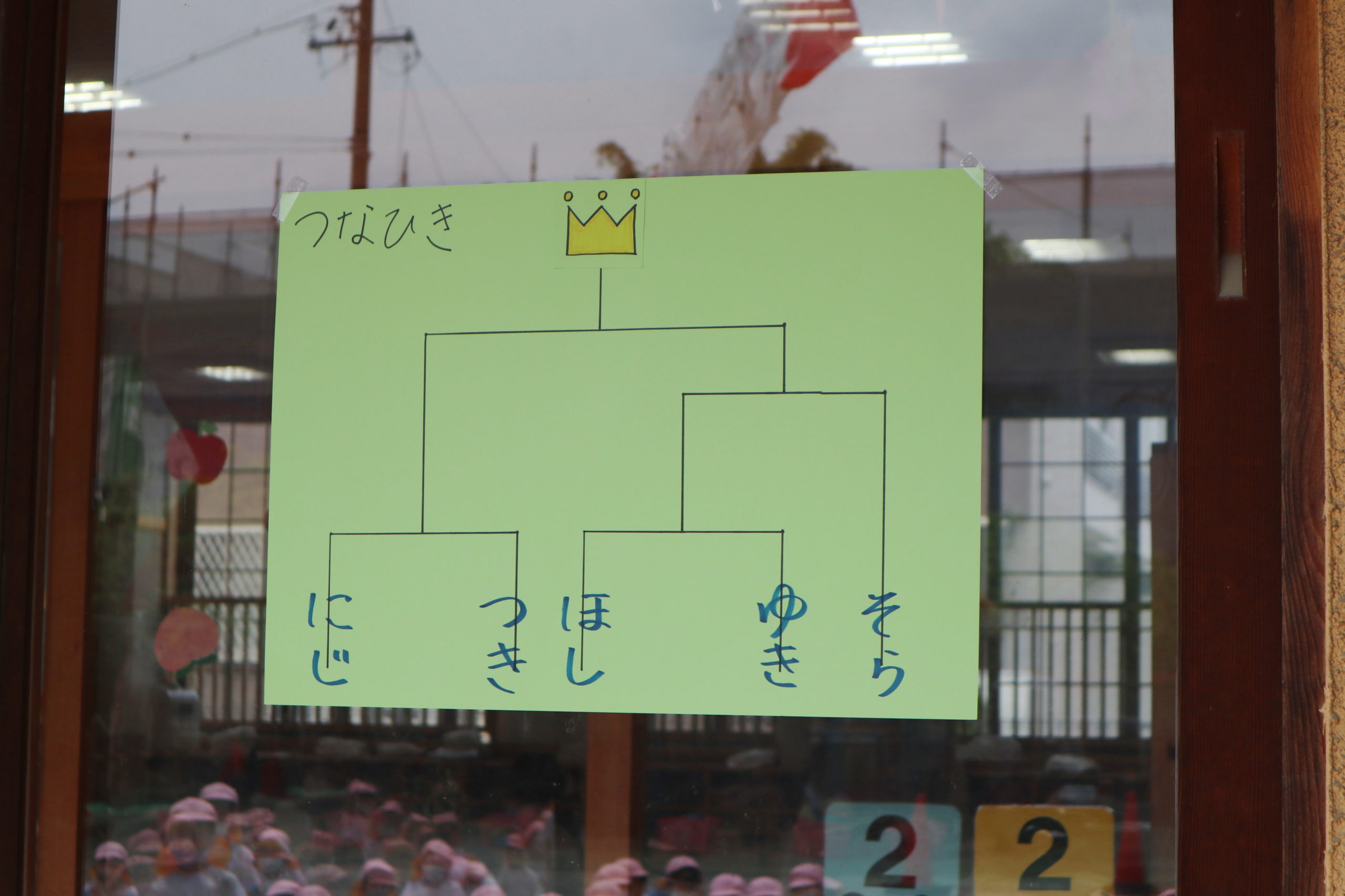 りえ先生も「1位だよ!みんなよく頑張ったね!」と喜びました。先日の練習ではつき組さんは負けて悔しかったそう。そこでタオルを縄替わりにして引っ張りっこして遊んだよと教えてくれました。お休みの間もお家の人とタオル引きをして本番に臨んだつき組さん。とても嬉しいね。やったーの気持ちをみんなで分かち合ったね。