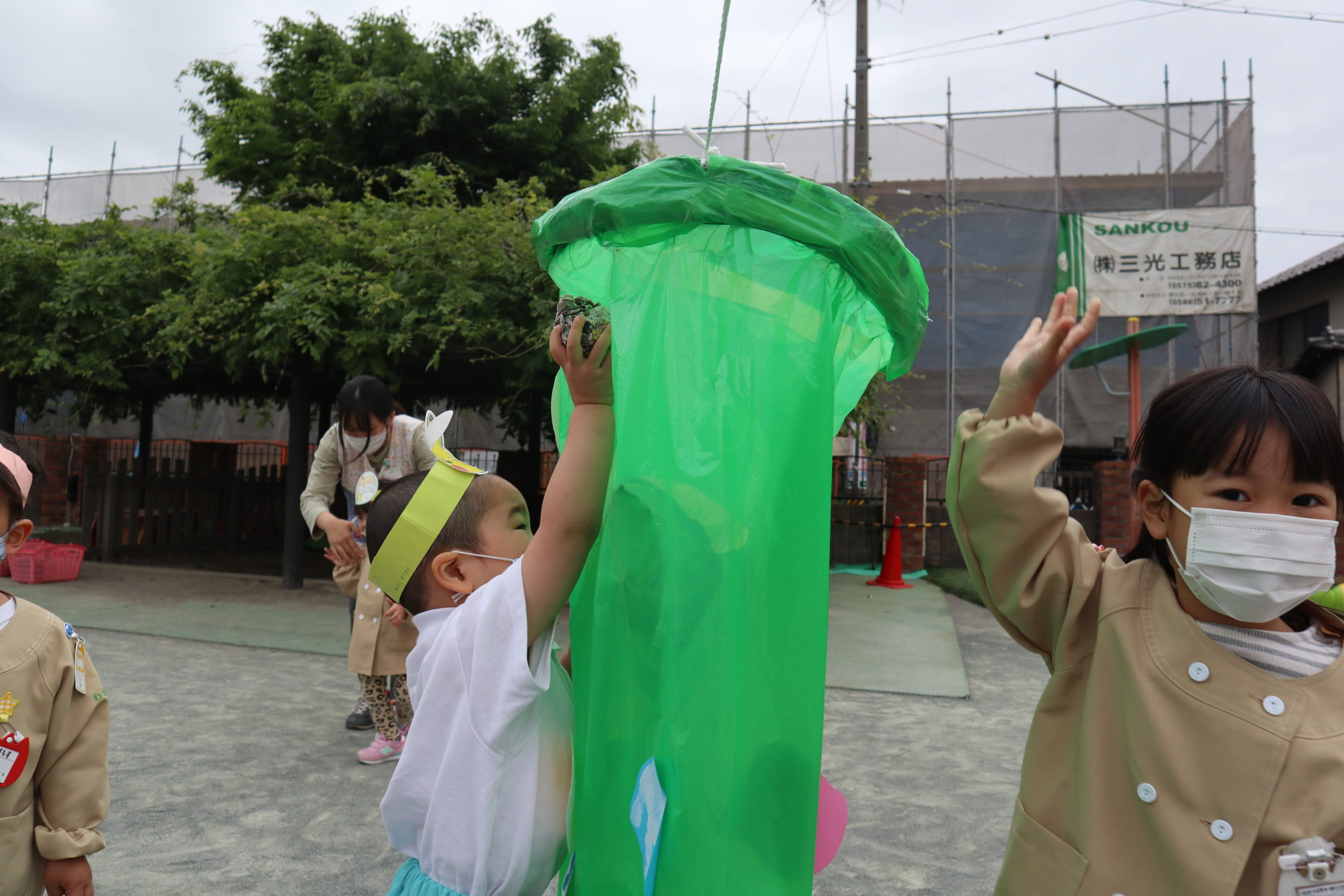 「やった!やったあ!こいのぼりつかまえたよ!」うれしいね。