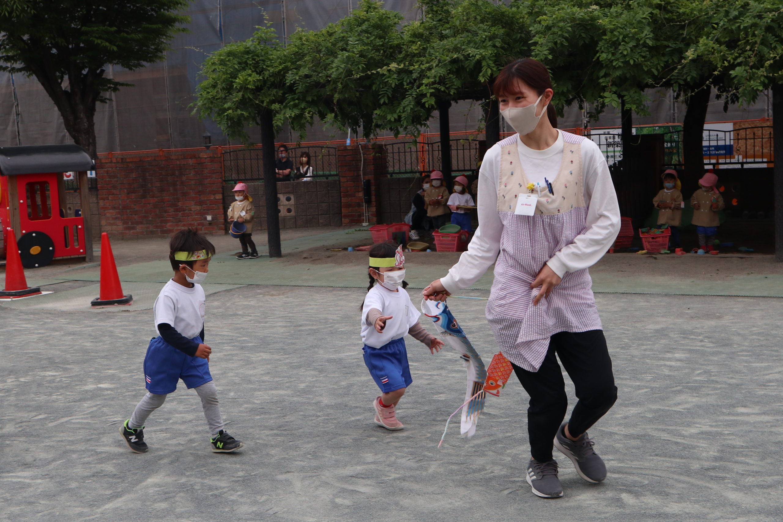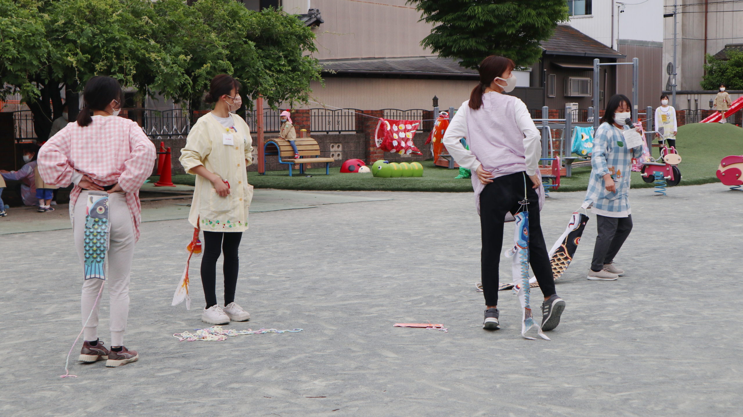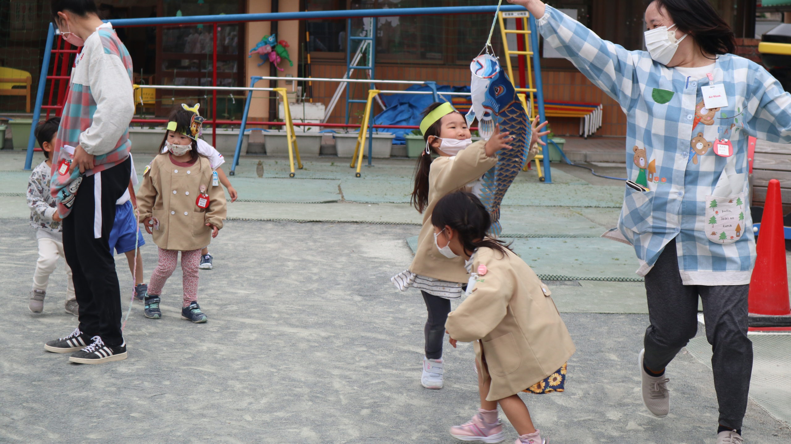 まなみ先生、ちょっぴり苦しそう。こいのぼりキッズのパワーには先生たちかなわないね。