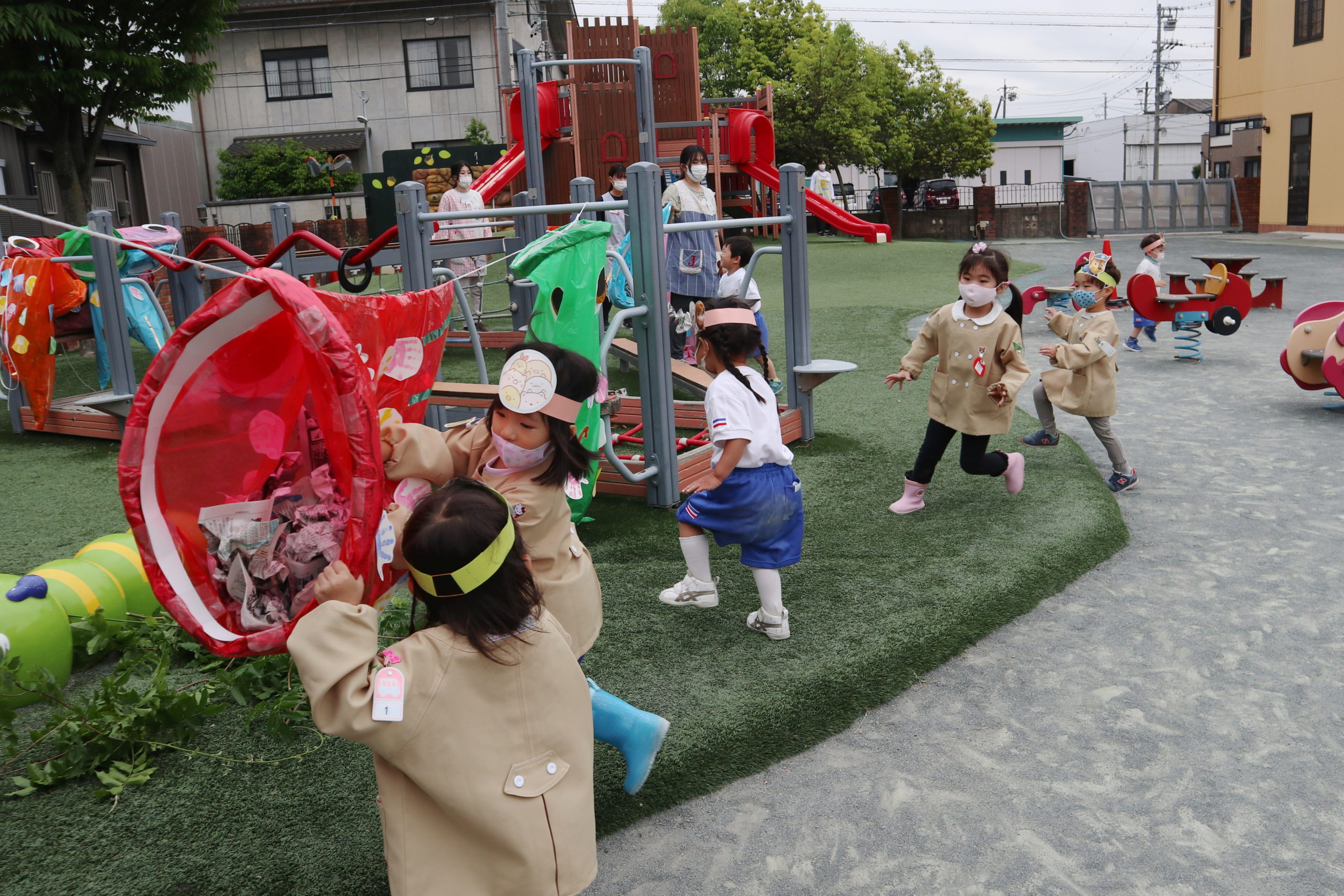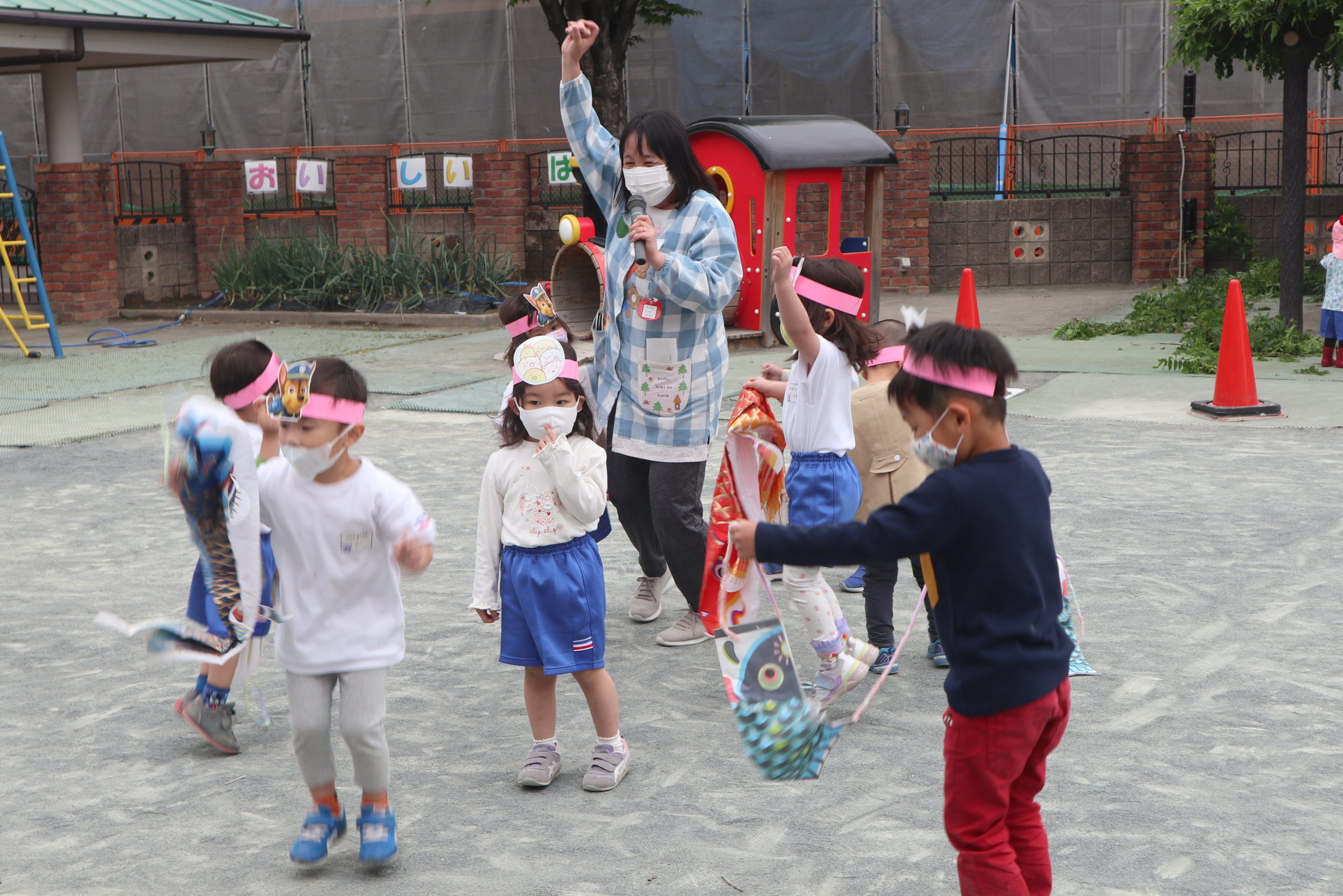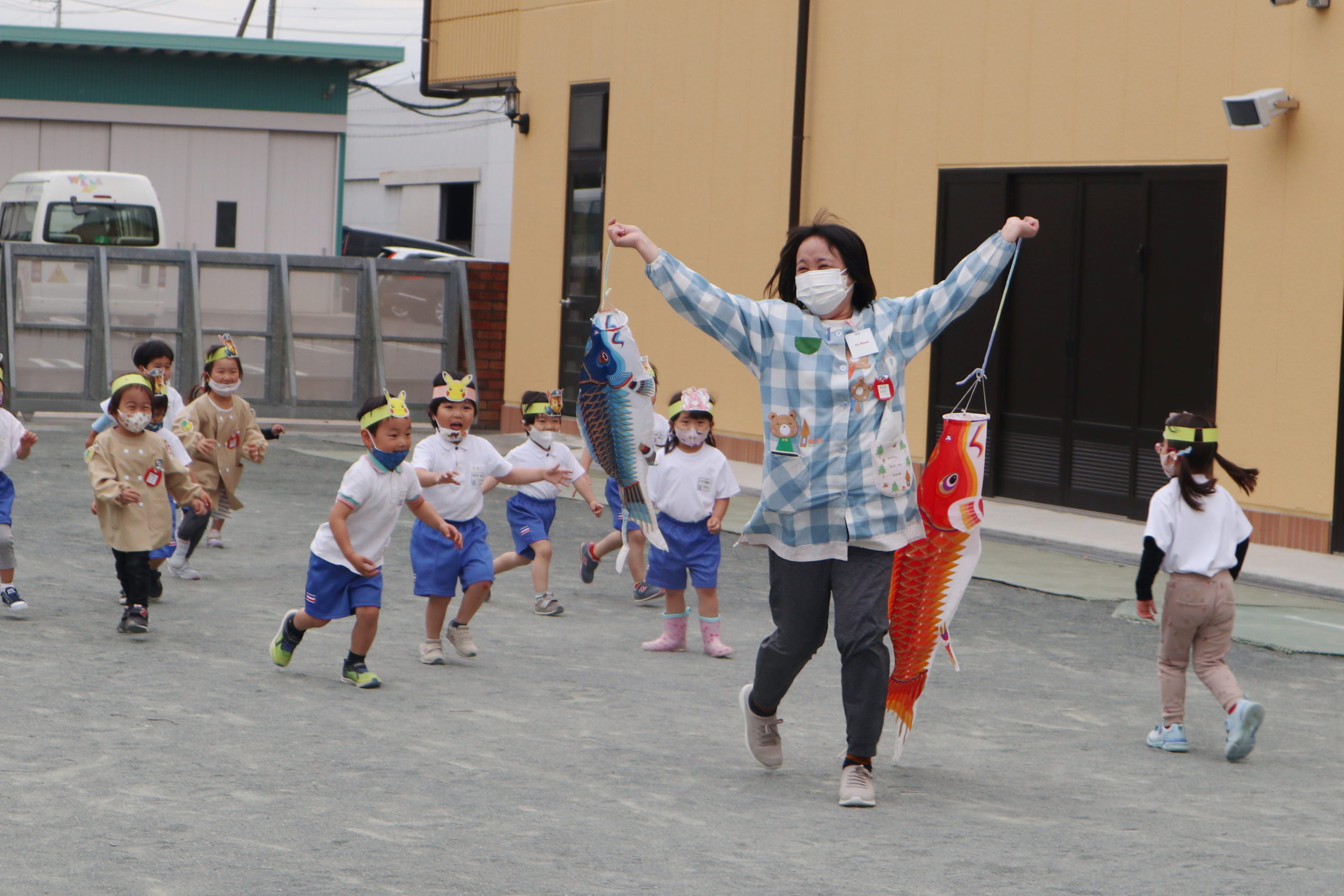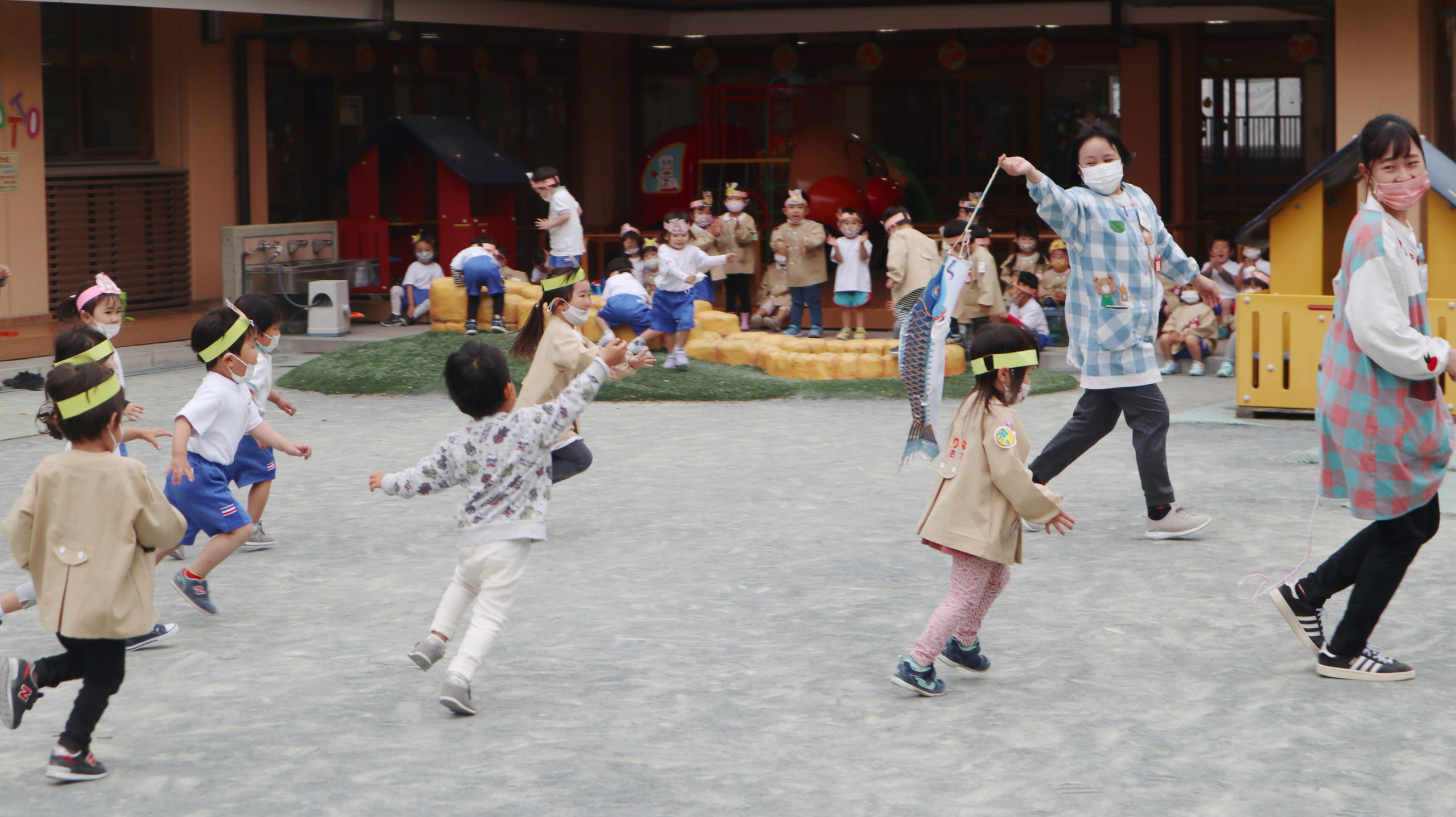 まなみ先生、ちょっぴり苦しそう。こいのぼりキッズのパワーには先生たちかなわないね。