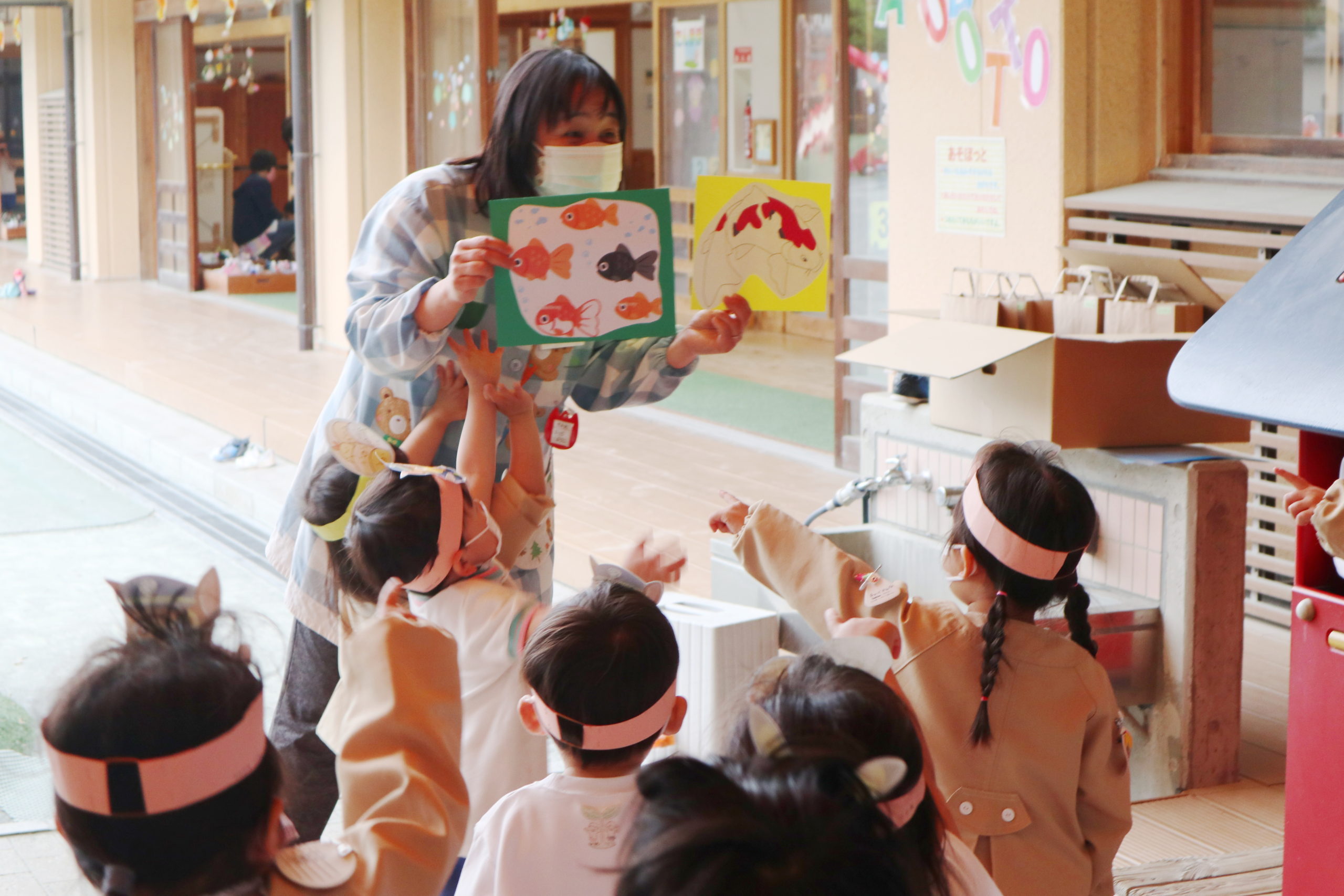 お魚の鯉はどちらかな?「こっちは金魚だよね。幼稚園にもいるよ。」とお話してくれた子もいました。