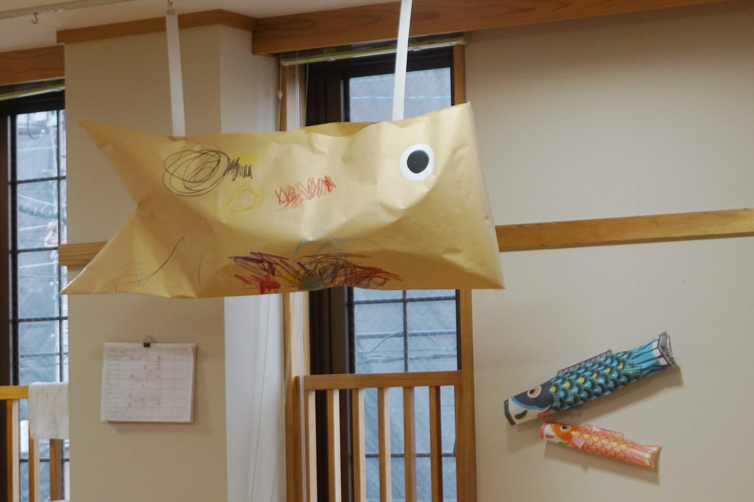 ちゅうりっぷのこどもたちがぐるぐる模様を描いたこいのぼりがみんなのことを見守っているよ。