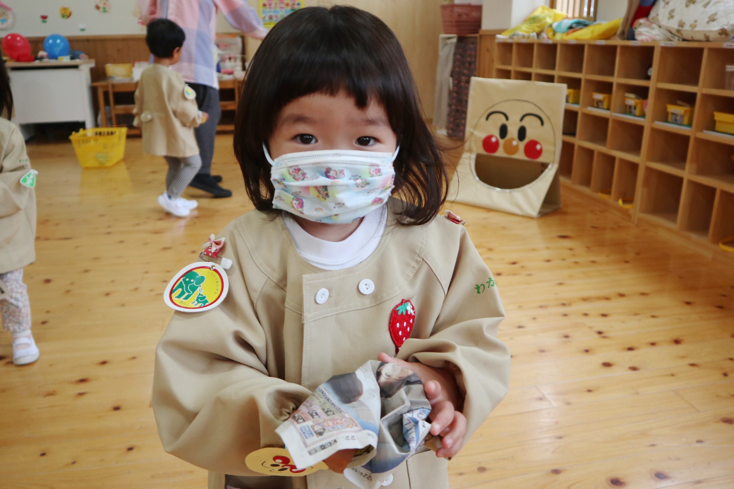 新聞をぐしゃぐしゃぐしゃ。みんなが大好きなアンパンマンのまほうのちからのリストバンドがついているね。