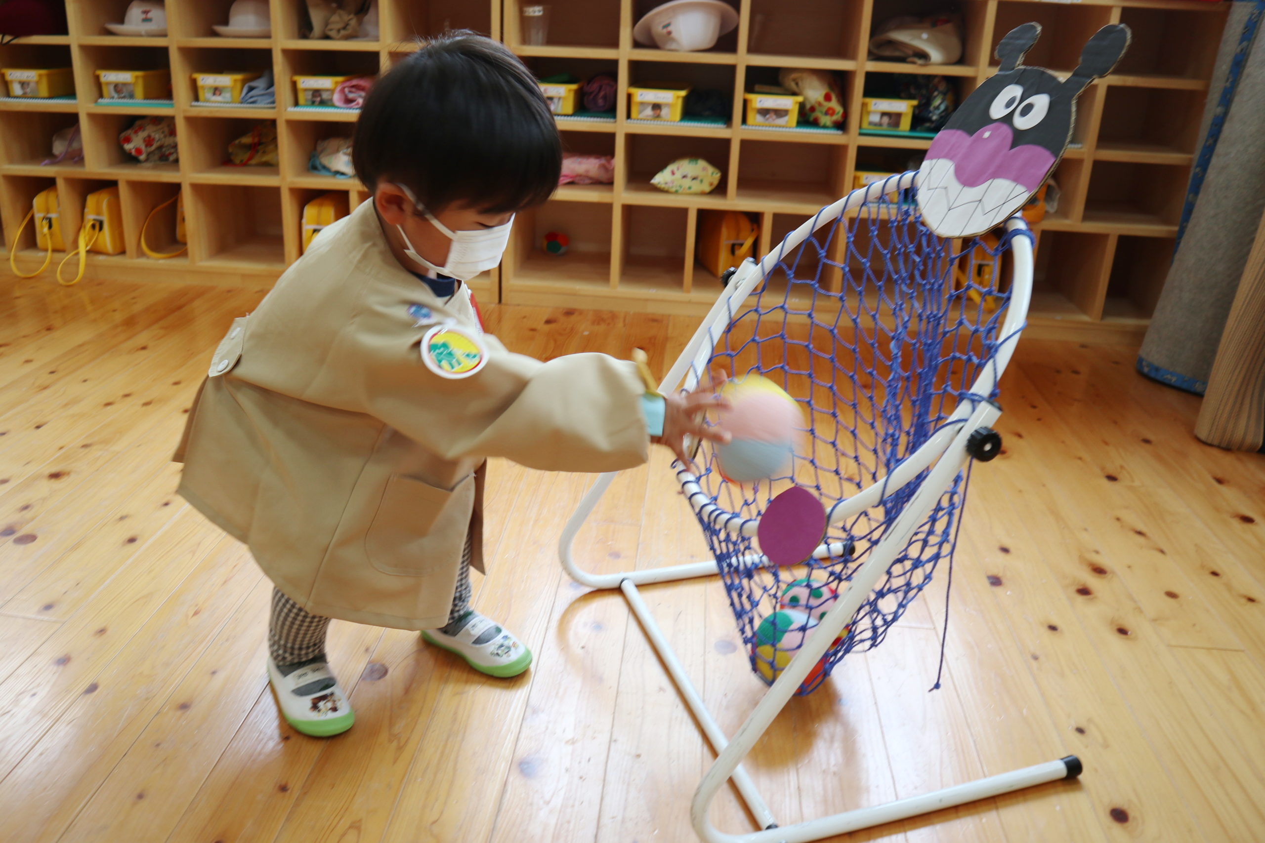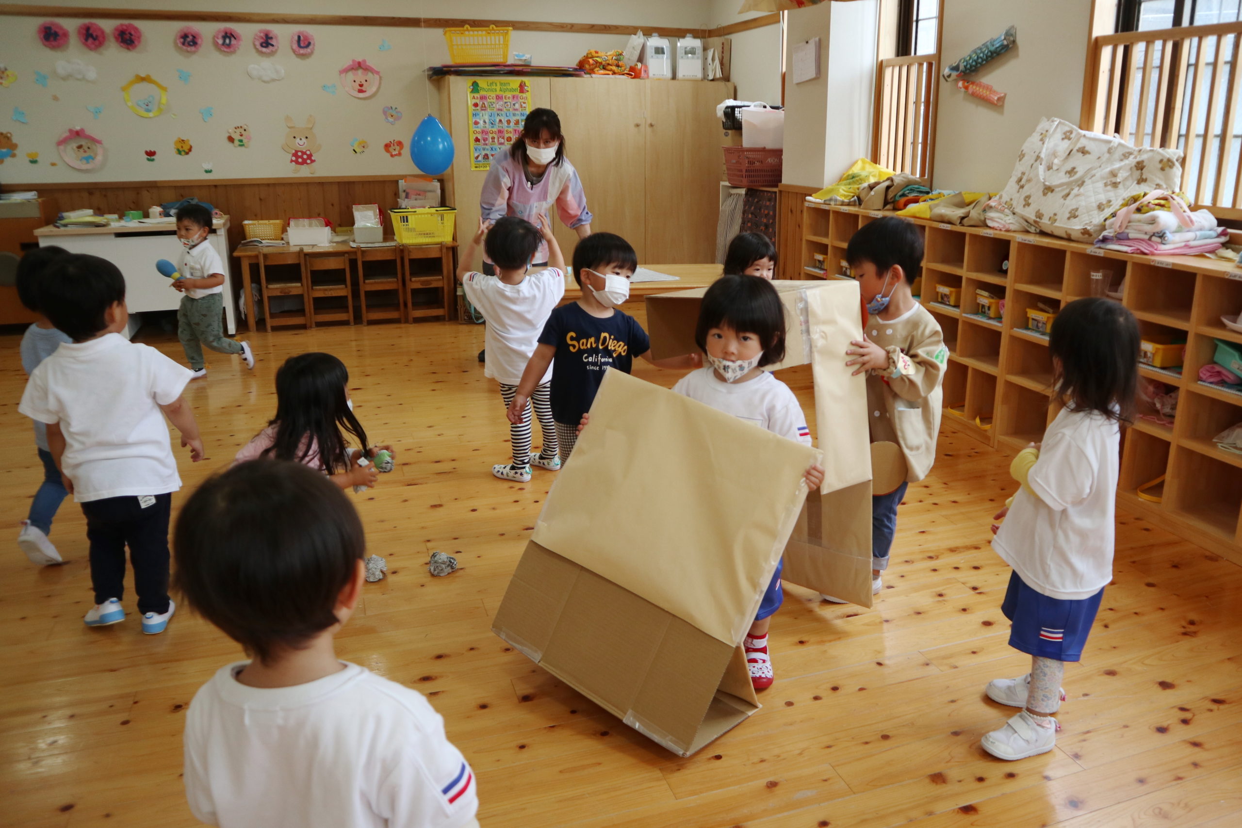 好きなところを見つけて玉入れしたり、風船にタッチしたり楽しく遊べたね。始めはじっと見ていた友達もやってみようと行動に移したり、楽しそうな友達の真似をしたりおもしろくなってきたね。そんなみんなの姿を見ていてとてもうれしかったよ。