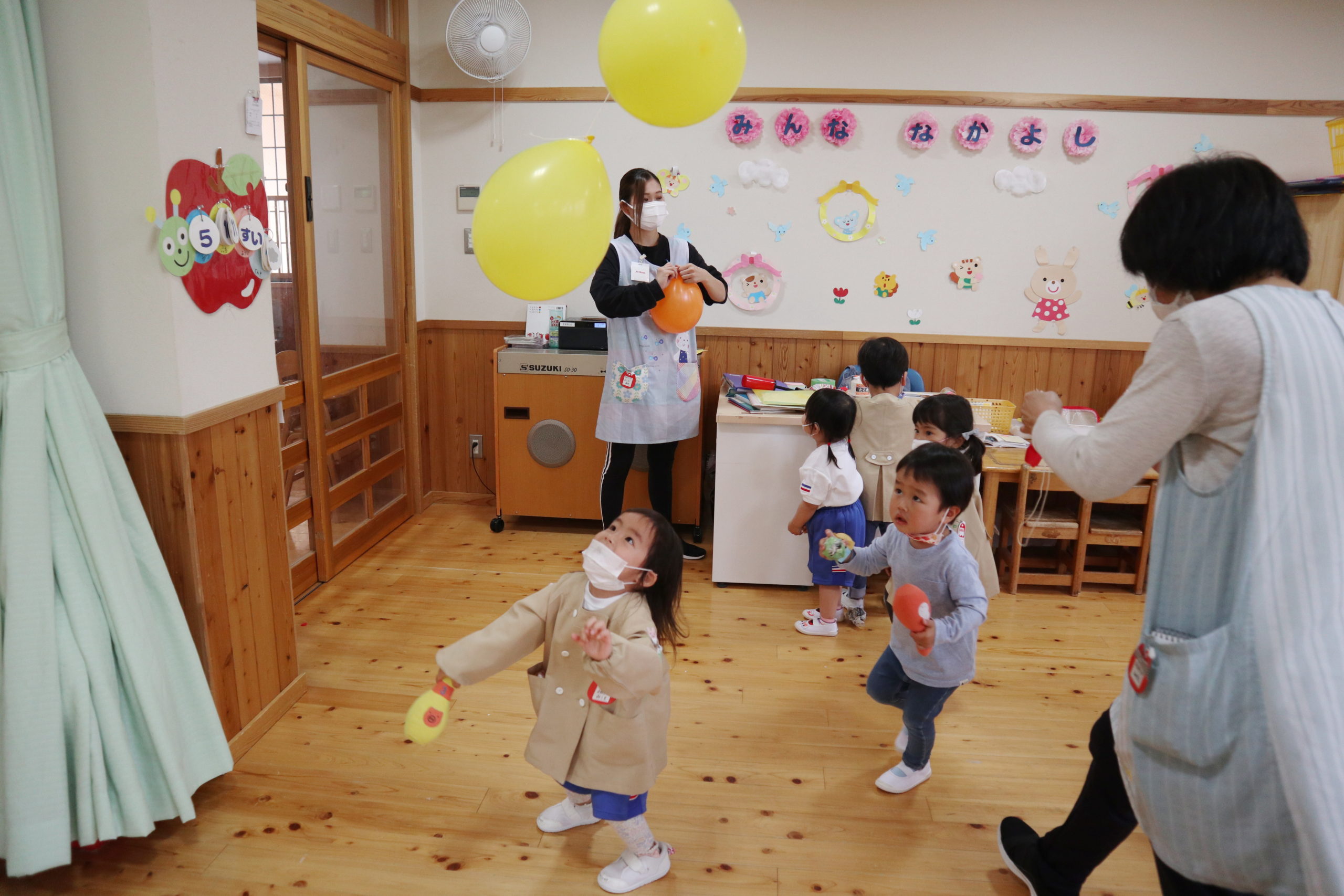 「赤い風船に当てられるかな?頑張って!」とめぐみ先生も友達も応援しているよ。