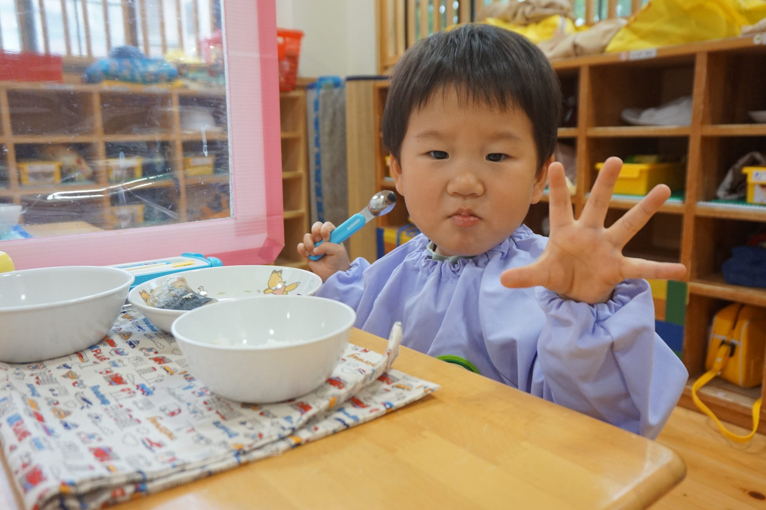 ちょっぴりママが恋しい時があるけれど、ママさん先生とスキンシップをとりながら幼稚園で生活しています。
