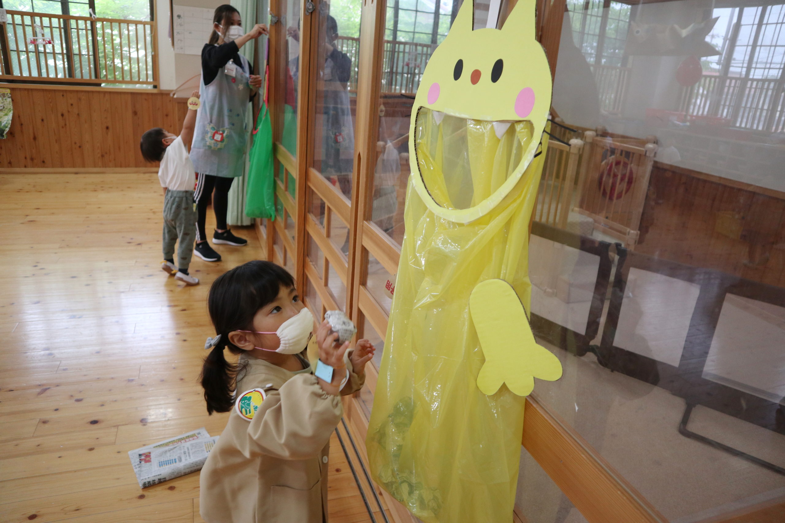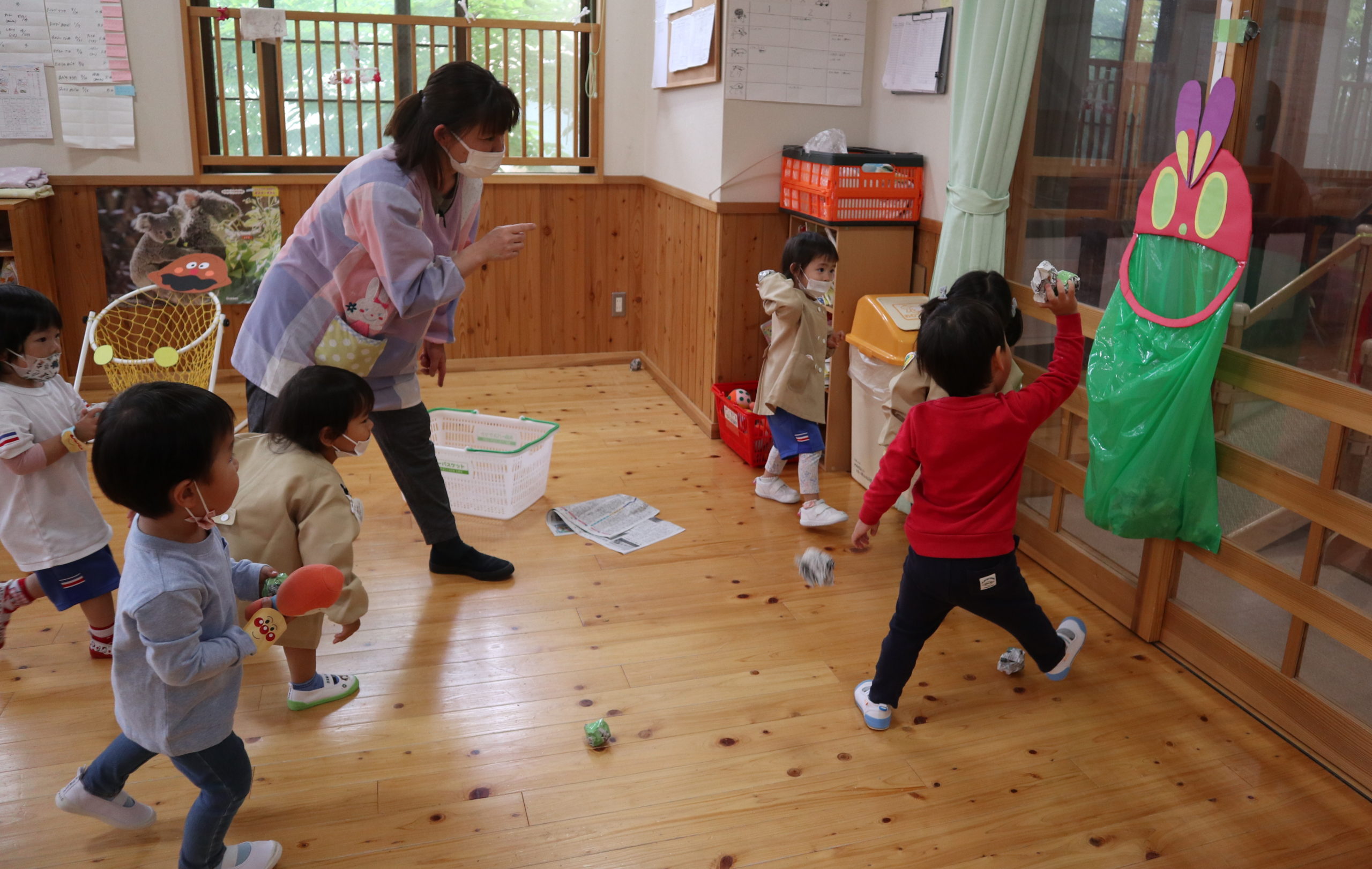 こいのぼりがご飯をどんどん食べて大きくなあれという絵本を読んでもらって、玉入れあそびが始まりました。