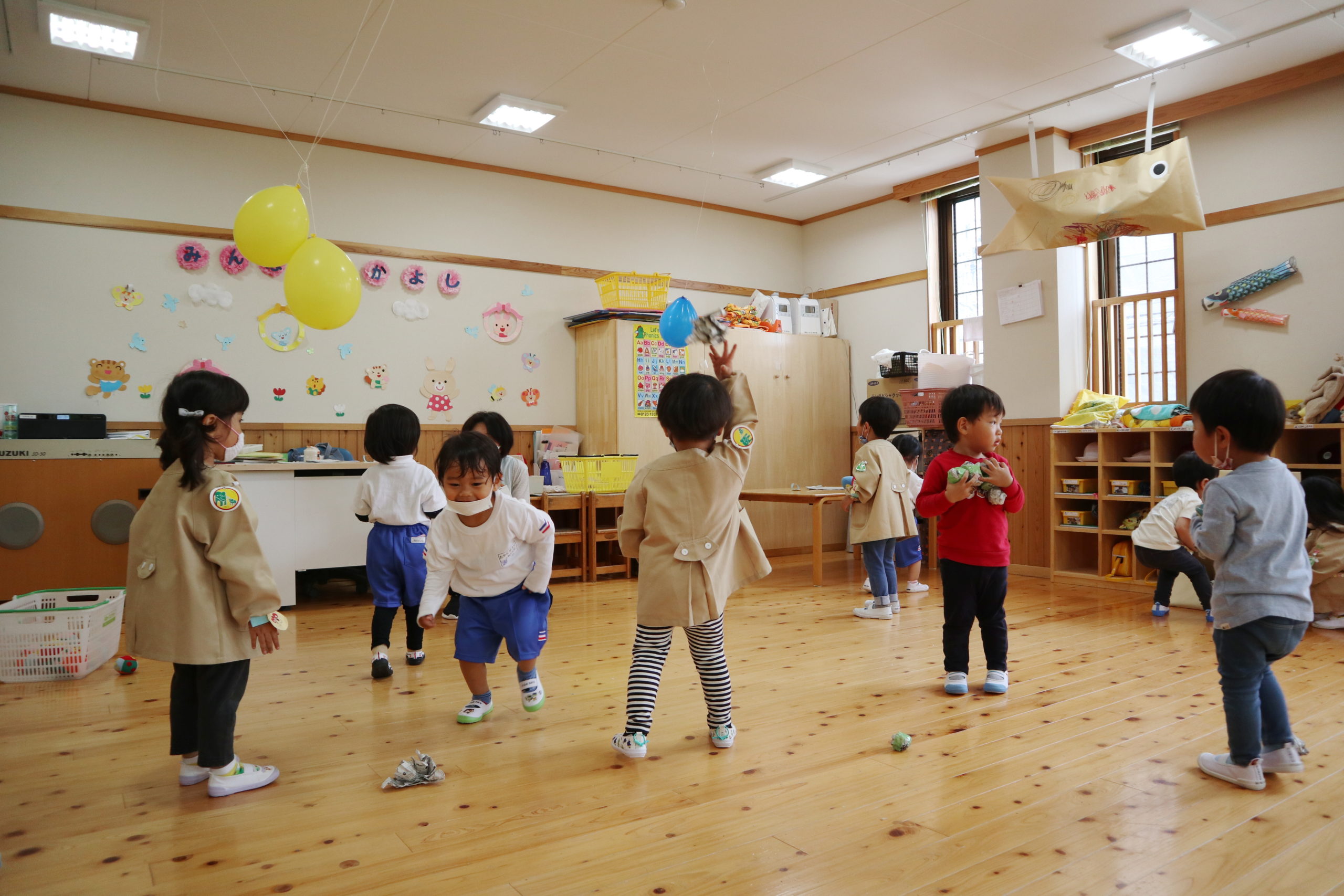 『こいのぼりきっず』の音楽が鳴ると笑顔でダンスするおともだち。こいのぼりさんがすいすい泳いでいるみたいだね。