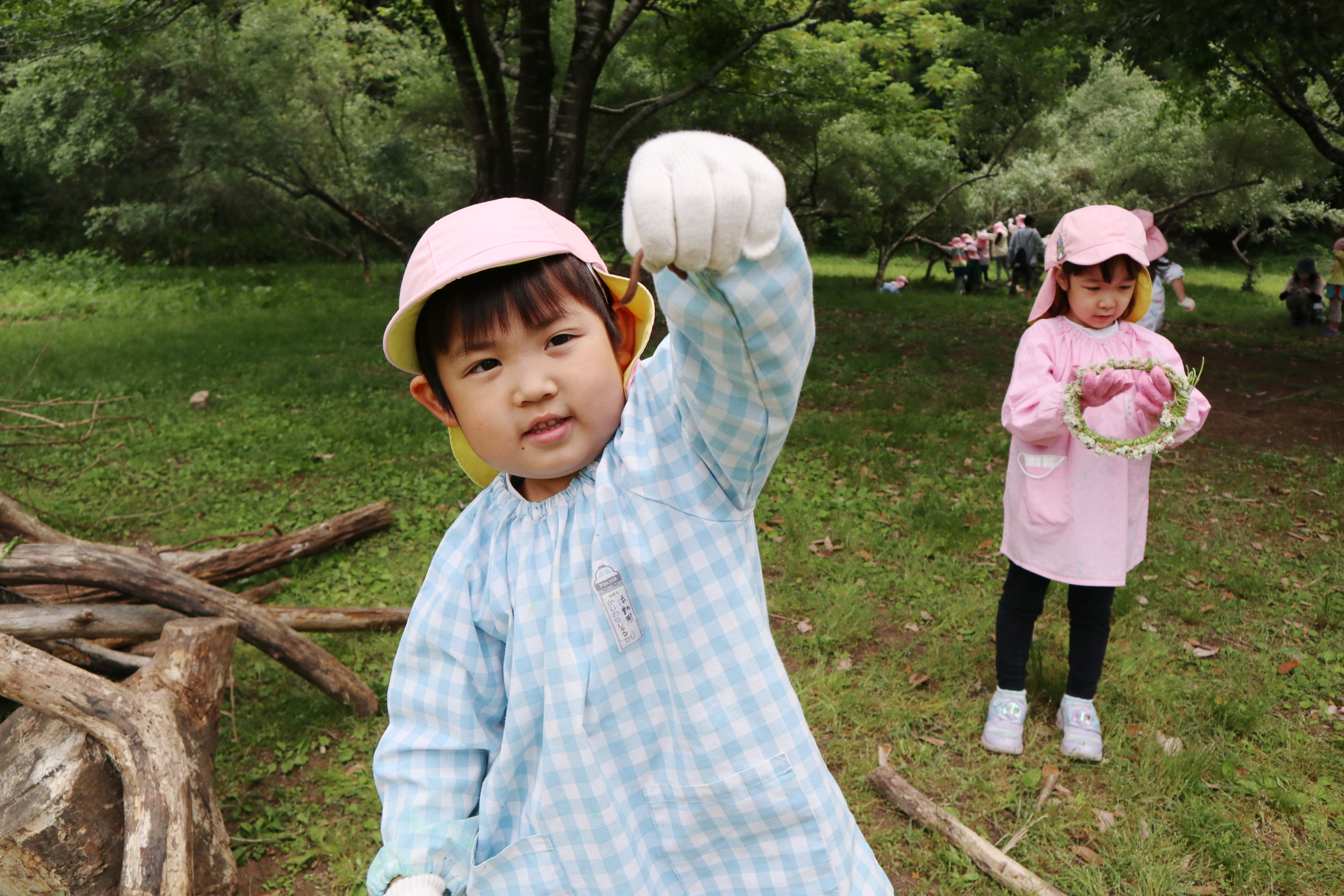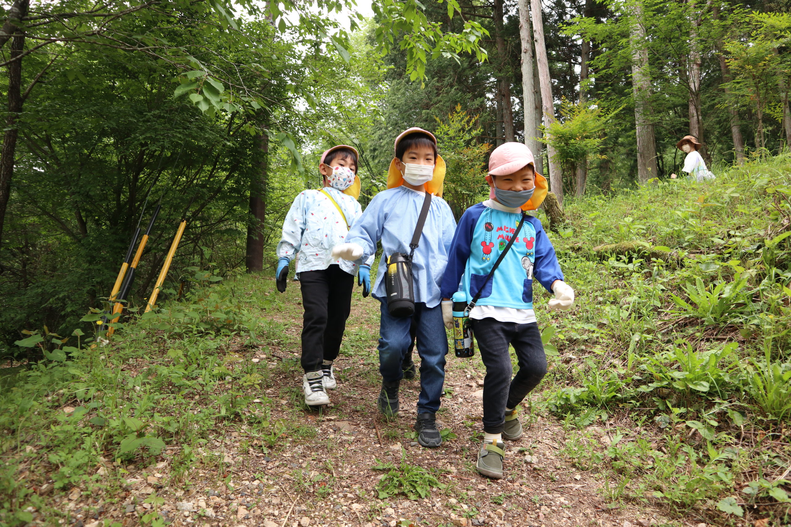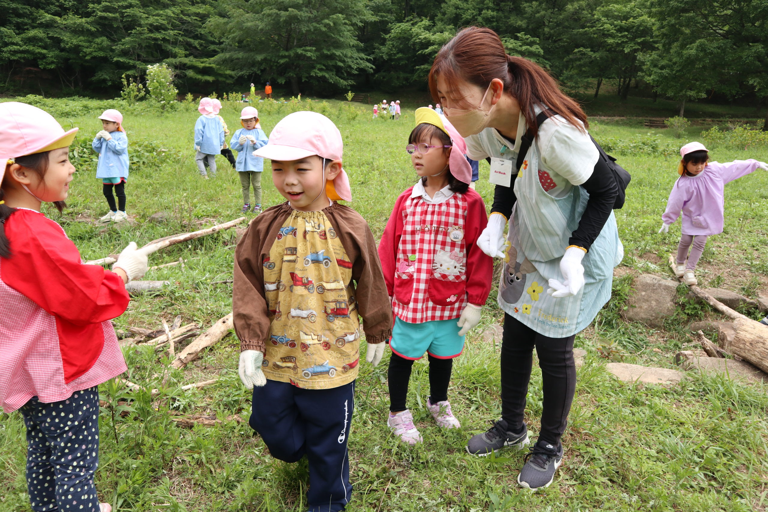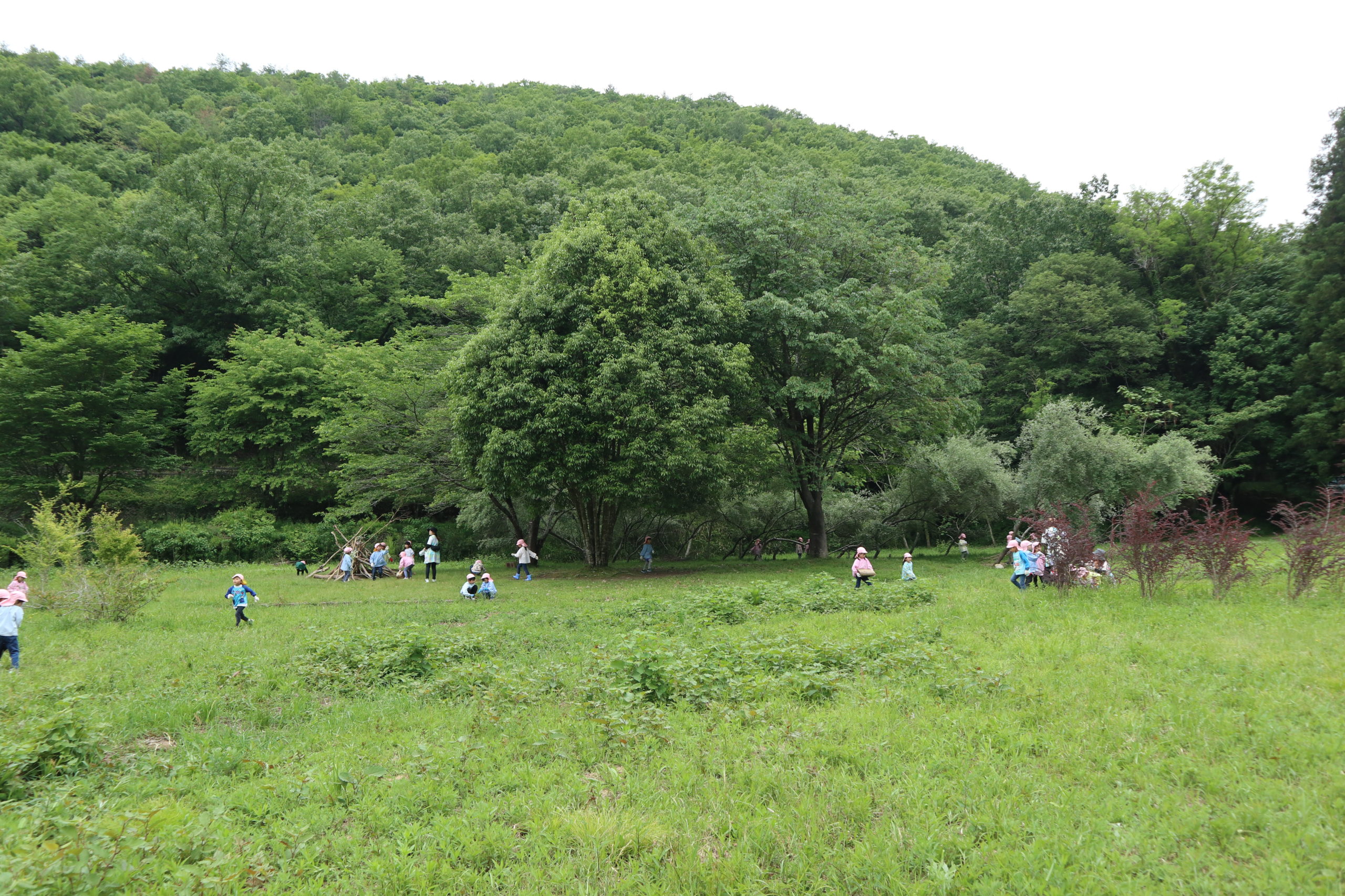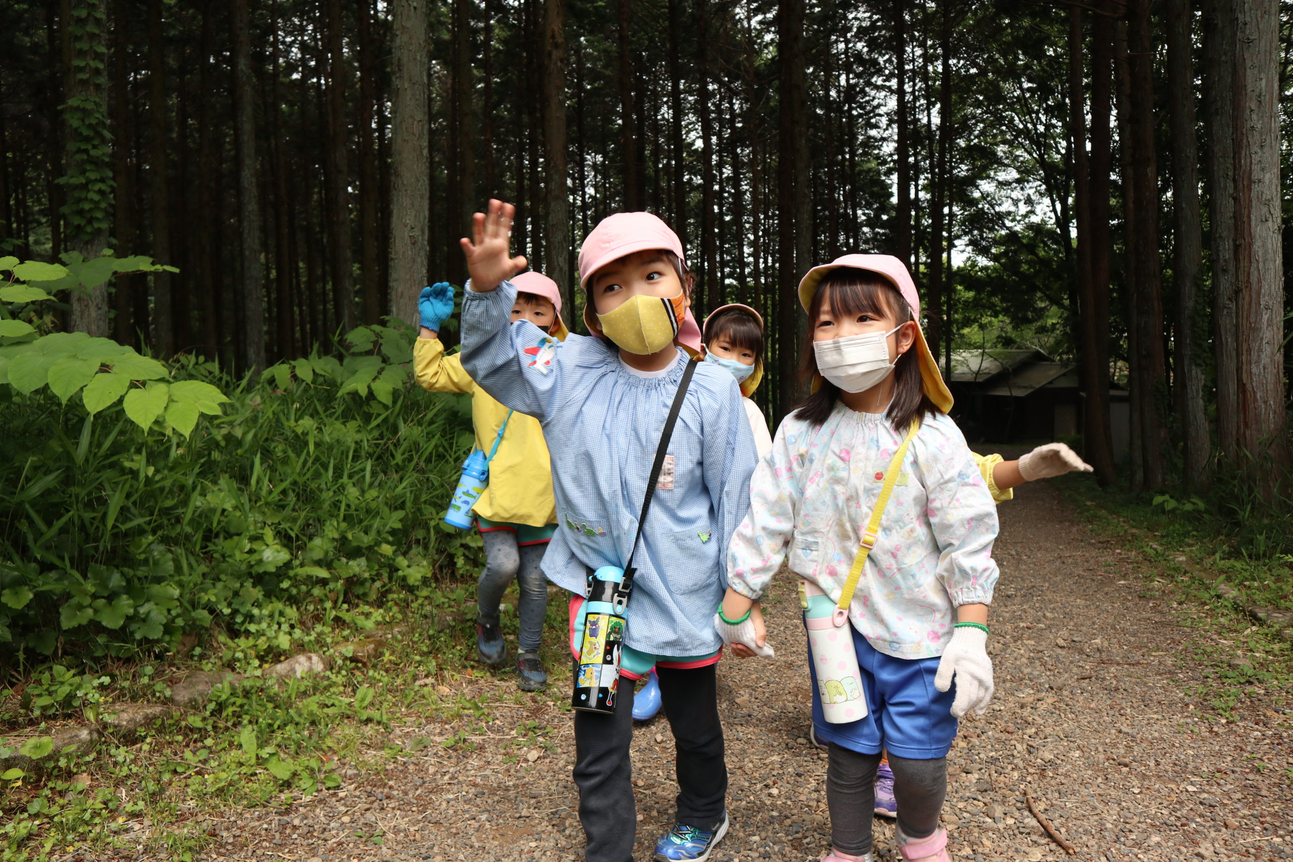 「ねえ、見て!秋には真っ赤な紅葉がきれいな緑色しているね。」3月に来た時は葉っぱが落ちて寂しかった木々が緑でいっぱいです。見ているだけで心も身体も癒されます。薄暗いスギ林のトンネルでは、「おばけが出そうだね。」と話していたこどもたちですが、トンネルをぬけて明るくなるといつもの元気が出てきたよ。