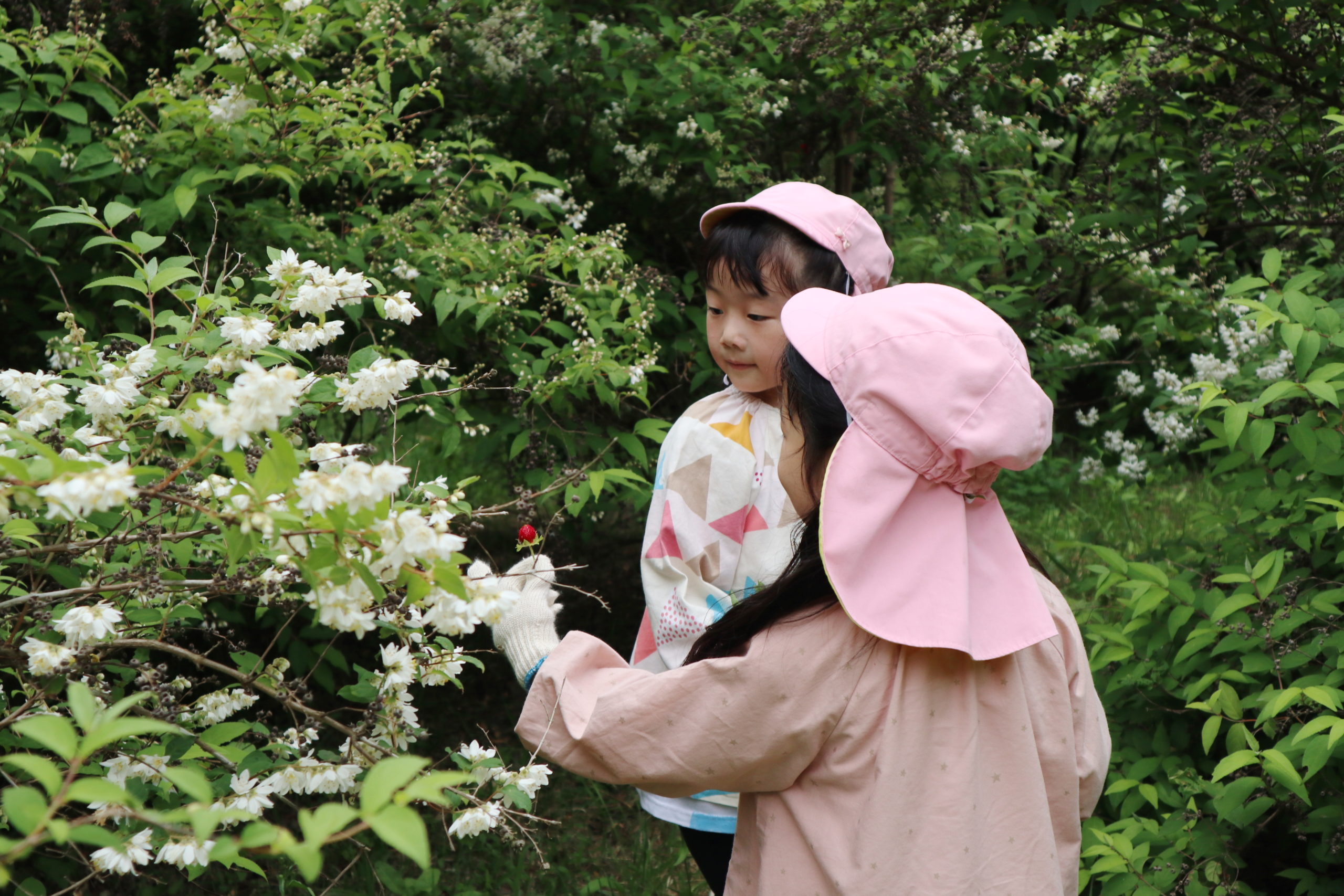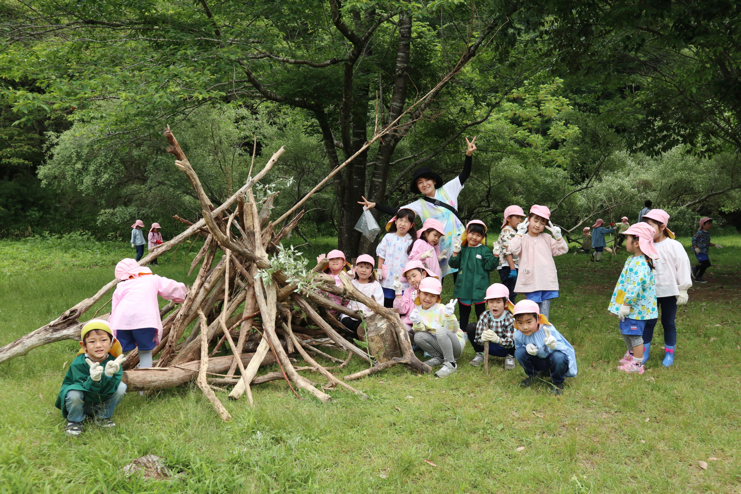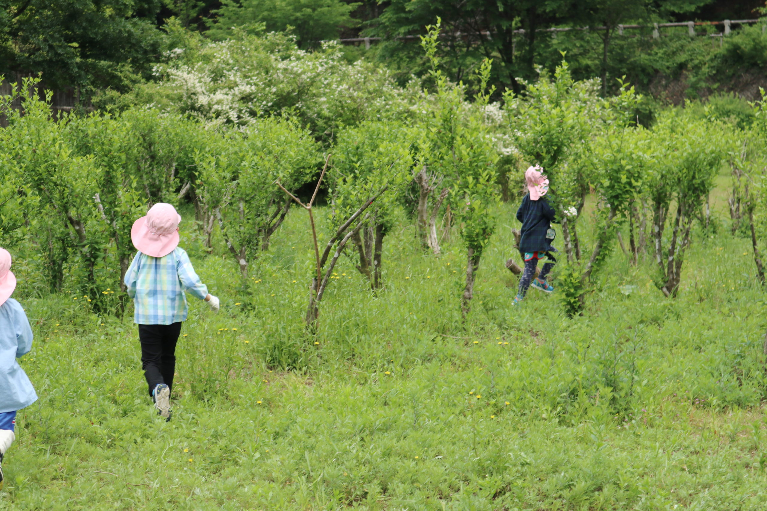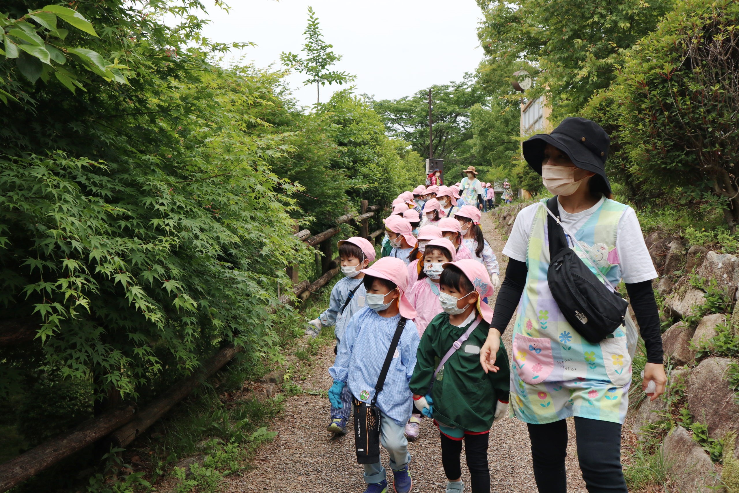 「ねえ、見て!秋には真っ赤な紅葉がきれいな緑色しているね。」3月に来た時は葉っぱが落ちて寂しかった木々が緑でいっぱいです。見ているだけで心も身体も癒されます。薄暗いスギ林のトンネルでは、「おばけが出そうだね。」と話していたこどもたちですが、トンネルをぬけて明るくなるといつもの元気が出てきたよ。