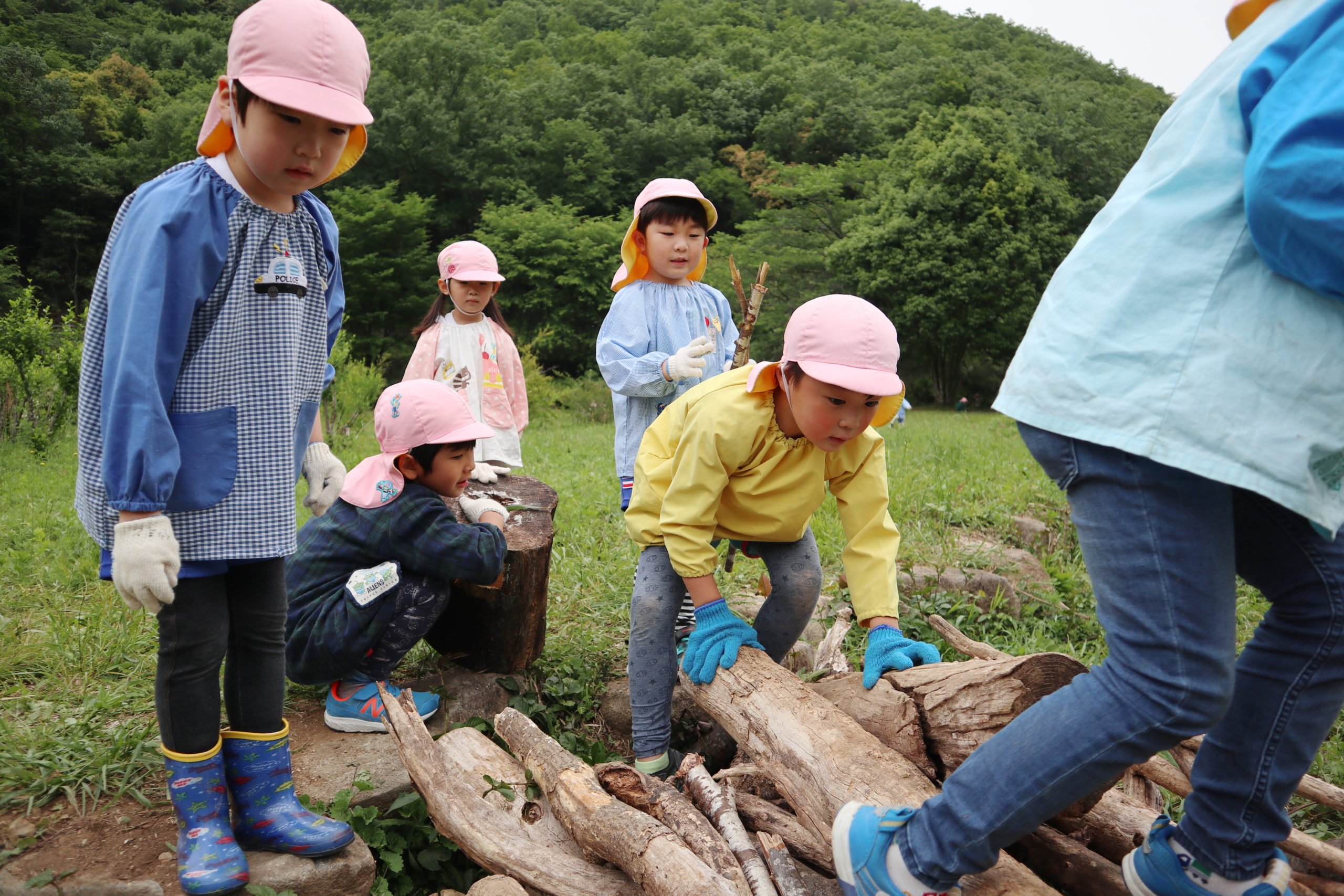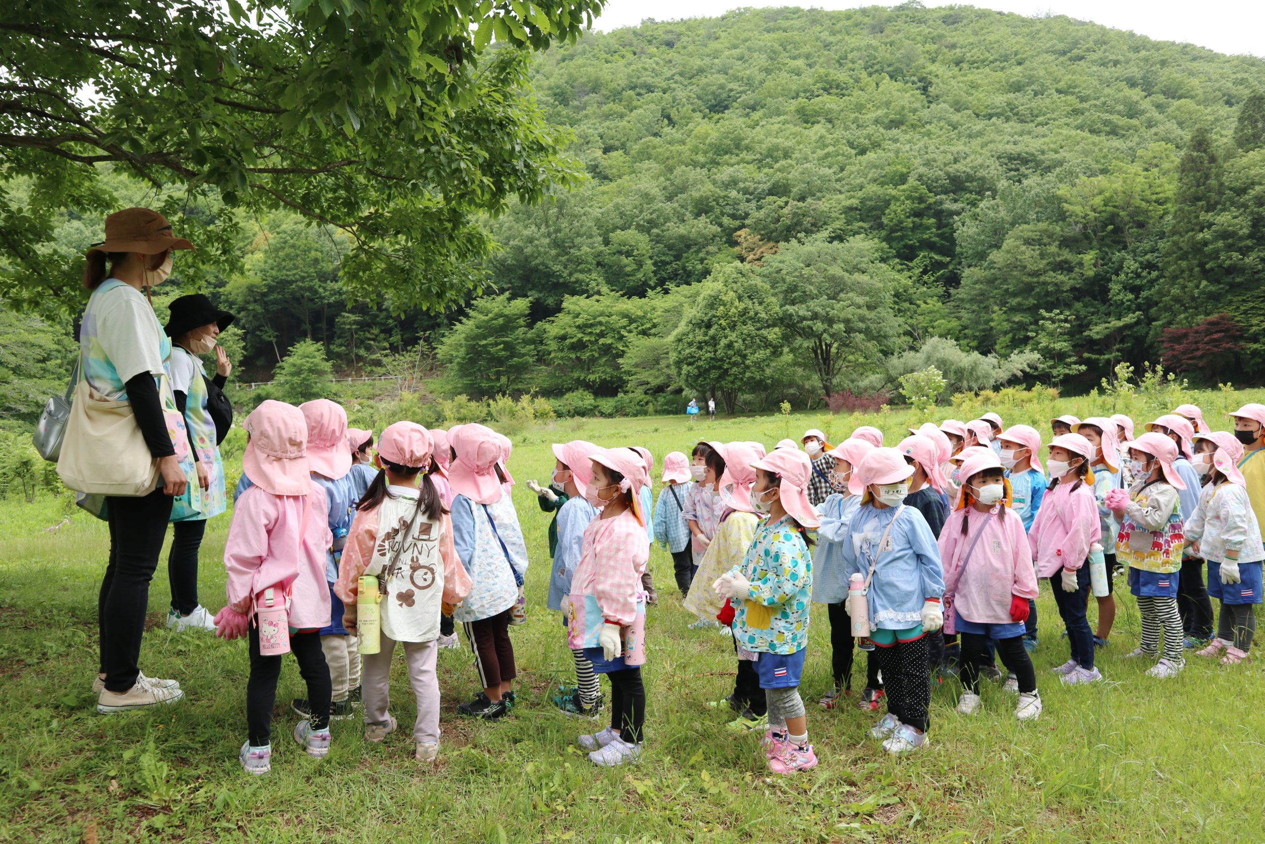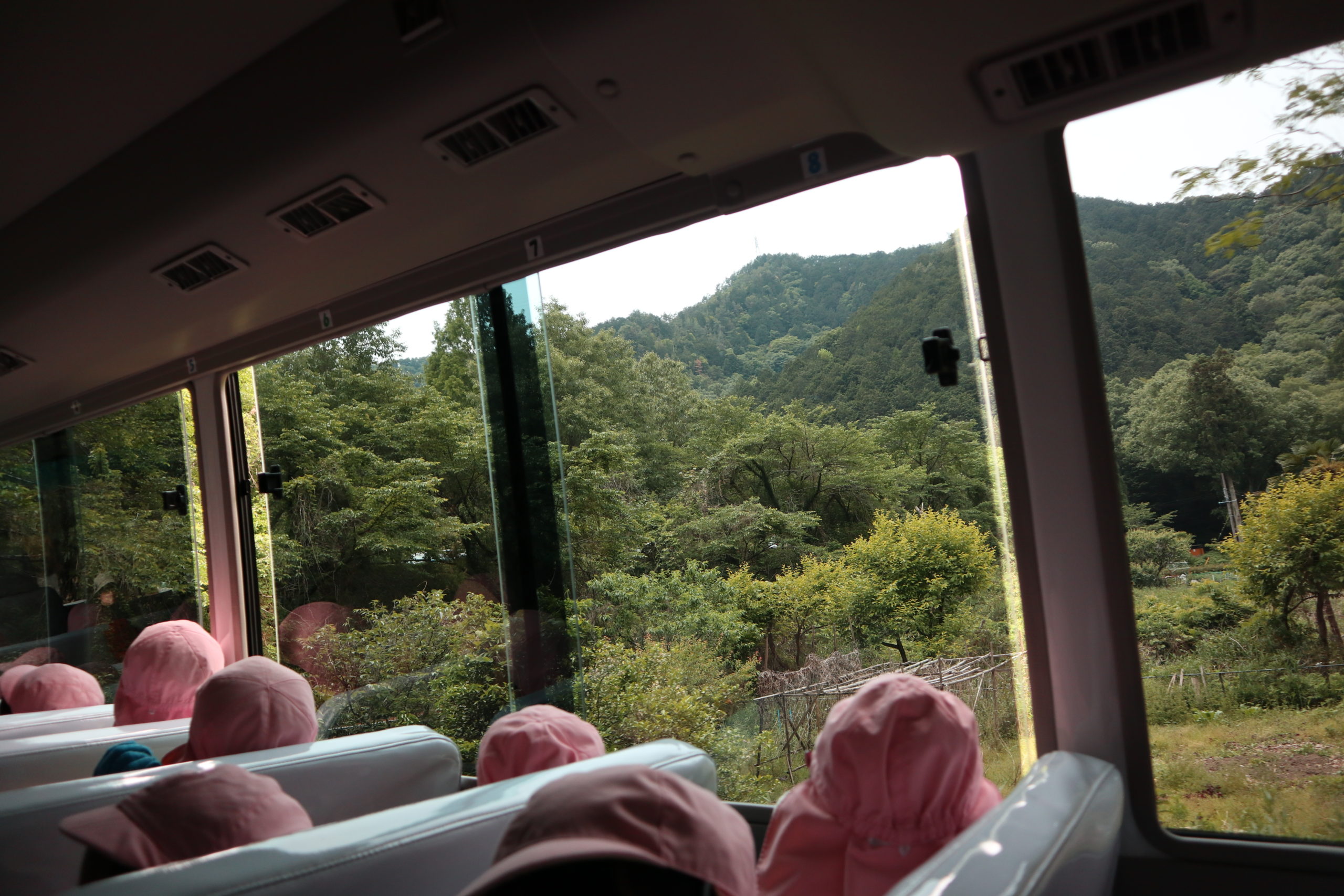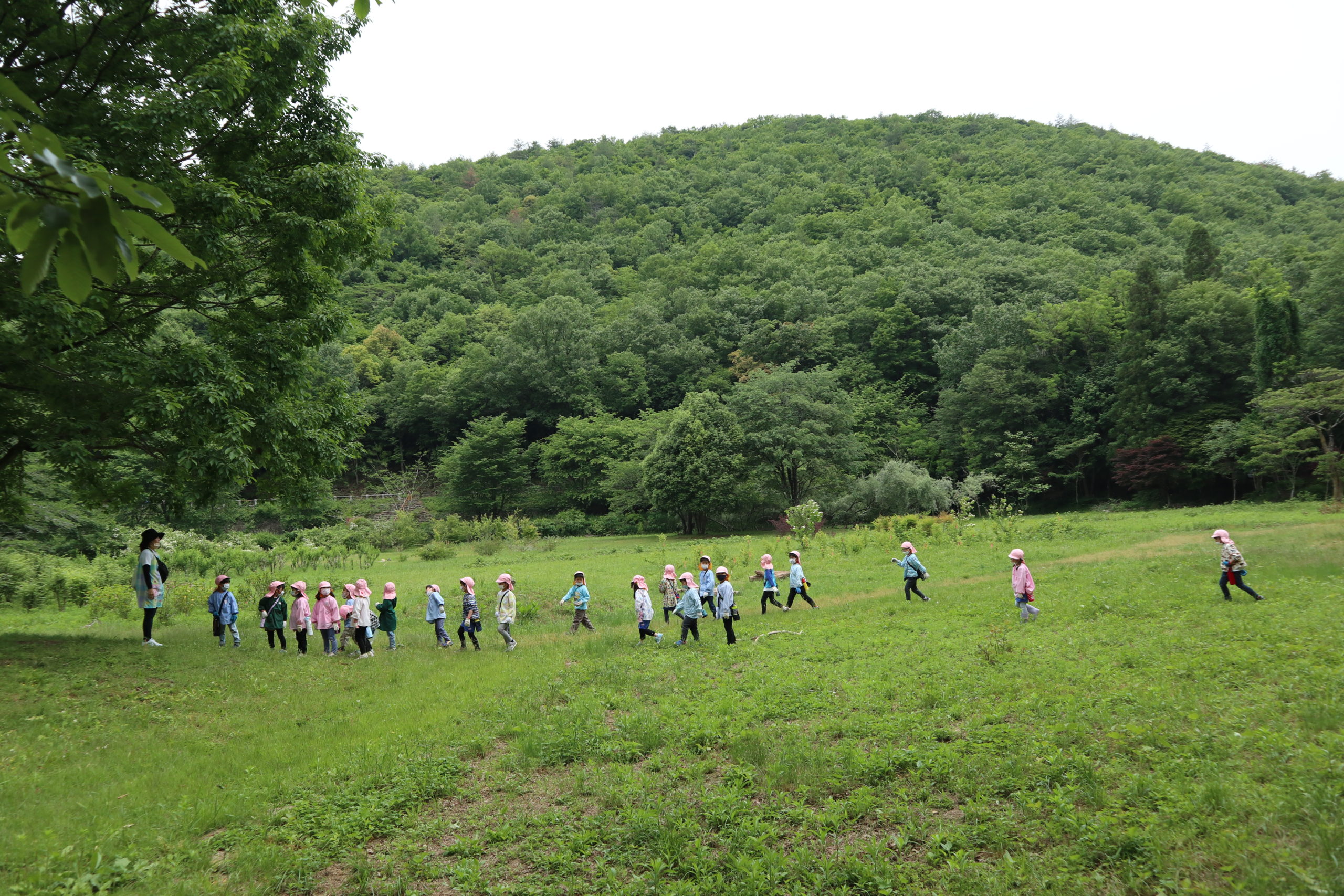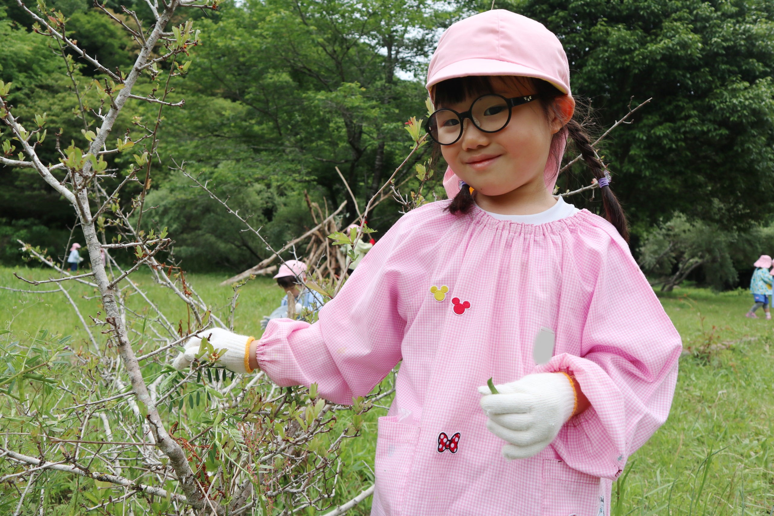 「ねえ、見て!秋には真っ赤な紅葉がきれいな緑色しているね。」3月に来た時は葉っぱが落ちて寂しかった木々が緑でいっぱいです。見ているだけで心も身体も癒されます。薄暗いスギ林のトンネルでは、「おばけが出そうだね。」と話していたこどもたちですが、トンネルをぬけて明るくなるといつもの元気が出てきたよ。