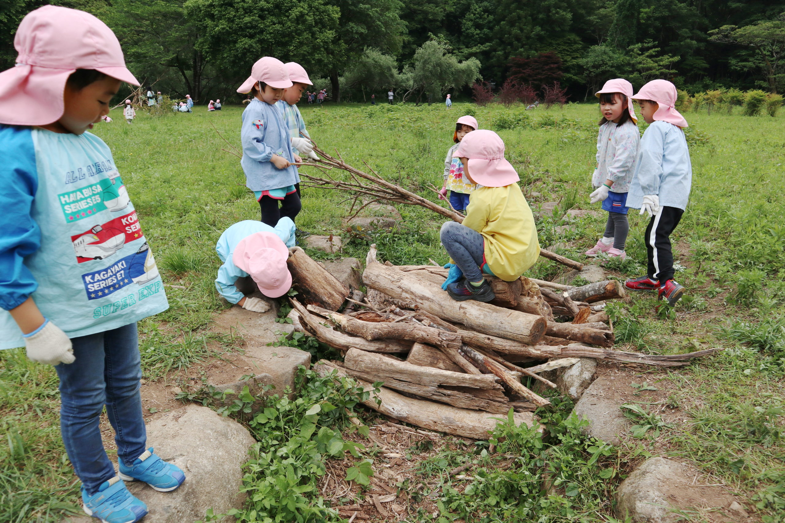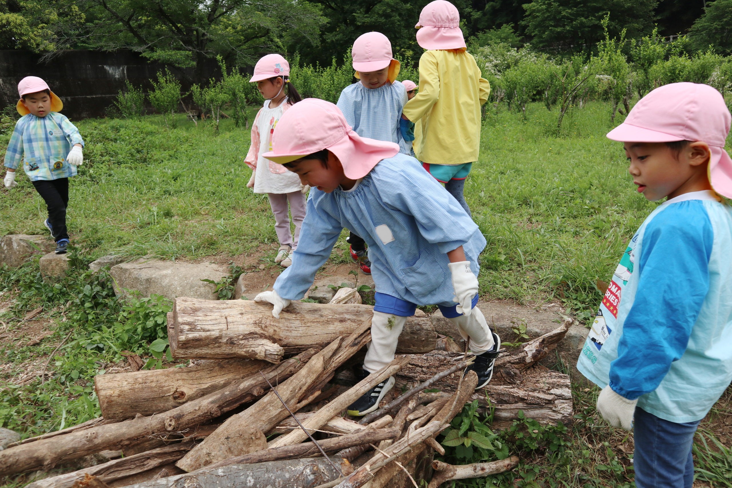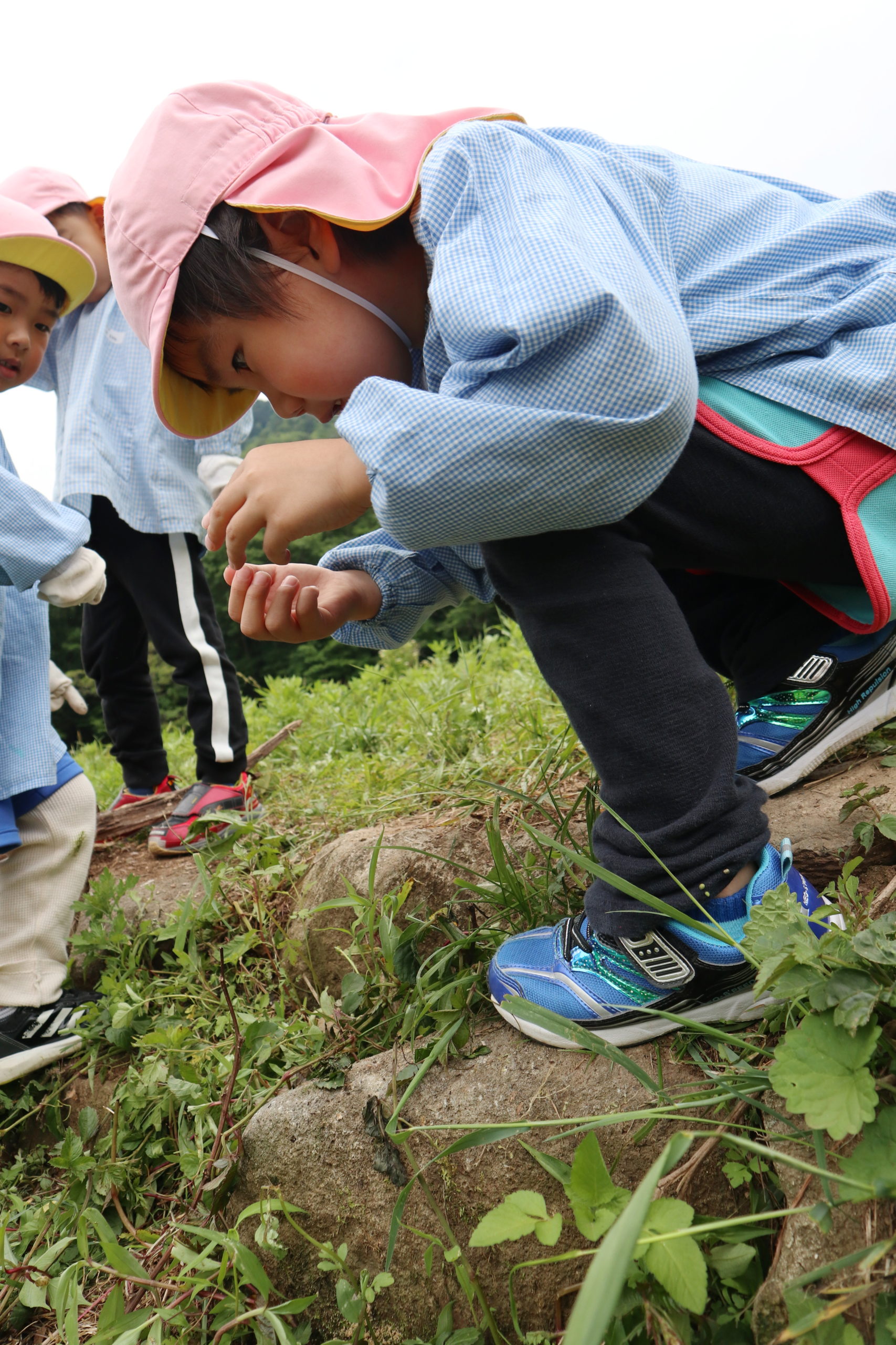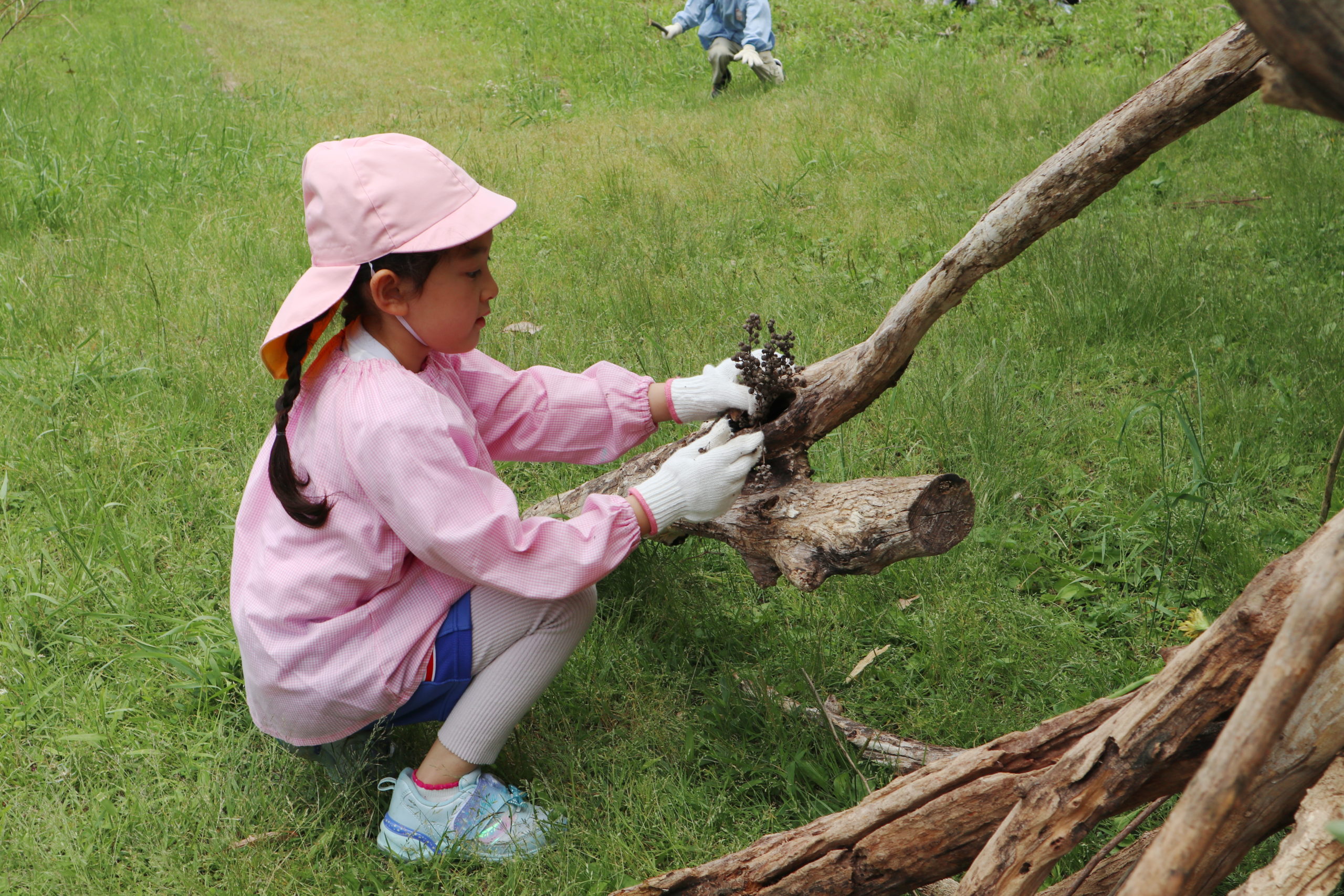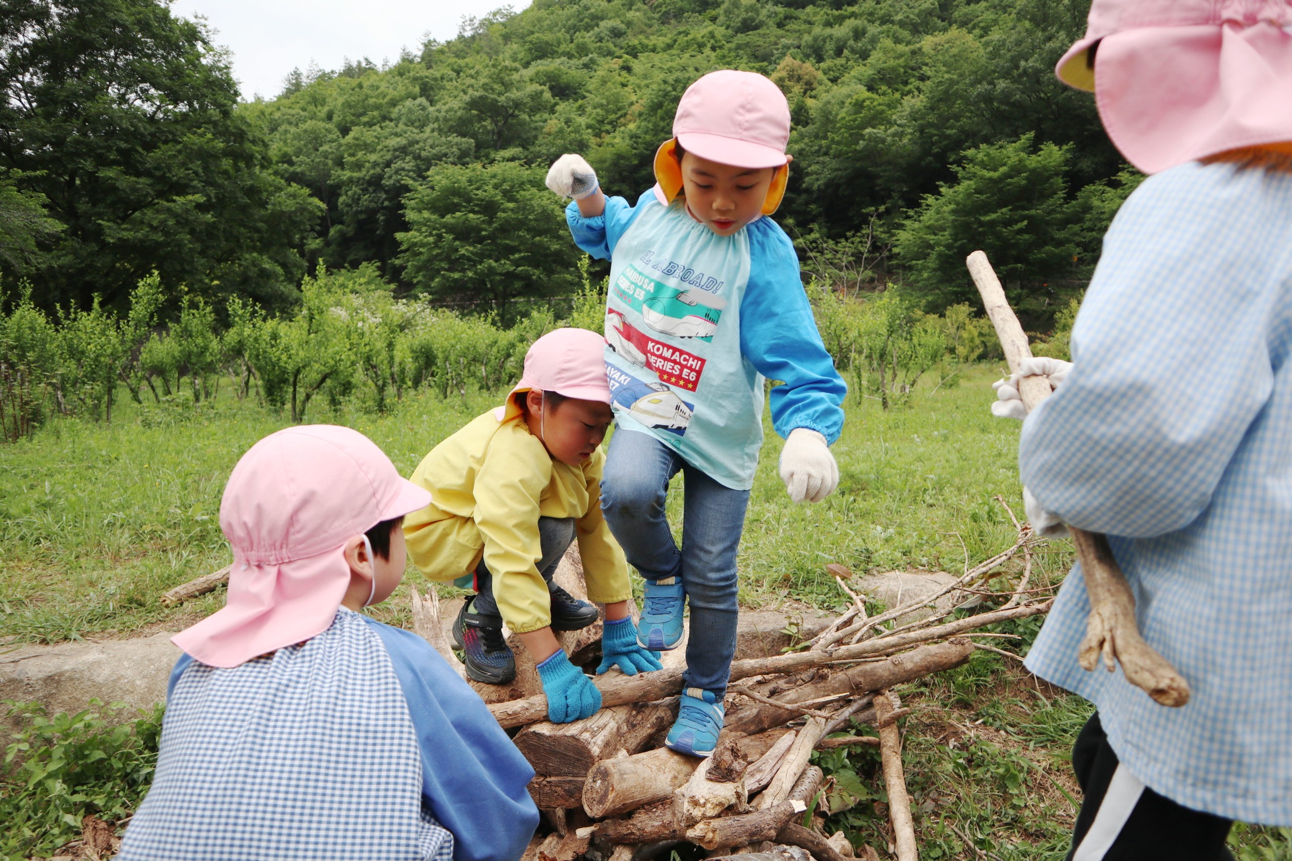 遊具のないところで何をしていいのか?戸惑い苦手な子もいますが、おともだちや先生に誘われて少しずつ活動できるようになってきています。誰だって苦手なことがありますが、自然の中で遊ぶ楽しさを伝えていきたいと思っています。