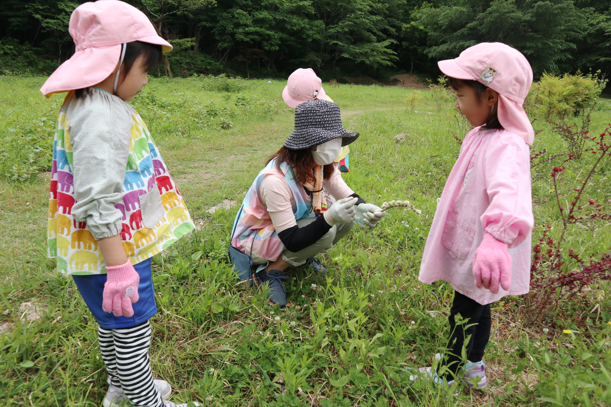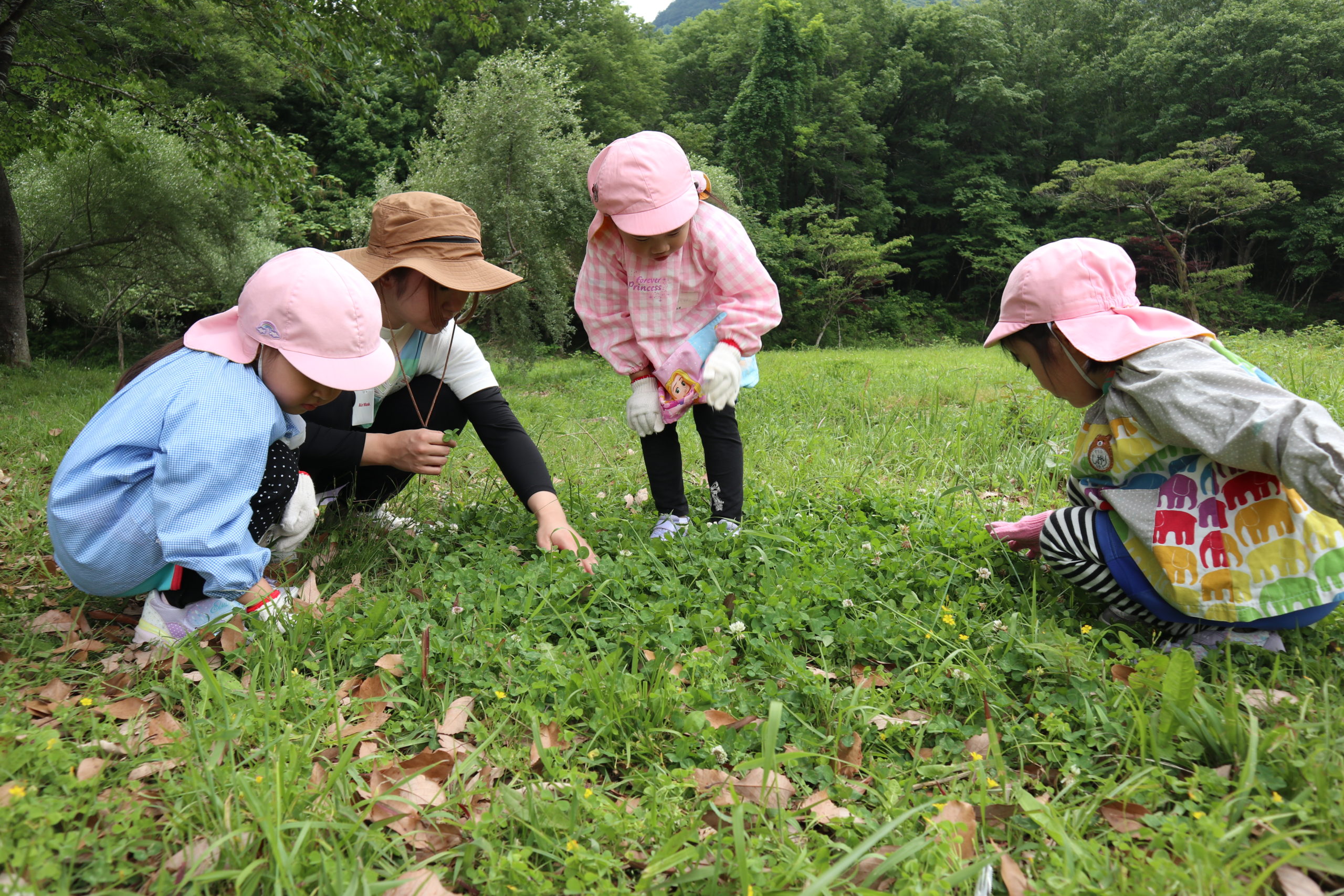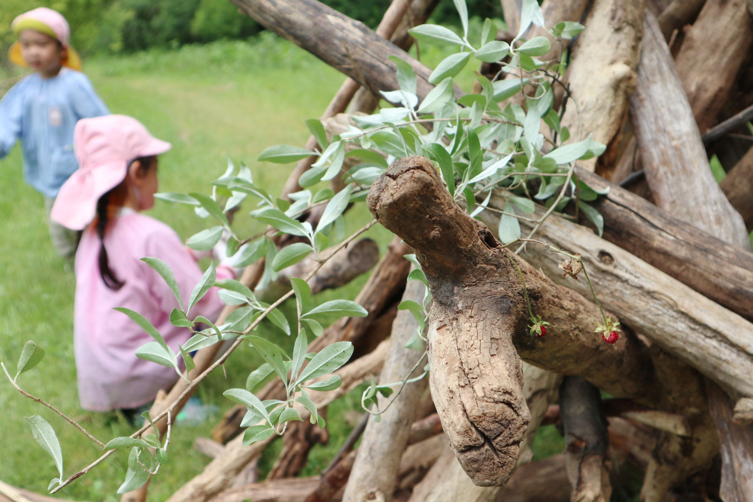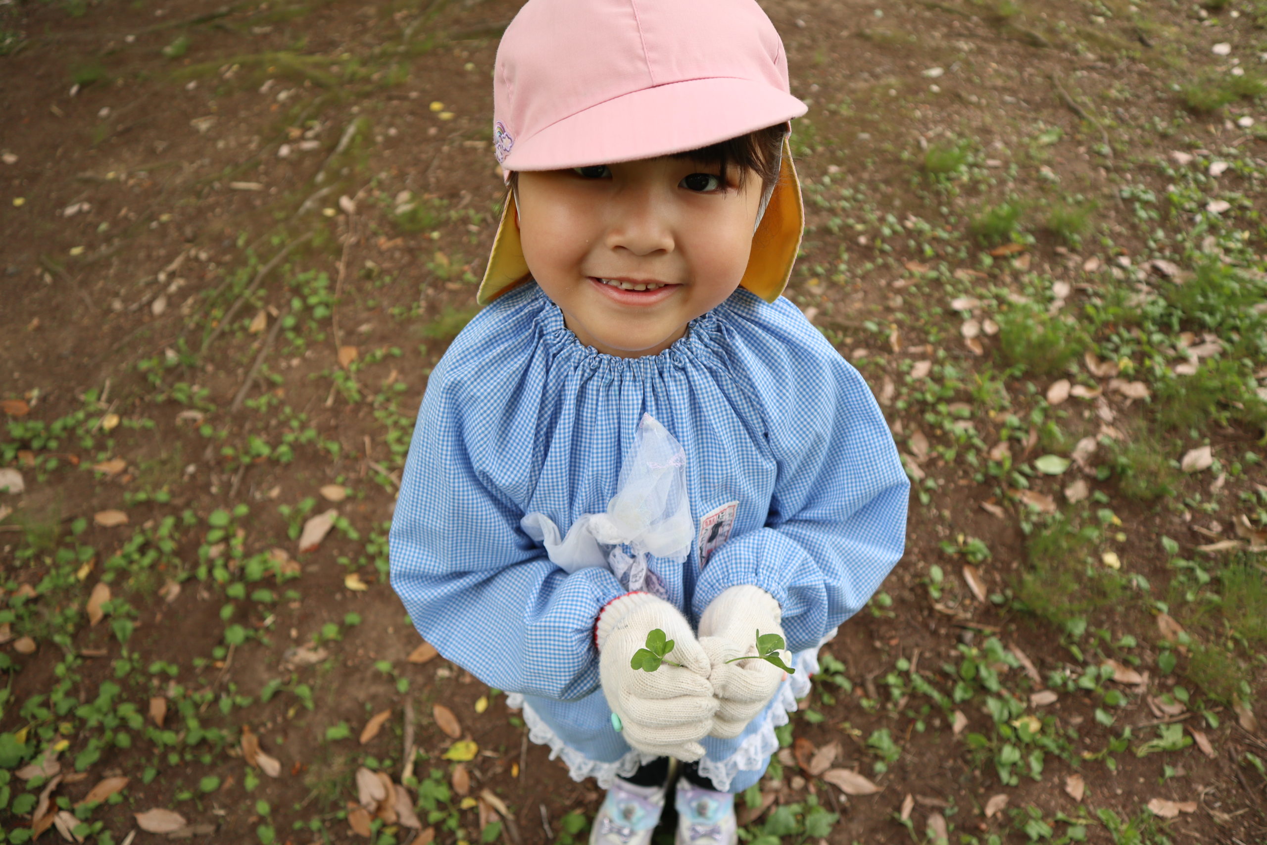 「これなあに?」と不思議そう。「数珠玉っていうんだよ。最近ではあまり見かけないね。先生の小さい頃水路端でよく見つけたよ。たくさん集めて、真ん中の芯を抜いて糸を通してブレスレットを作ったよ。」「へー、もっとたくさん探してみよっと。」と駆けていきました。やすこ先生たちはクローバー探しに夢中だよ。あちらこちらで木の枝を運んでいますよ。「どっちにいこうかな?」「ぼくはここまでのぼれたよ。」「やっと見つけたよ。四つ葉のクローバー見つけるといいことあるんだよ。」