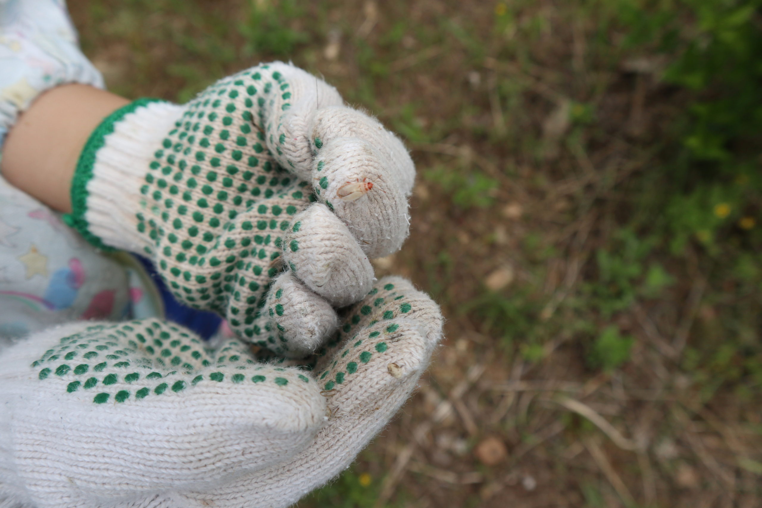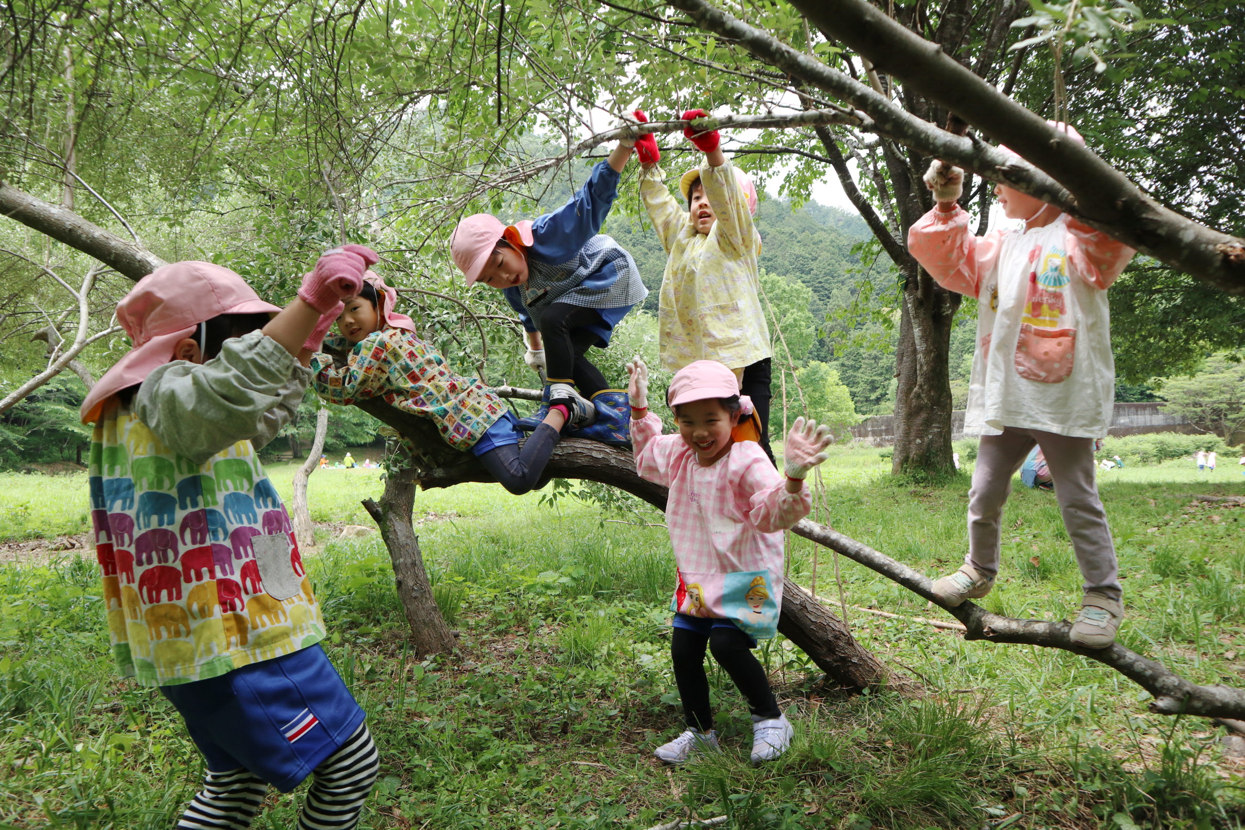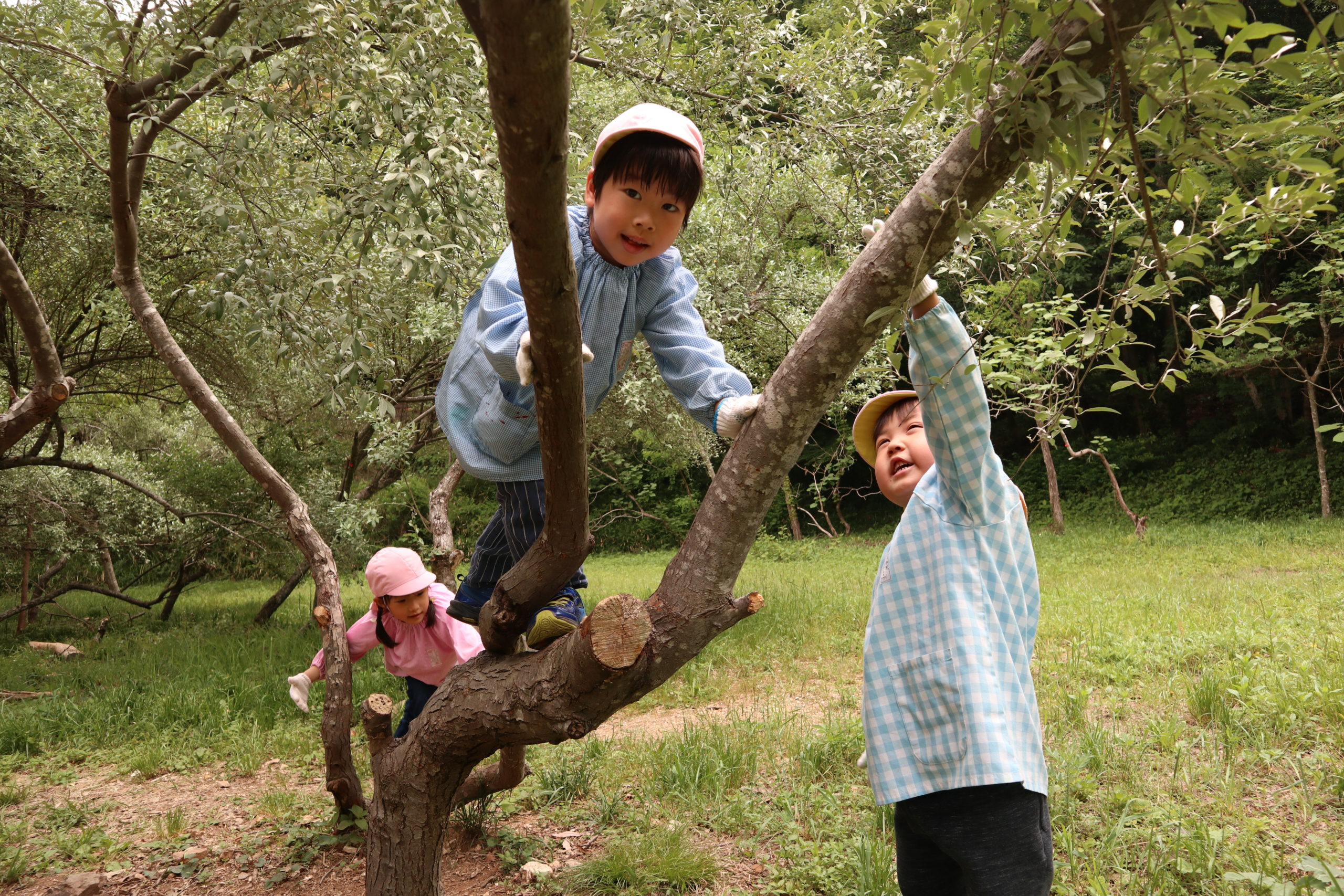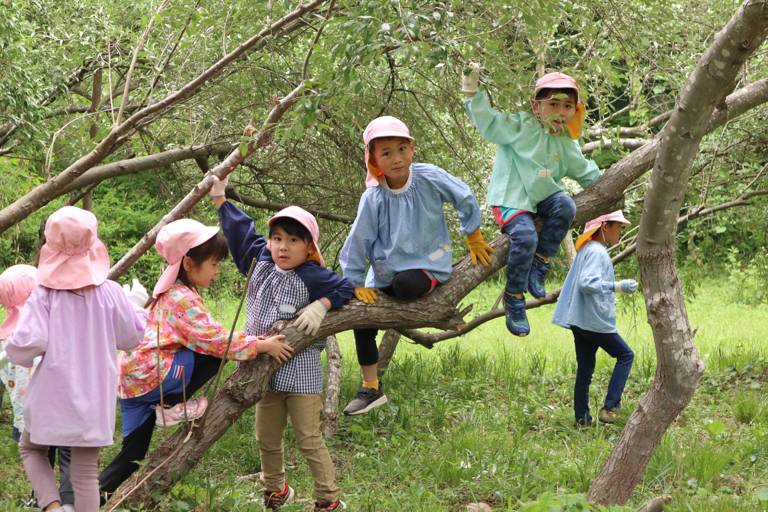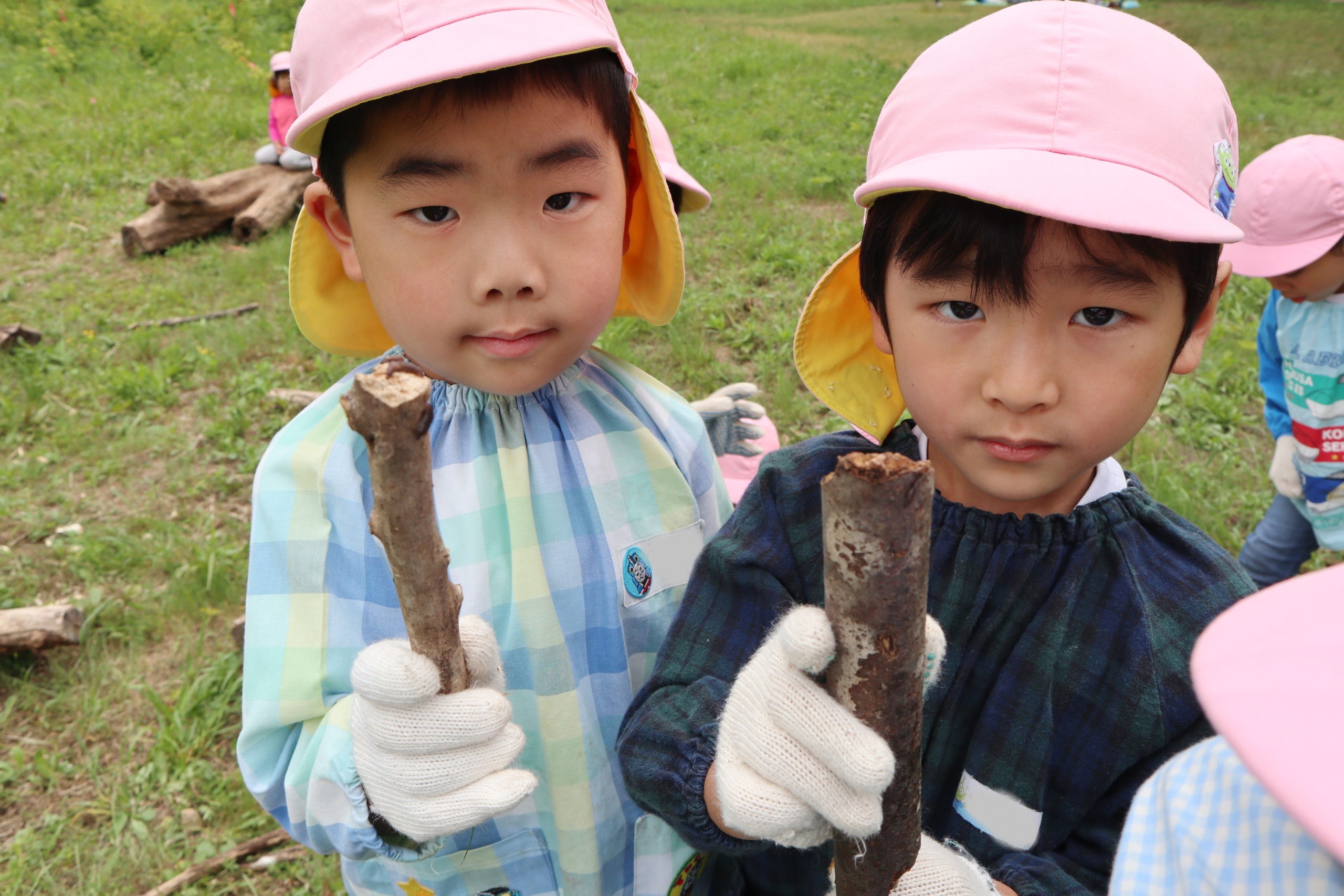 「これなあに?」と不思議そう。「数珠玉っていうんだよ。最近ではあまり見かけないね。先生の小さい頃水路端でよく見つけたよ。たくさん集めて、真ん中の芯を抜いて糸を通してブレスレットを作ったよ。」「へー、もっとたくさん探してみよっと。」と駆けていきました。やすこ先生たちはクローバー探しに夢中だよ。あちらこちらで木の枝を運んでいますよ。「どっちにいこうかな?」「ぼくはここまでのぼれたよ。」「やっと見つけたよ。四つ葉のクローバー見つけるといいことあるんだよ。」