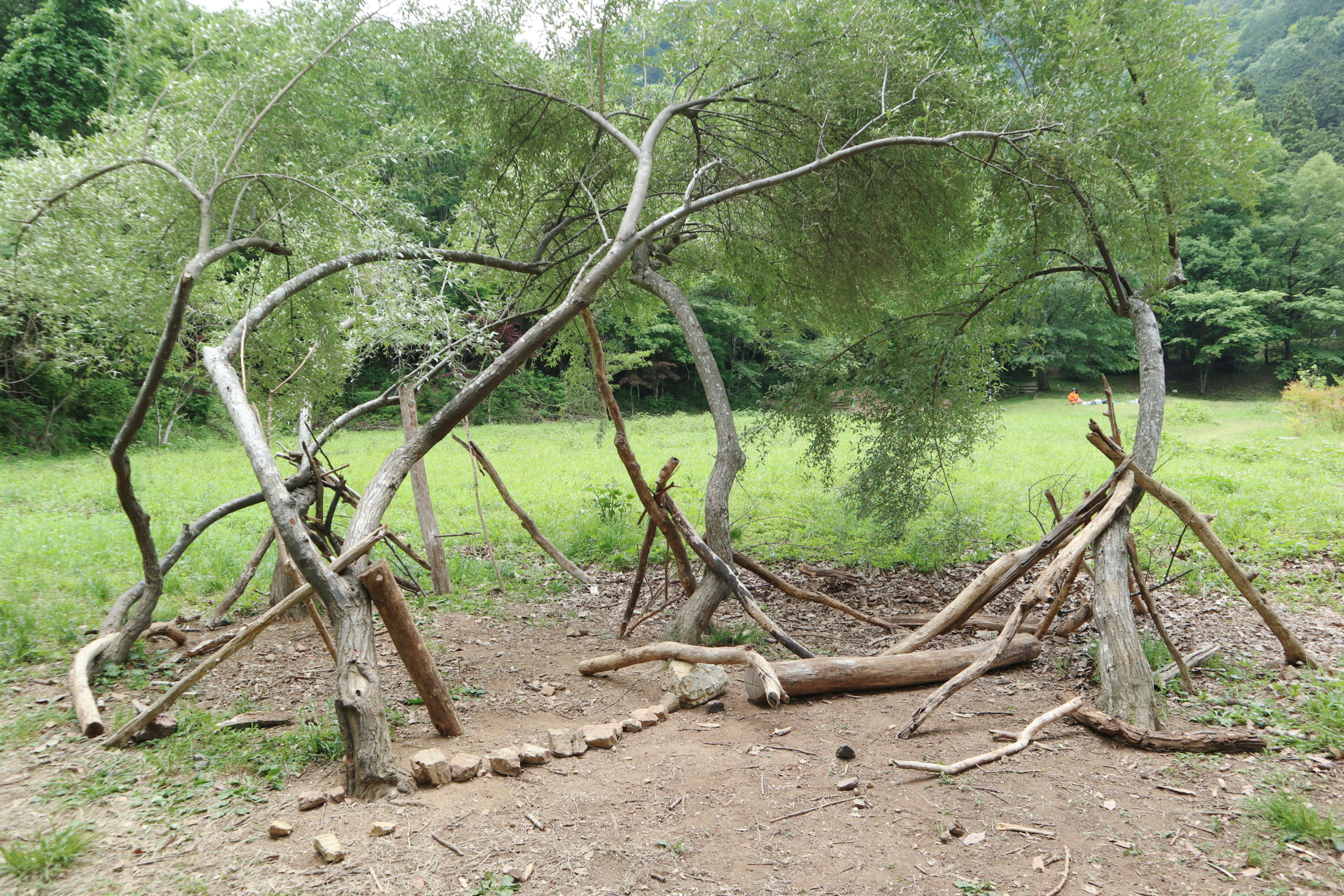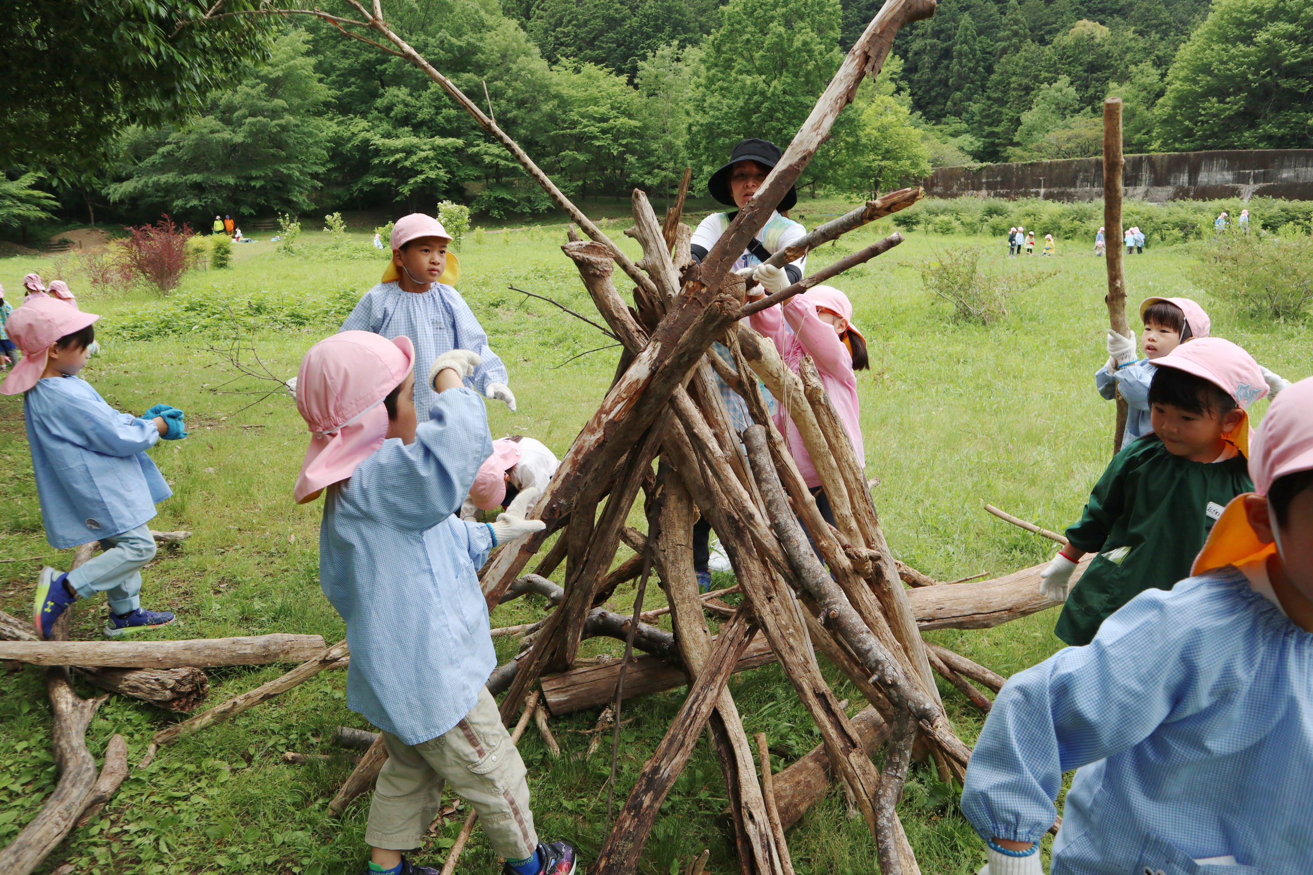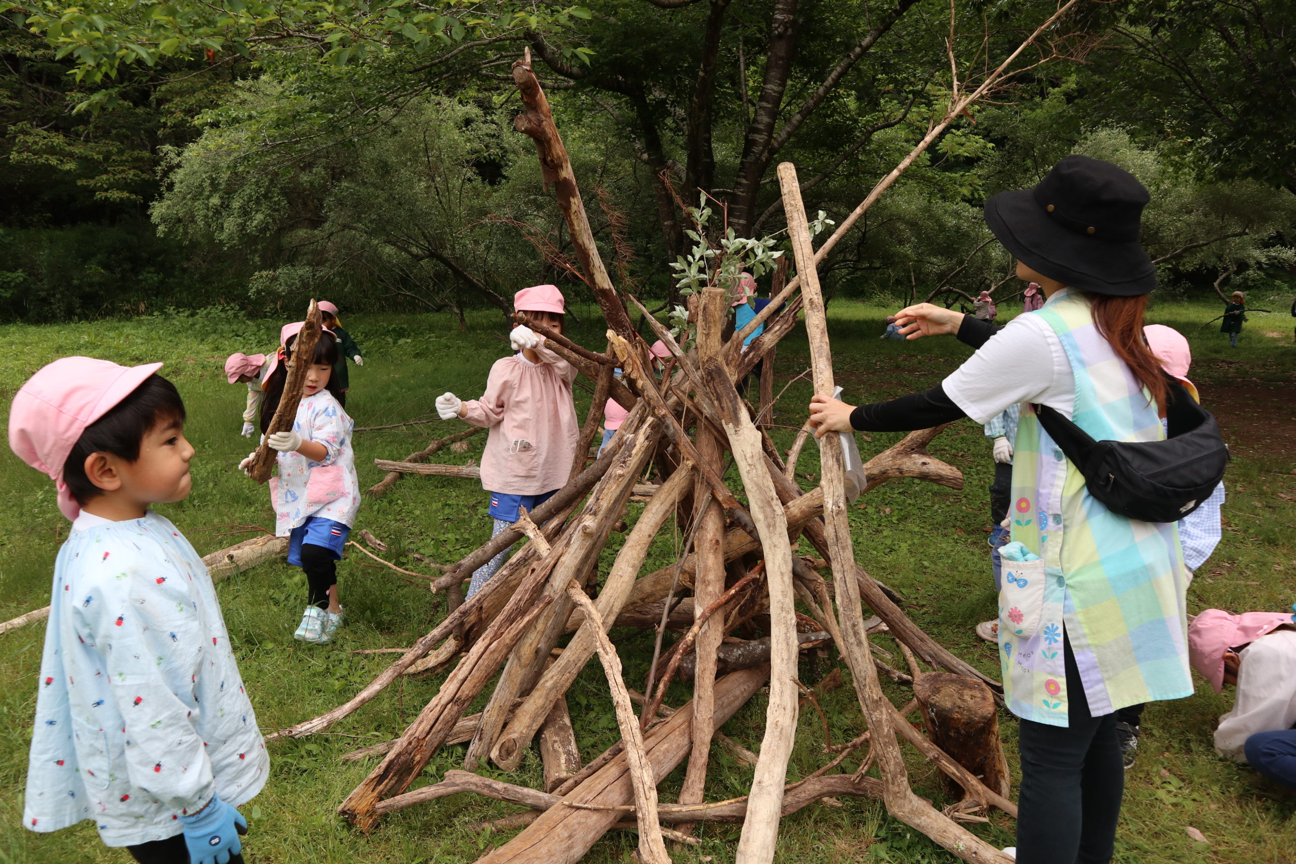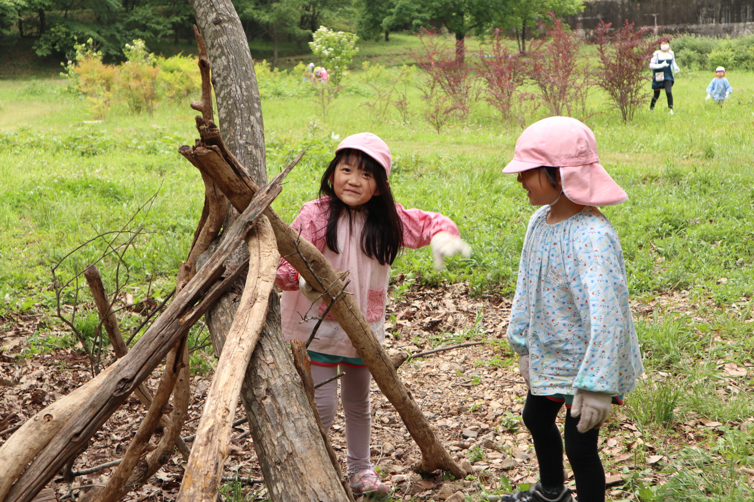 木のトゲをなくそうと枝を何度も擦り付けていたよ。そら組さんのツリーハウスのできあがり!さすが虫捕り名人。右手にカナヘビ、左手にとんぼ。ちょっと触らせて!