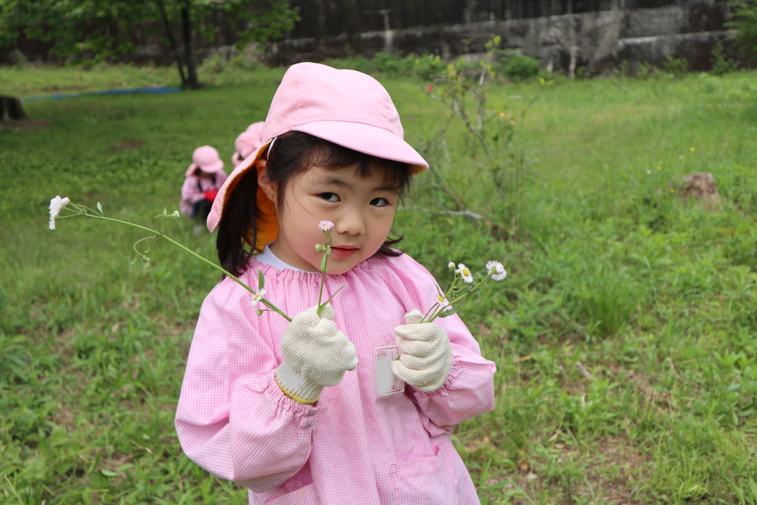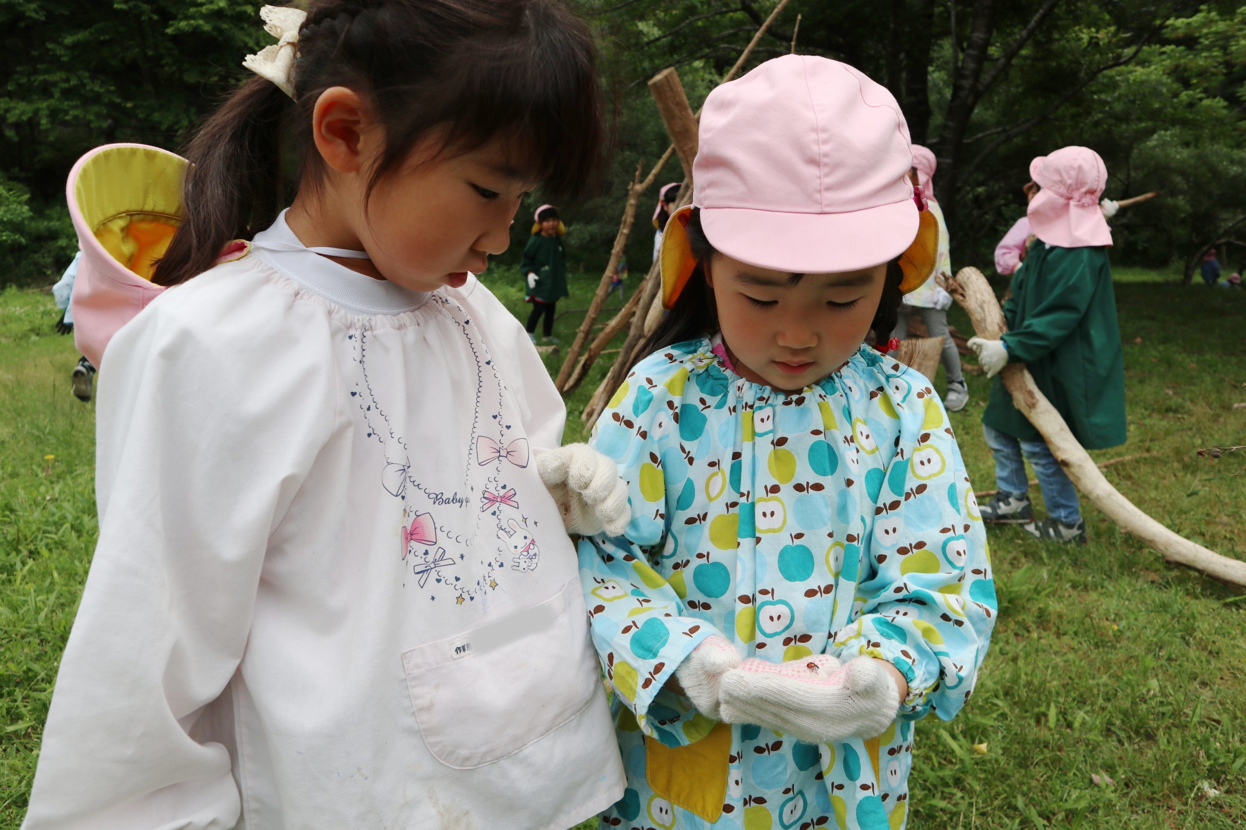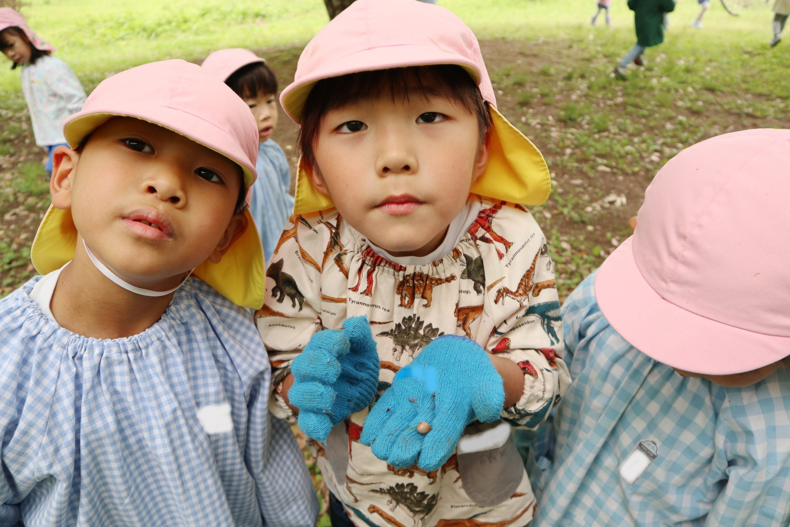 「白い虫見つけた!幼稚園に帰ったら、何の虫か調べてみよっと。」