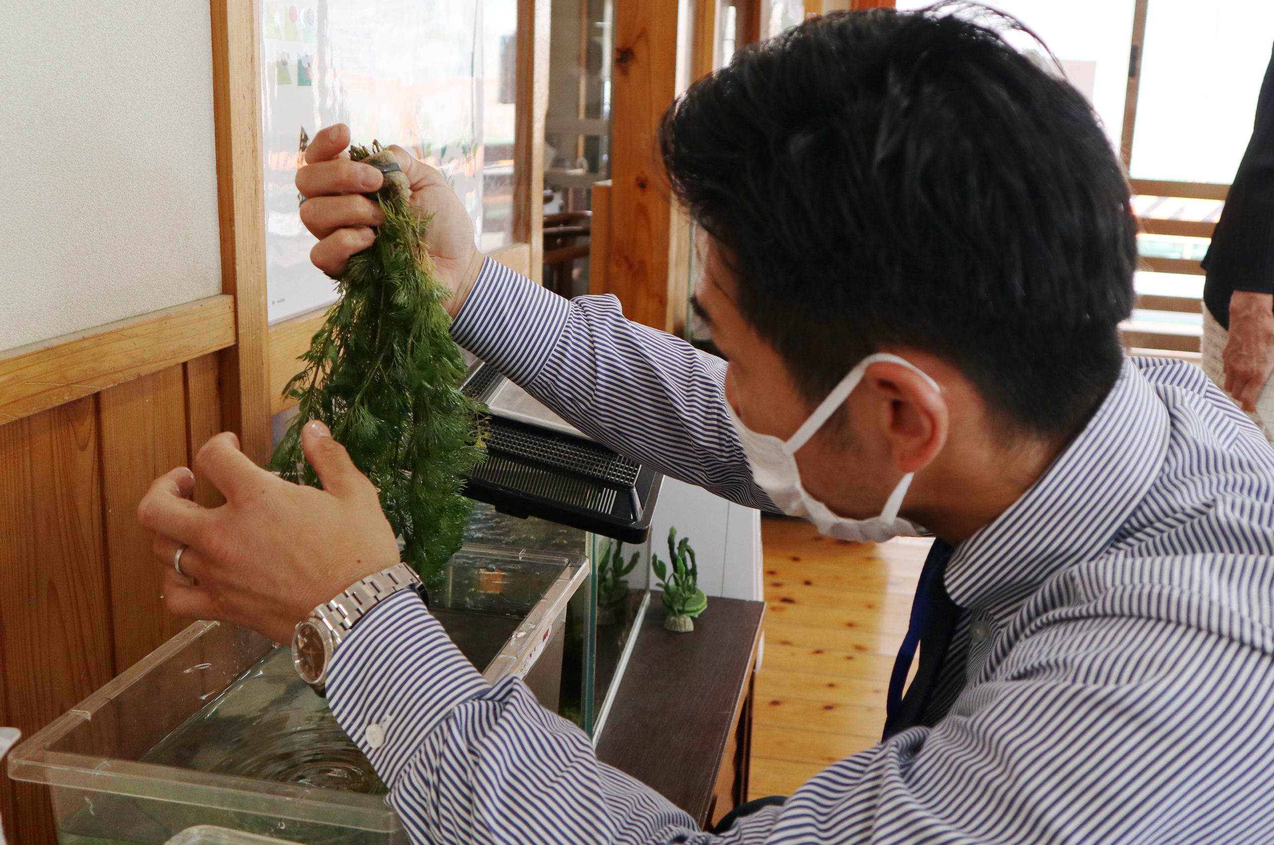 生き物博士の令耕先生がイモリの水槽の水草をじっと見つめています。どうしてかな?