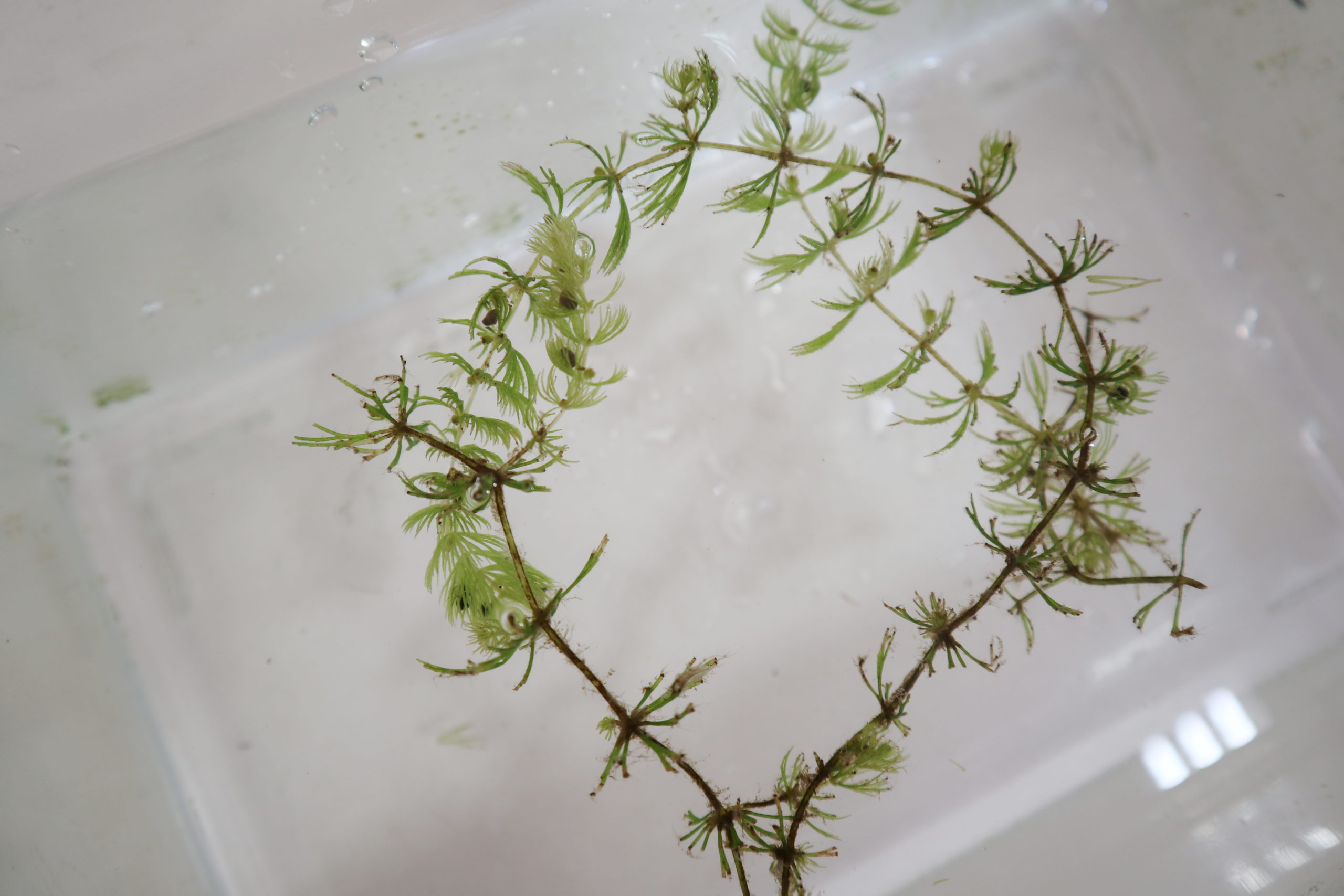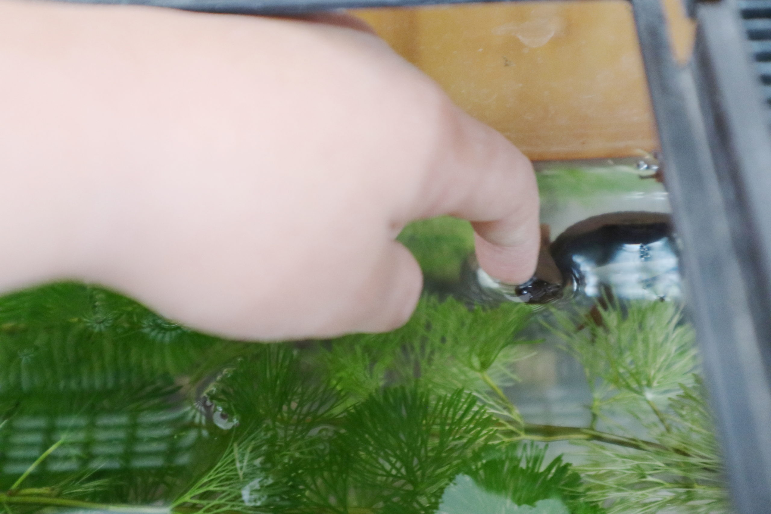 「たまご産んでいるよ。イモリは1度に100個も産むんだよ。」「100個も!」イモリがたまごを食べてしまうから別の水槽に移し替えました。