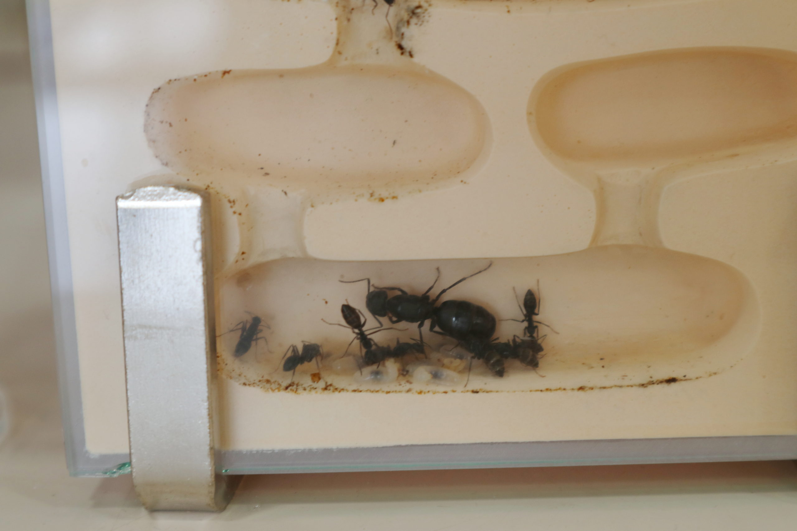 どれどれ?女王アリの部屋では、はたらきアリたちが幼虫の世話をしていましたよ。