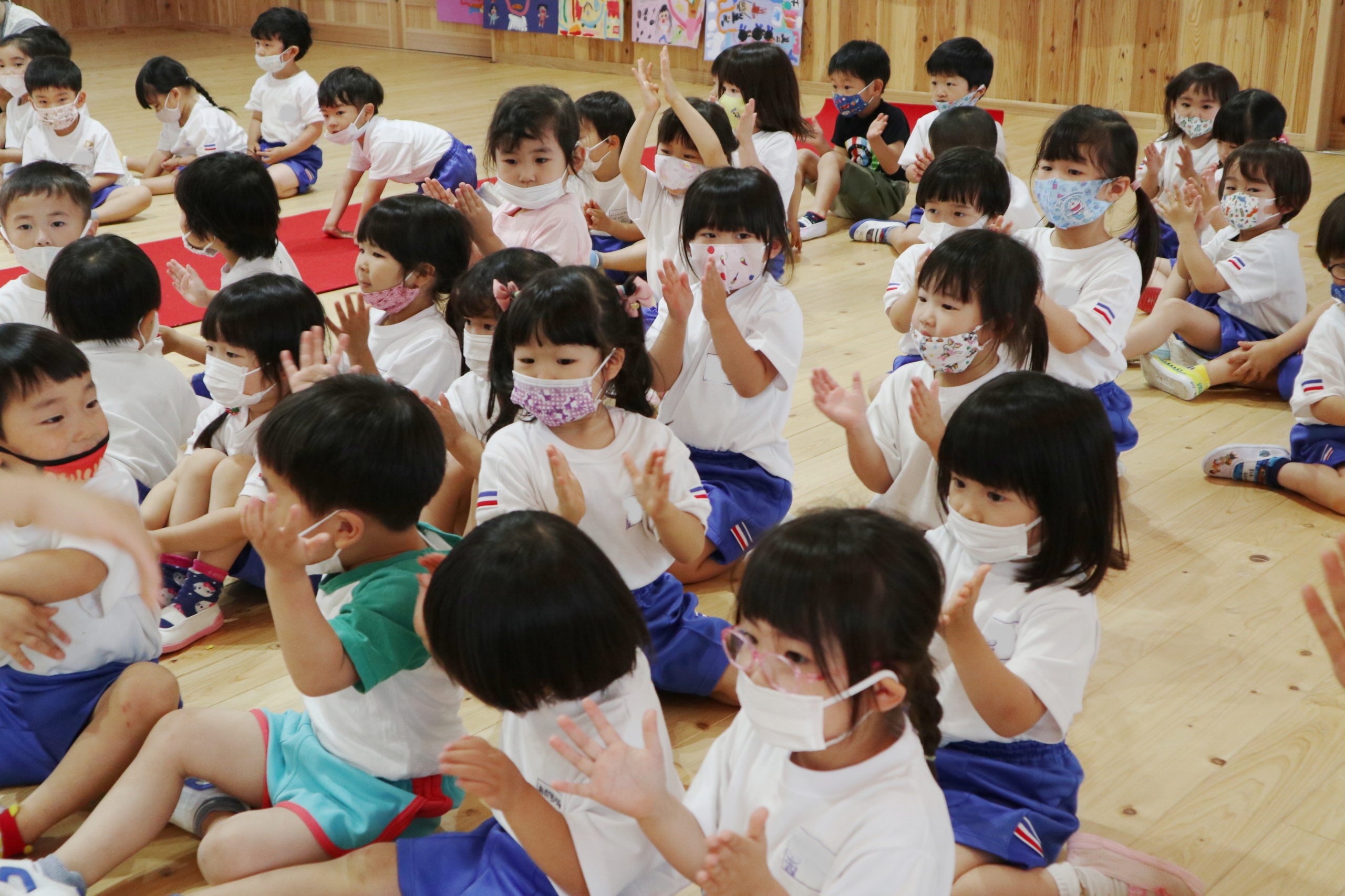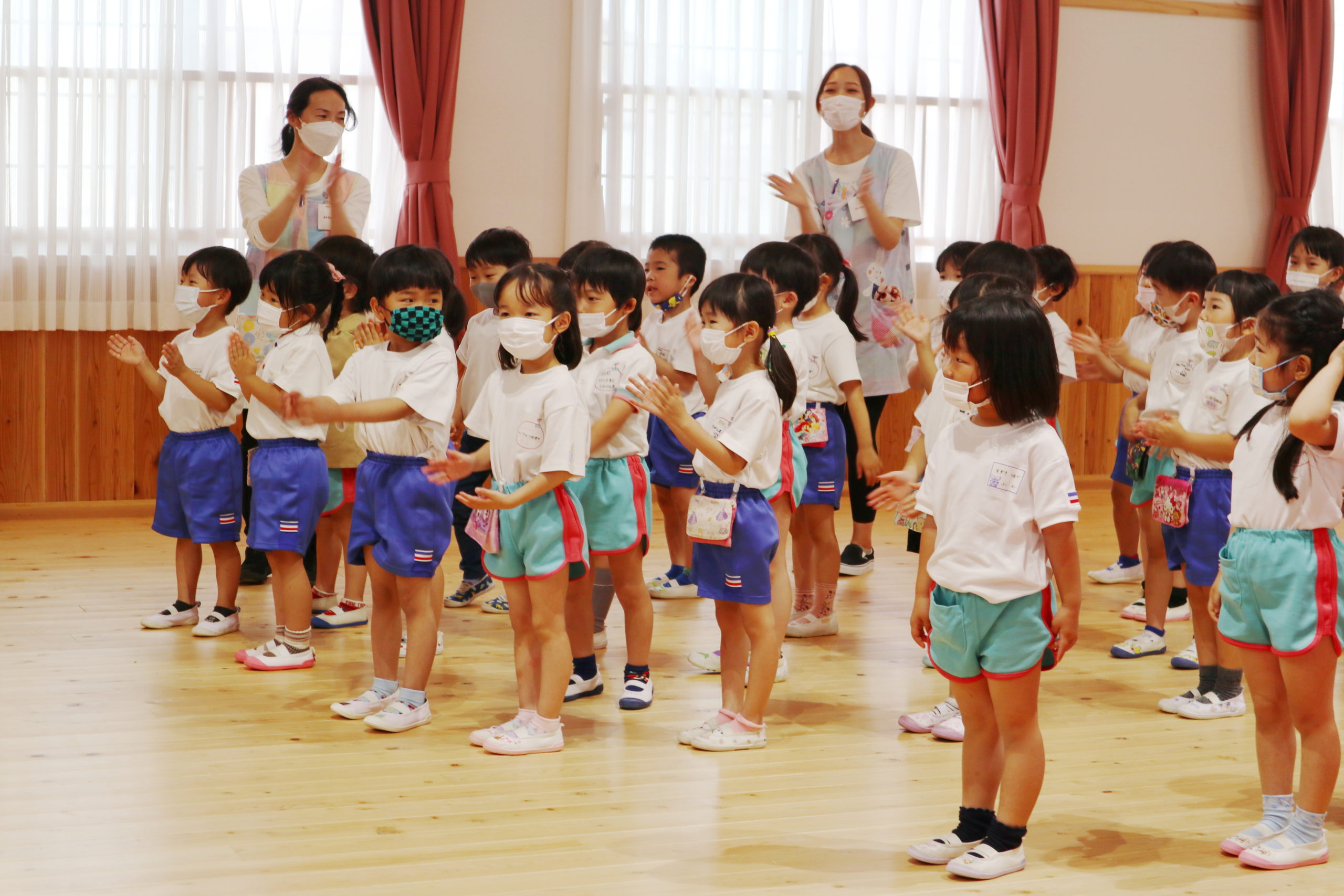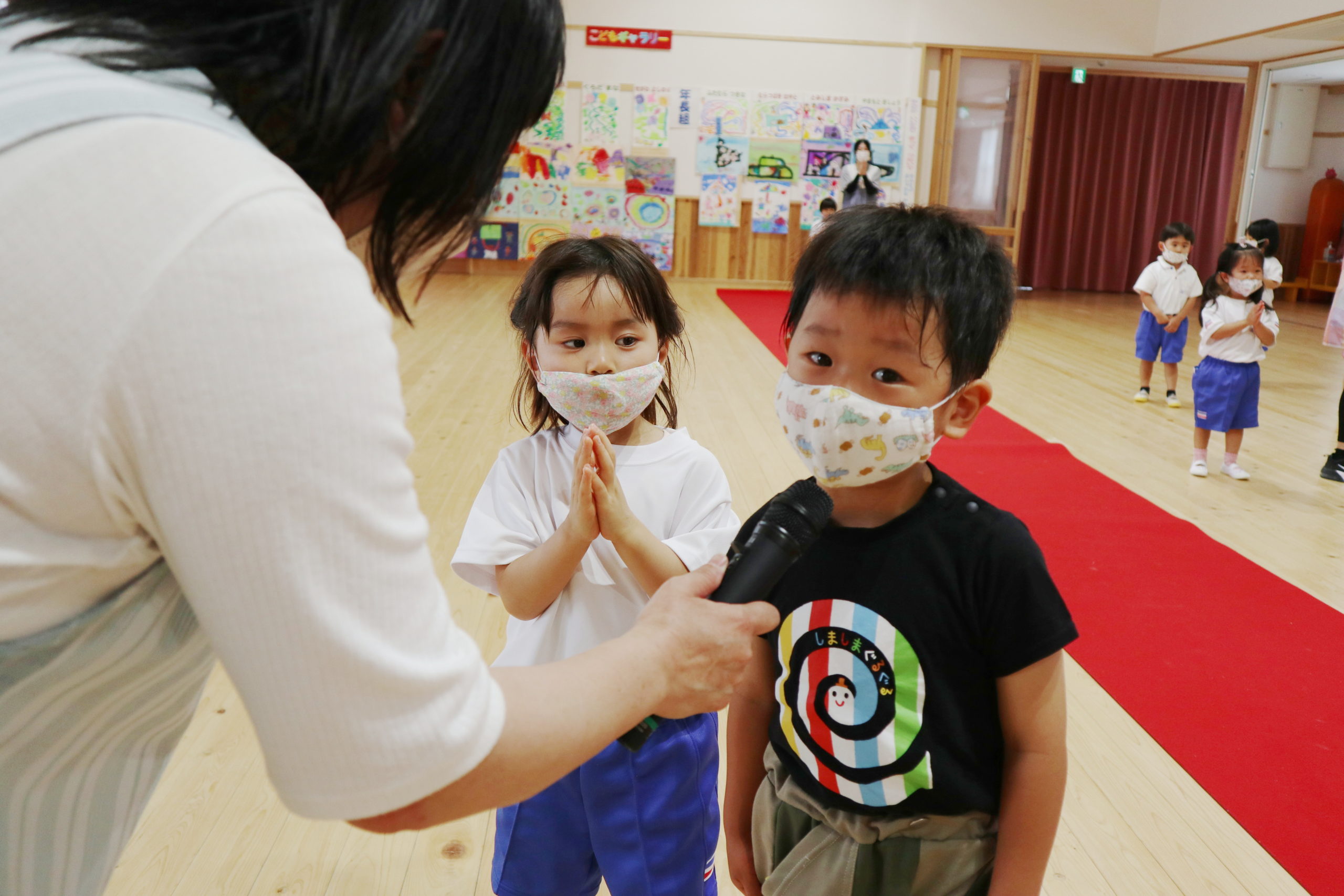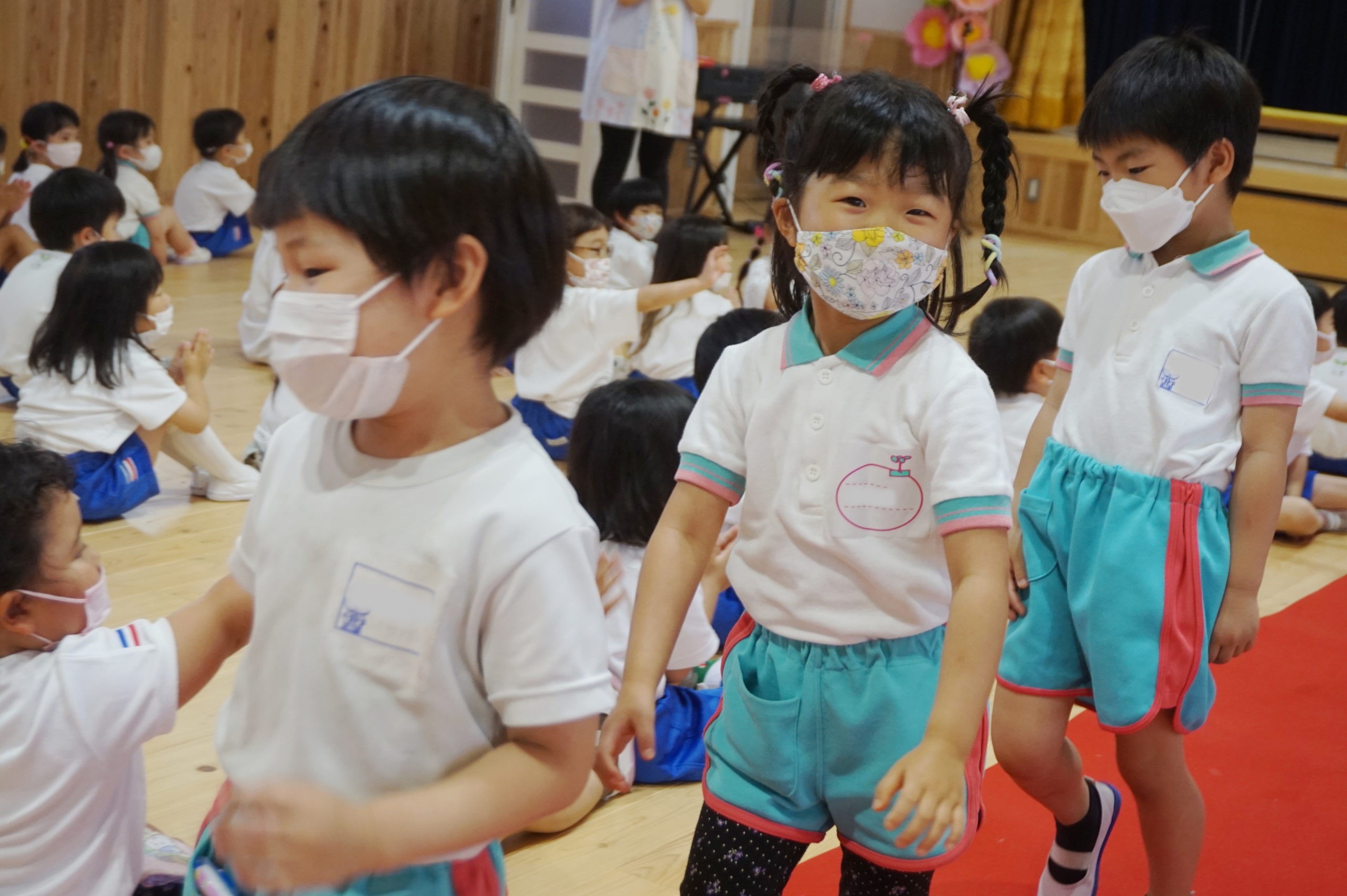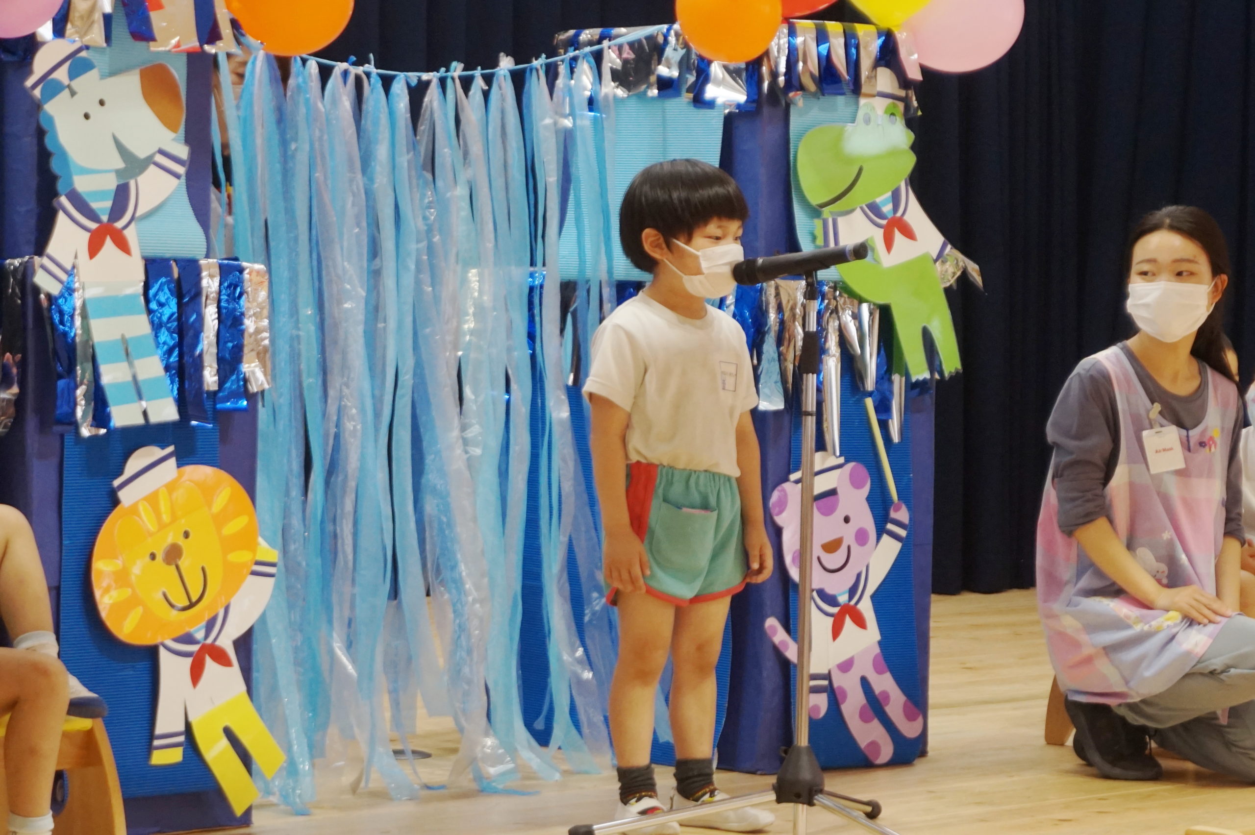 年長組のこどもたちはマイクで自分の名前と将来の夢や好きなキャラクターをみんなの前で話しました。ケーキ屋さん、先生、警察官、お医者さんなどいろいろな夢が飛び出しました。年長組のおともだちはさすがですね。はきはきと話すことができかっこよかったです。友達の将来の夢を聞いて「へえ、そうなんだ。」「ぼくと一緒だ!」と共感するうれしい姿がたくさんありました。年中のこどもたちはちょっぴり恥ずかしそうでしたが、将来の夢や好きなキャラクターなどを話してくれました。
