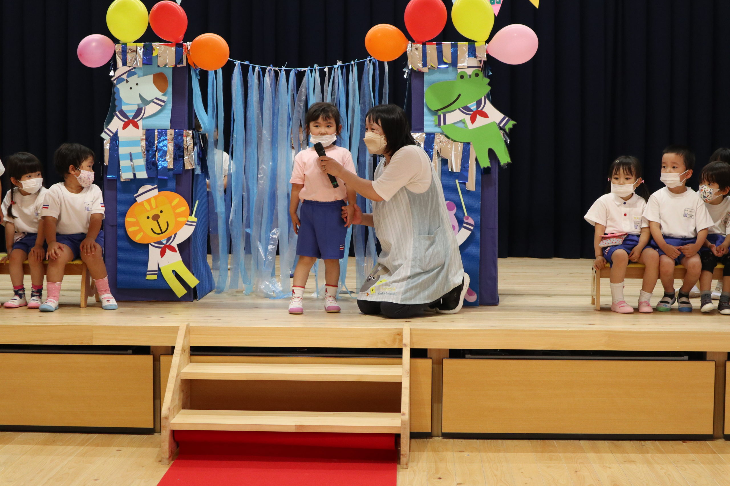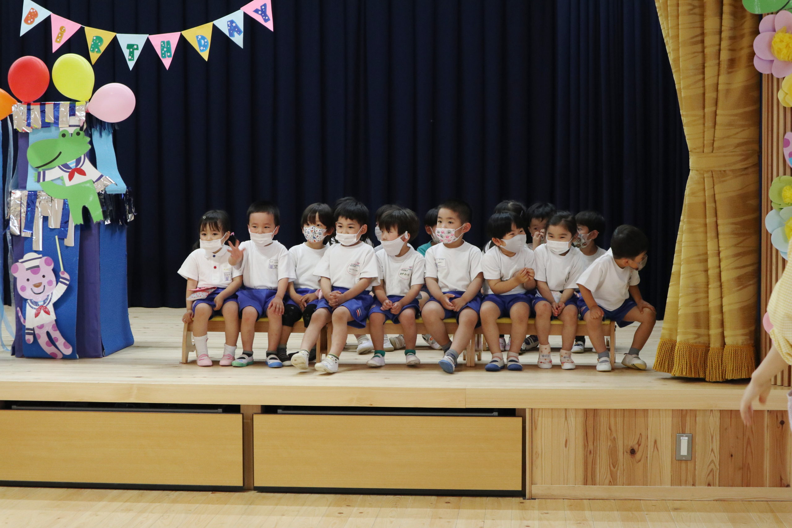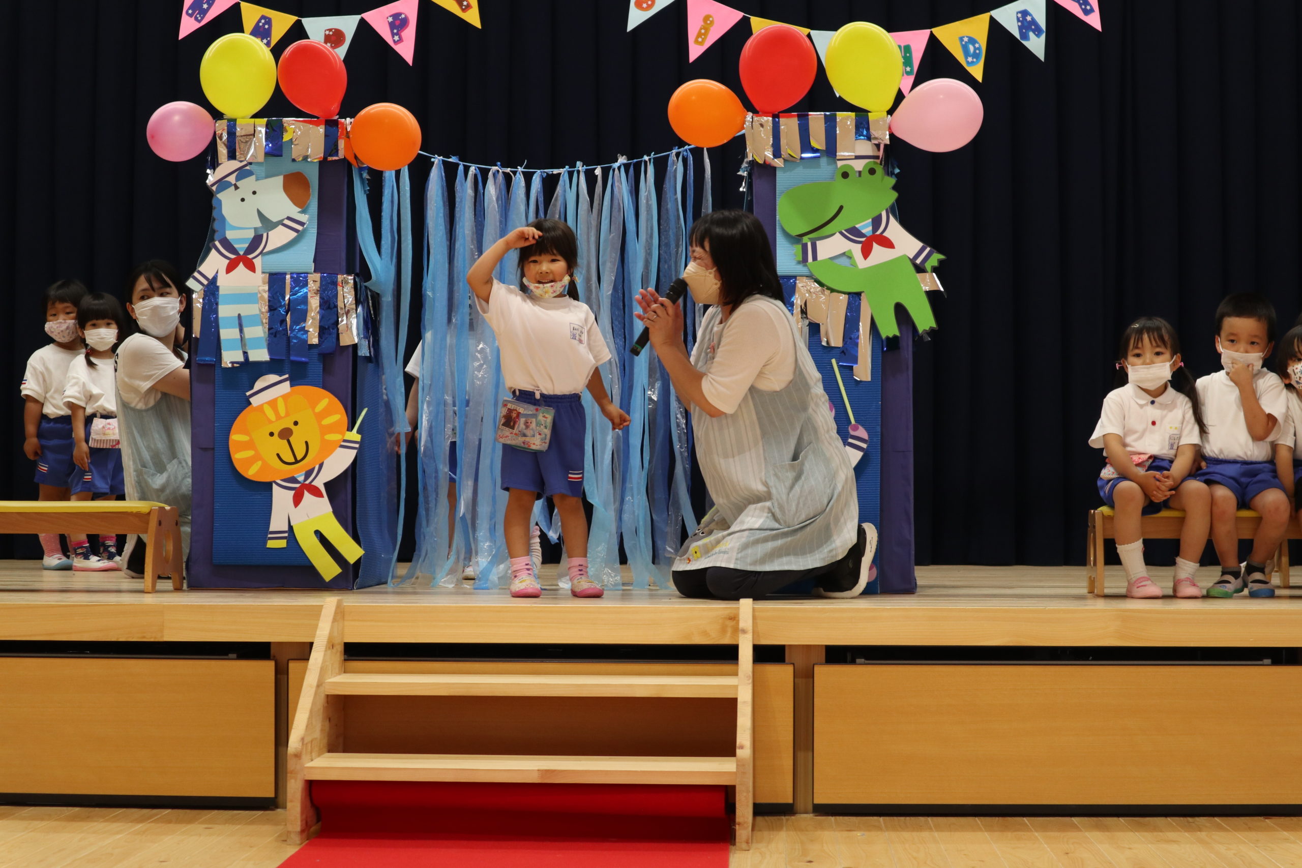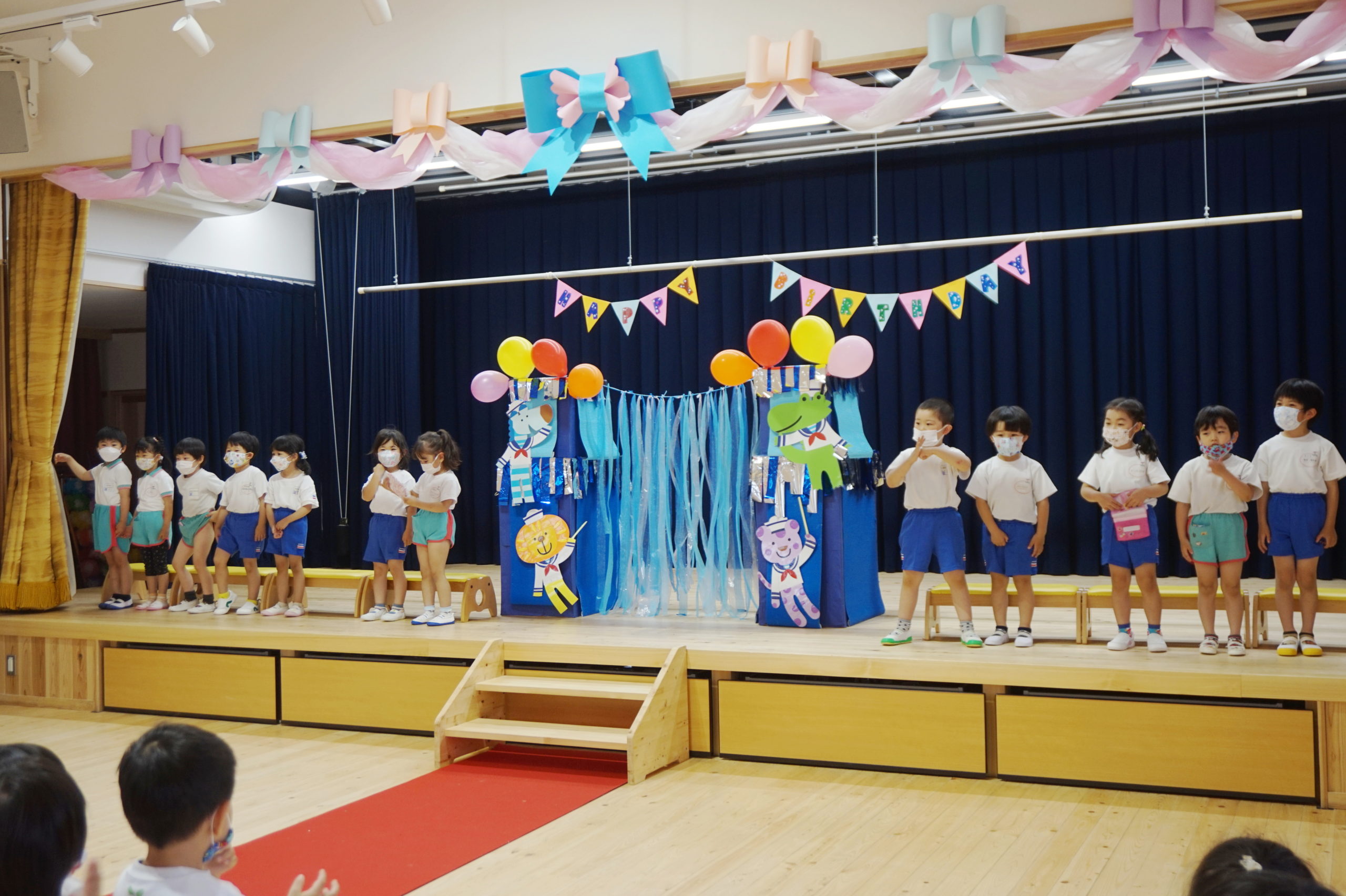 4・5月生まれのこどもたちは一人ずつ水兵さんアーチのカーテンをくぐって舞台中央に登場しました。