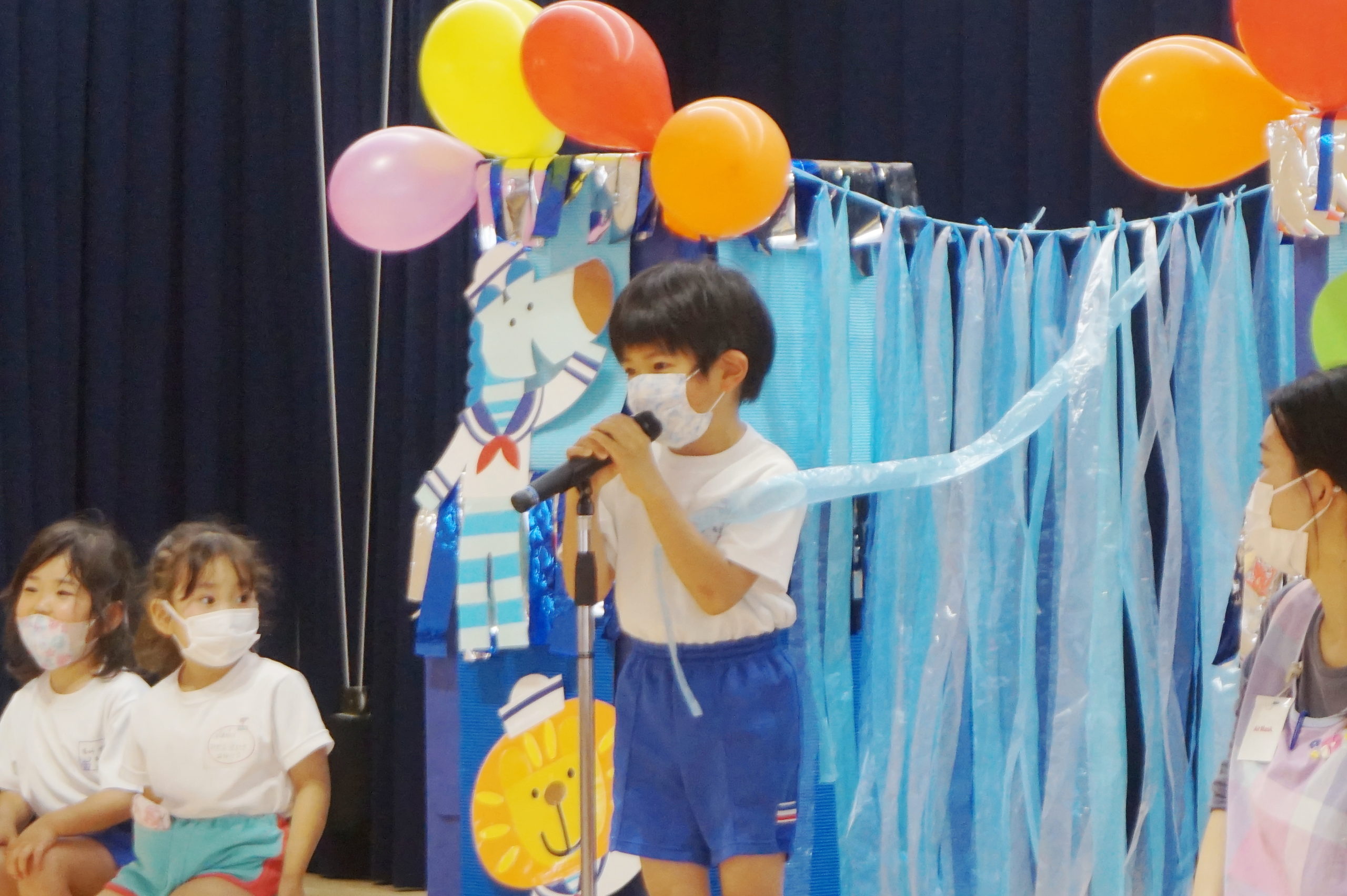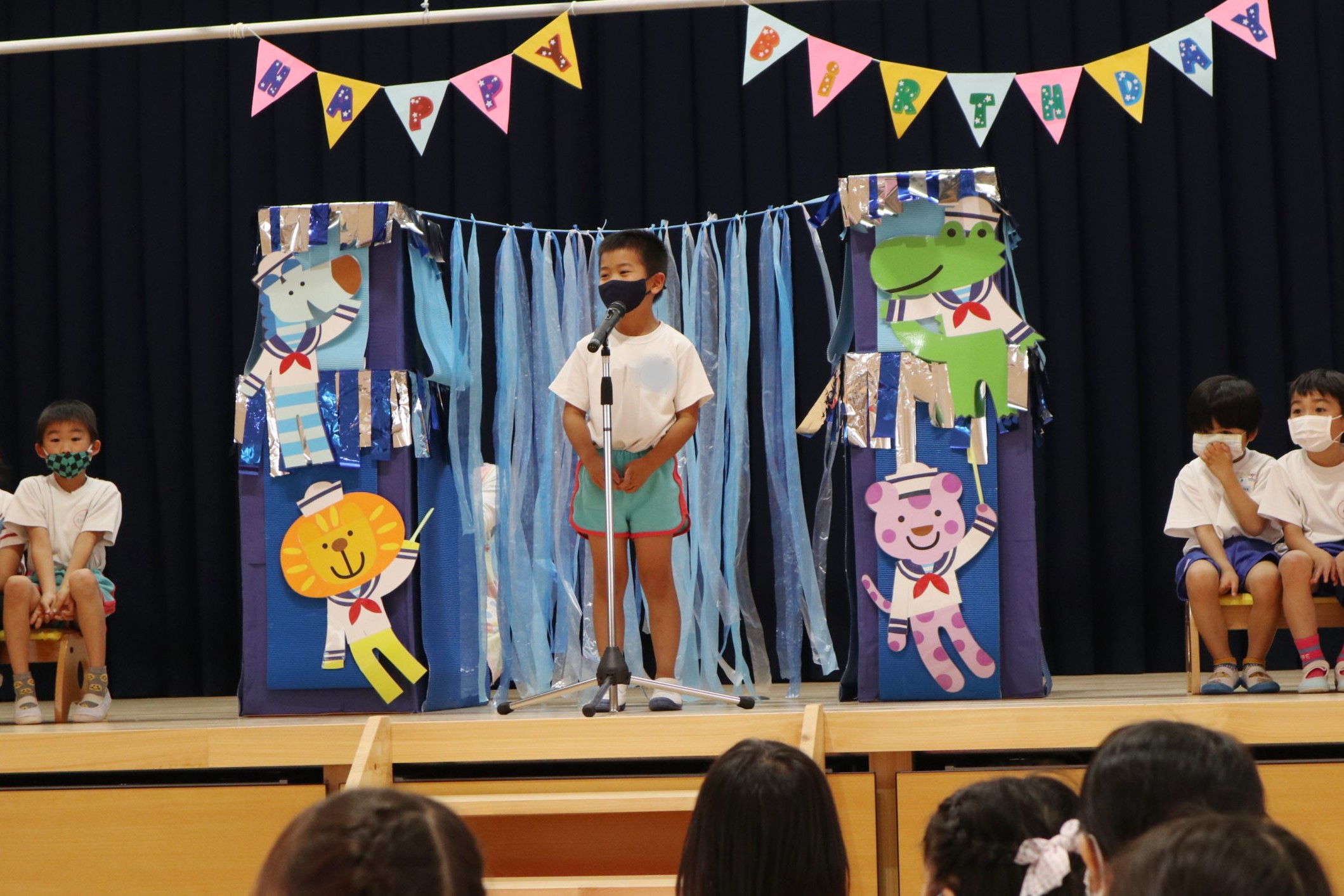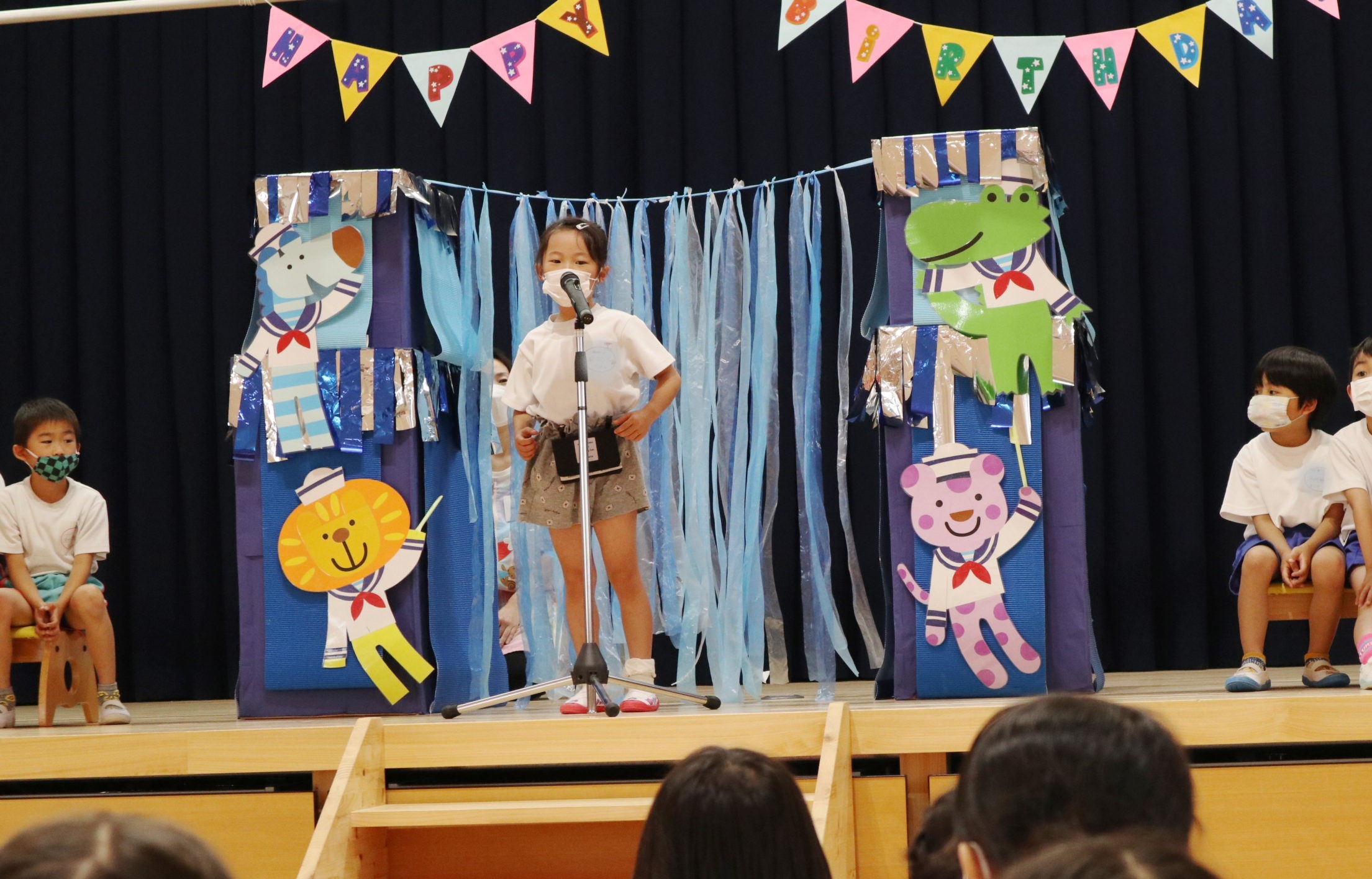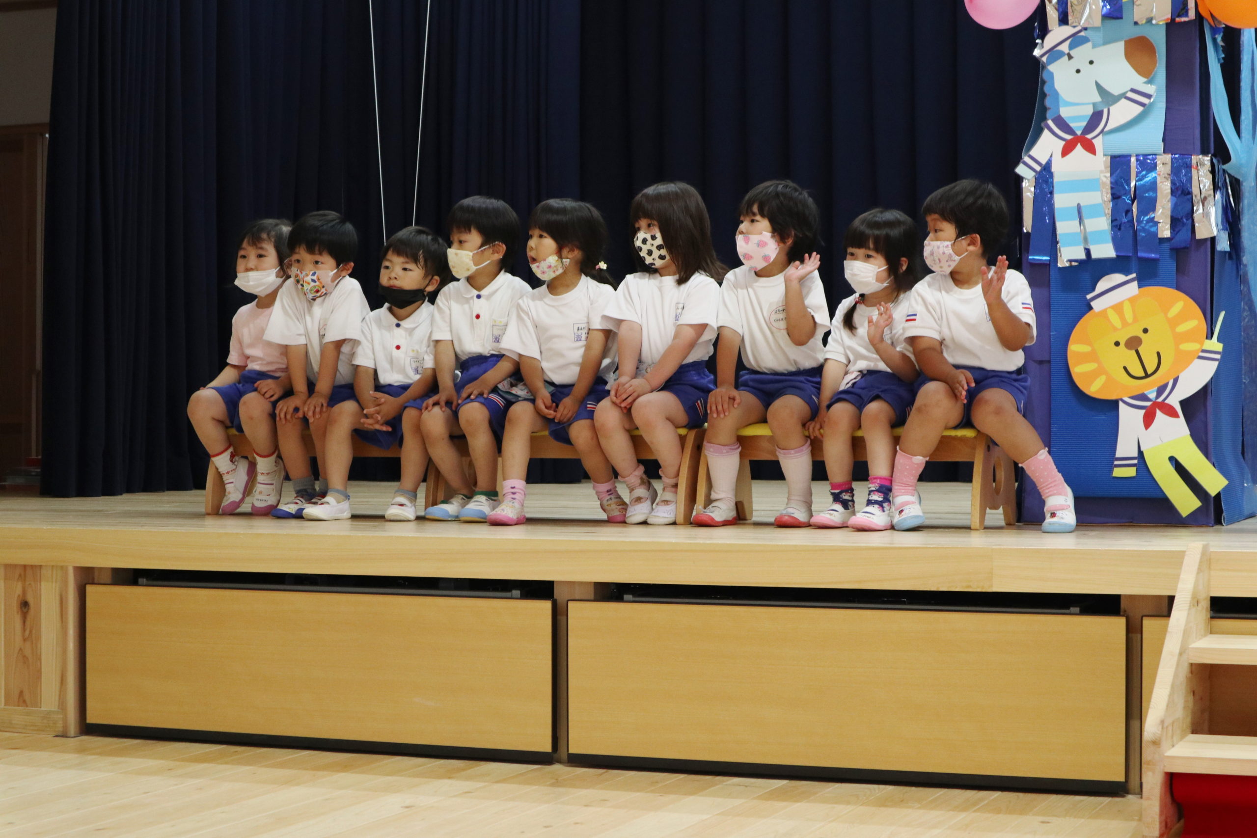 4・5月生まれのこどもたちは一人ずつ水兵さんアーチのカーテンをくぐって舞台中央に登場しました。