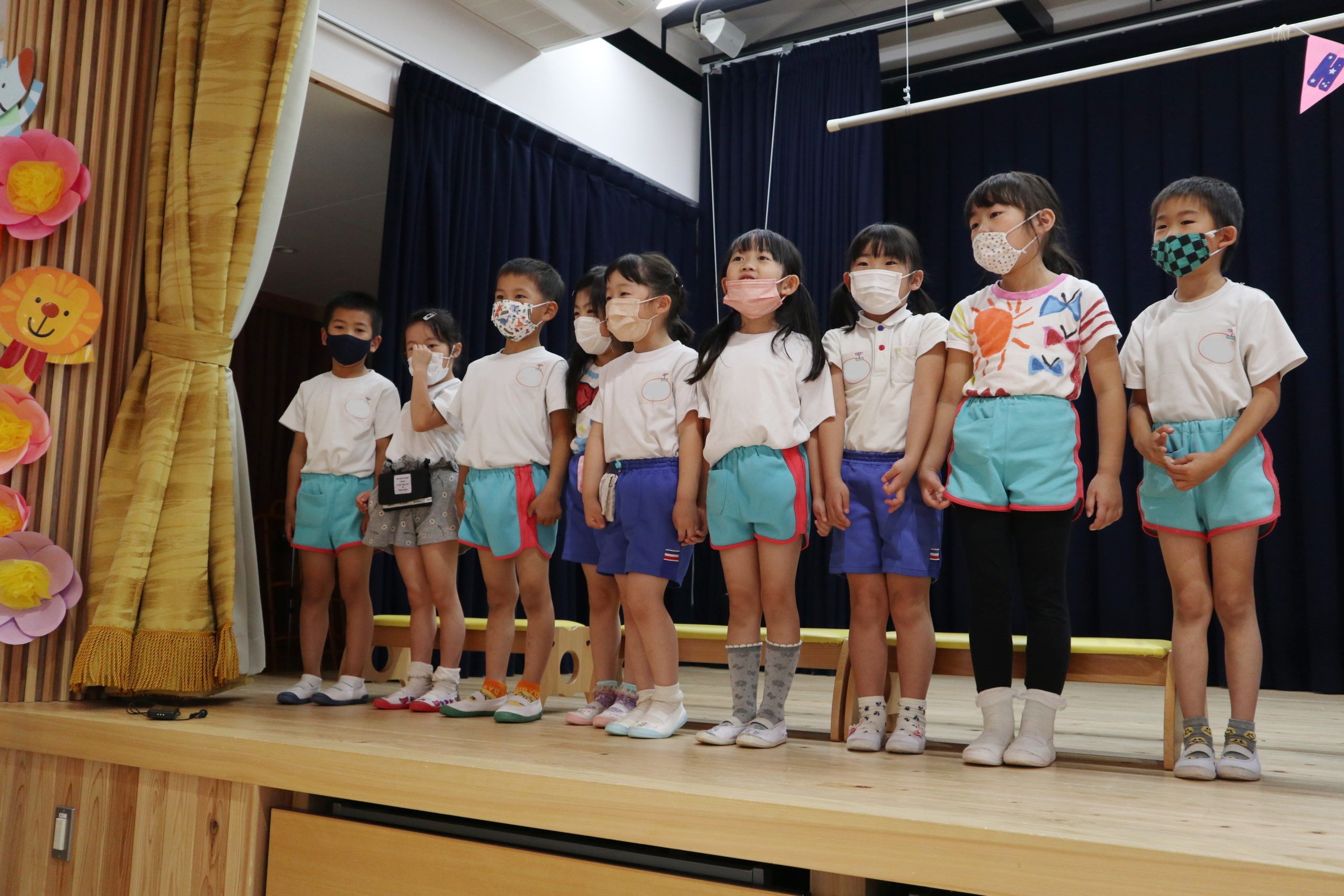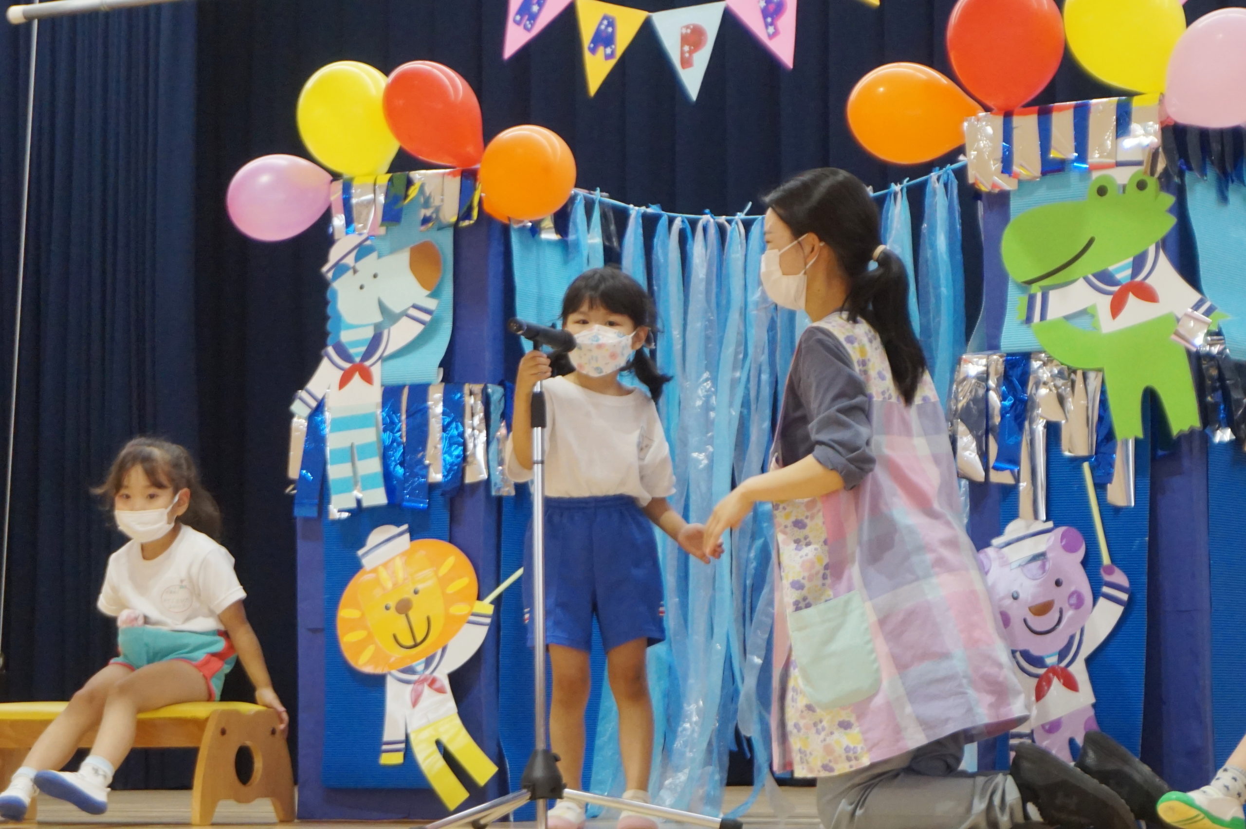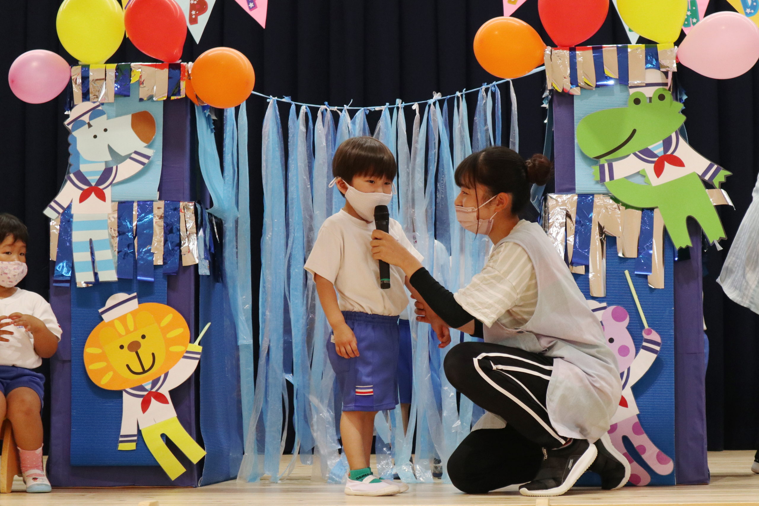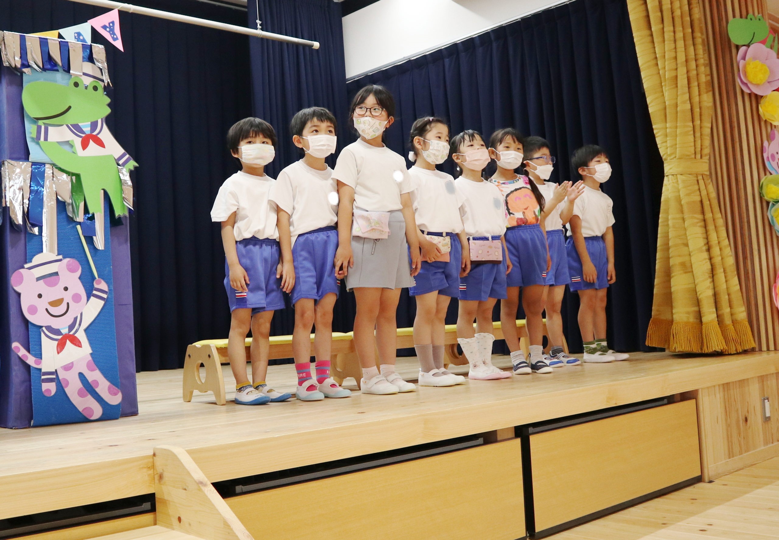 4・5月生まれのこどもたちは一人ずつ水兵さんアーチのカーテンをくぐって舞台中央に登場しました。