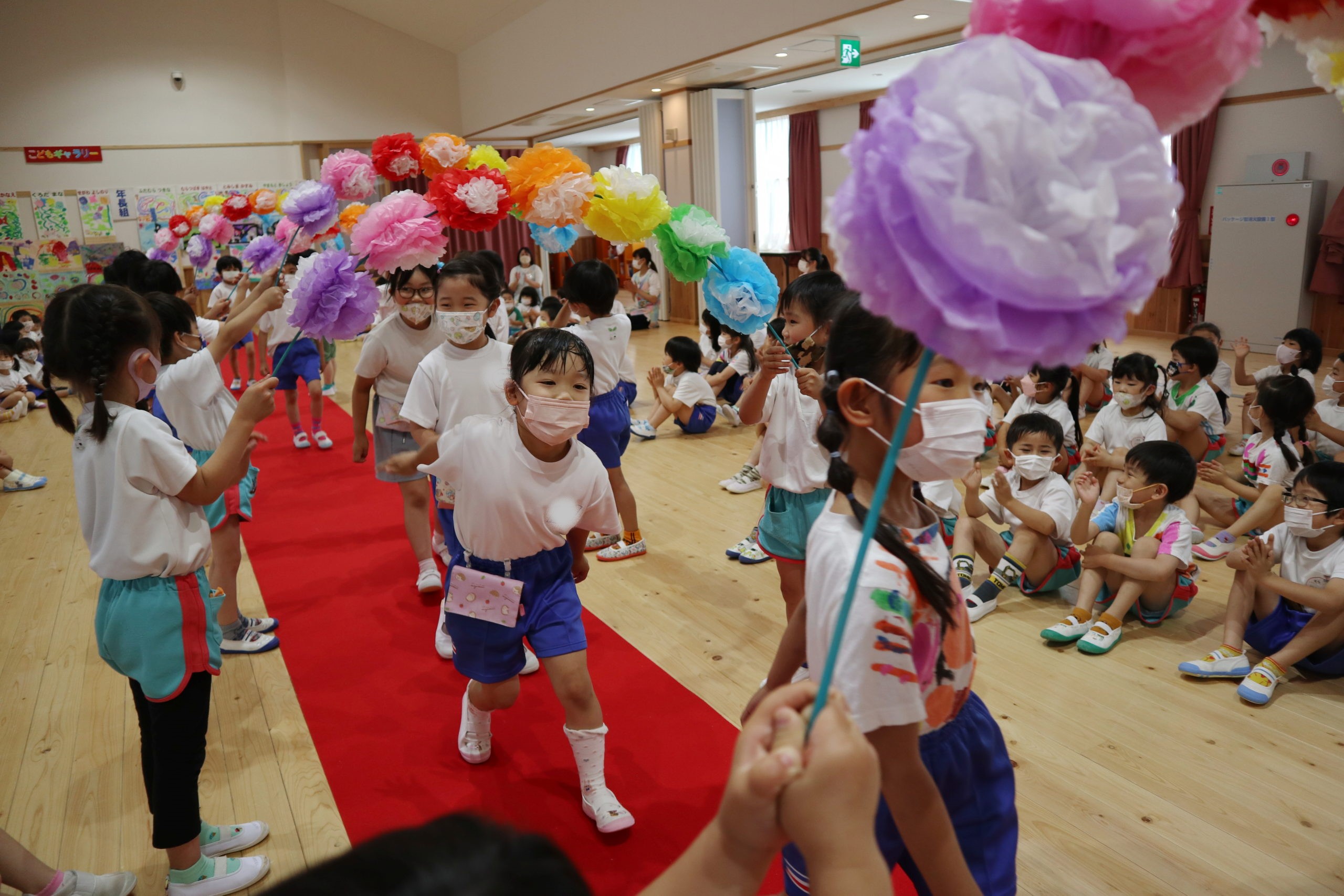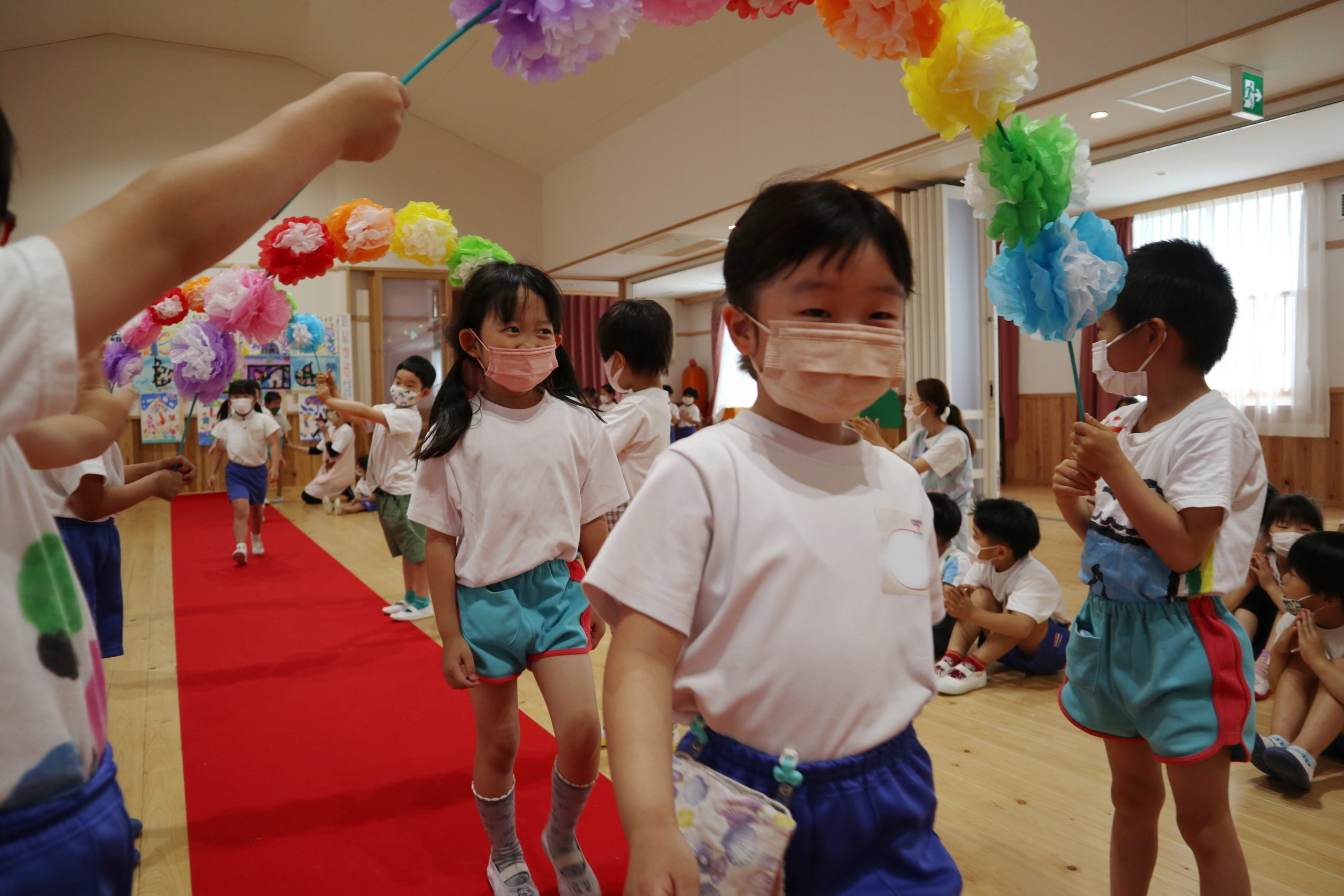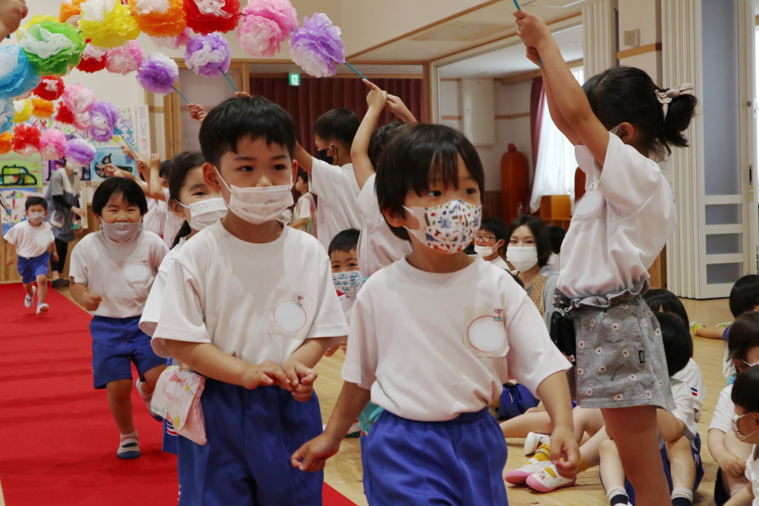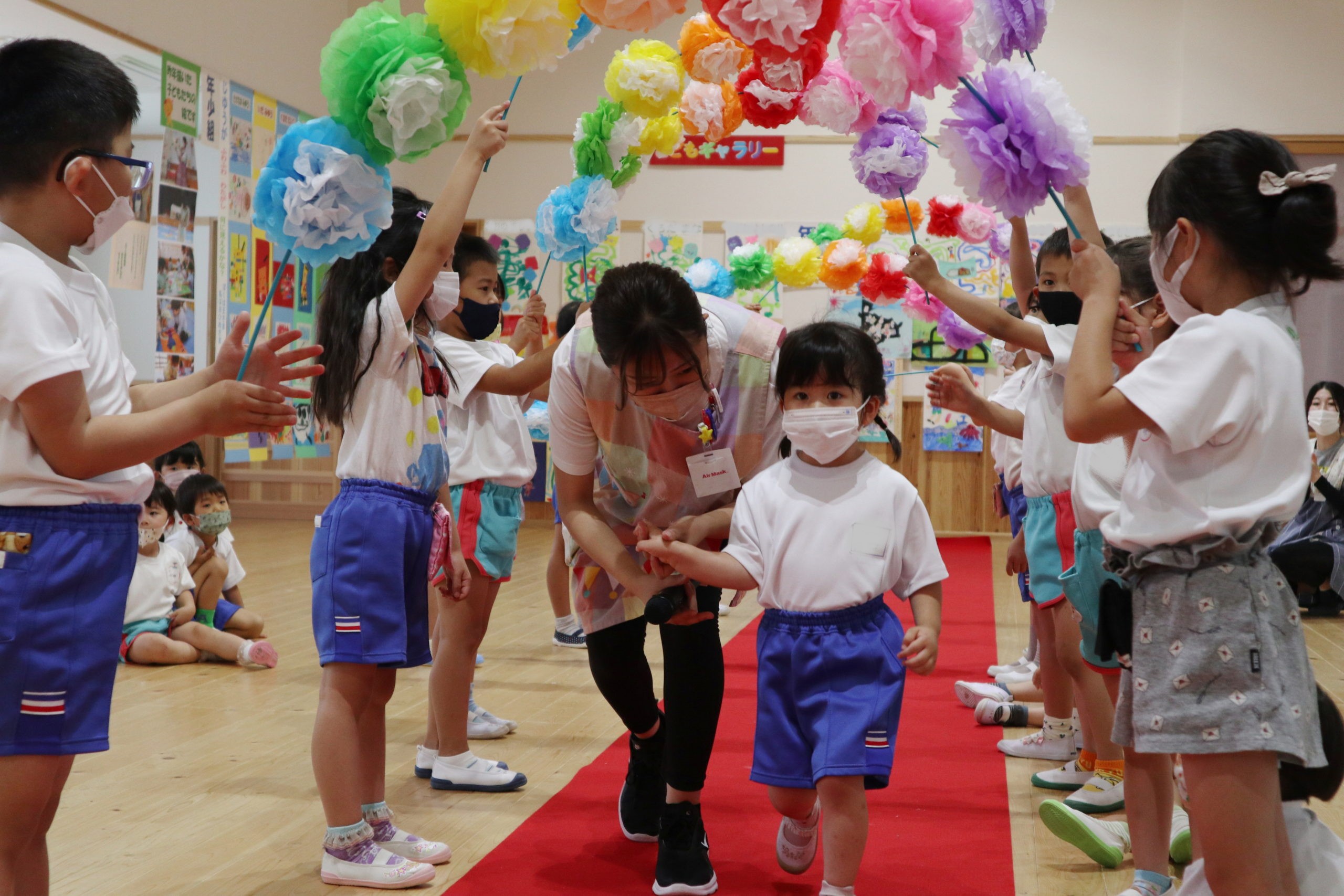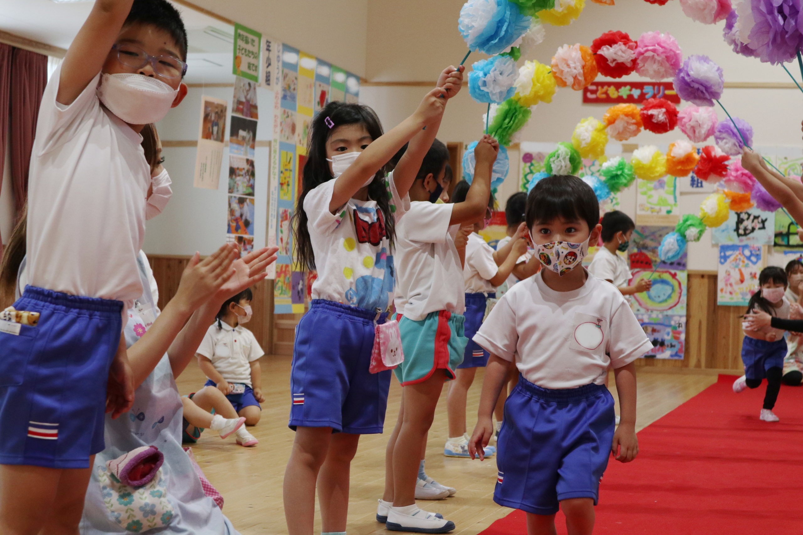 七色のお花のアーチをくぐってお誕生児が入場しました。みんなに拍手を送られ笑顔で歩く子も、ちょっぴり緊張している子もいました。