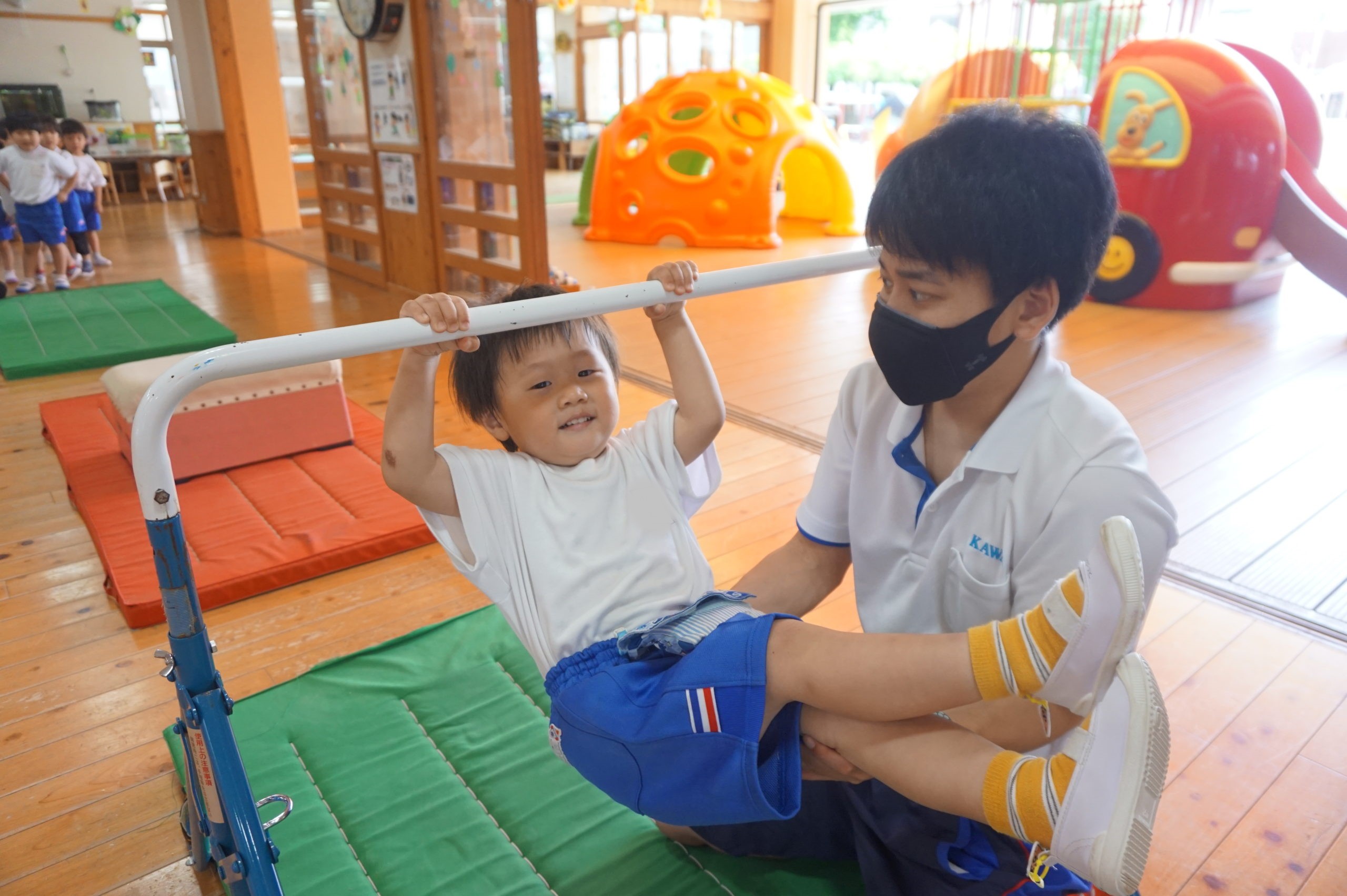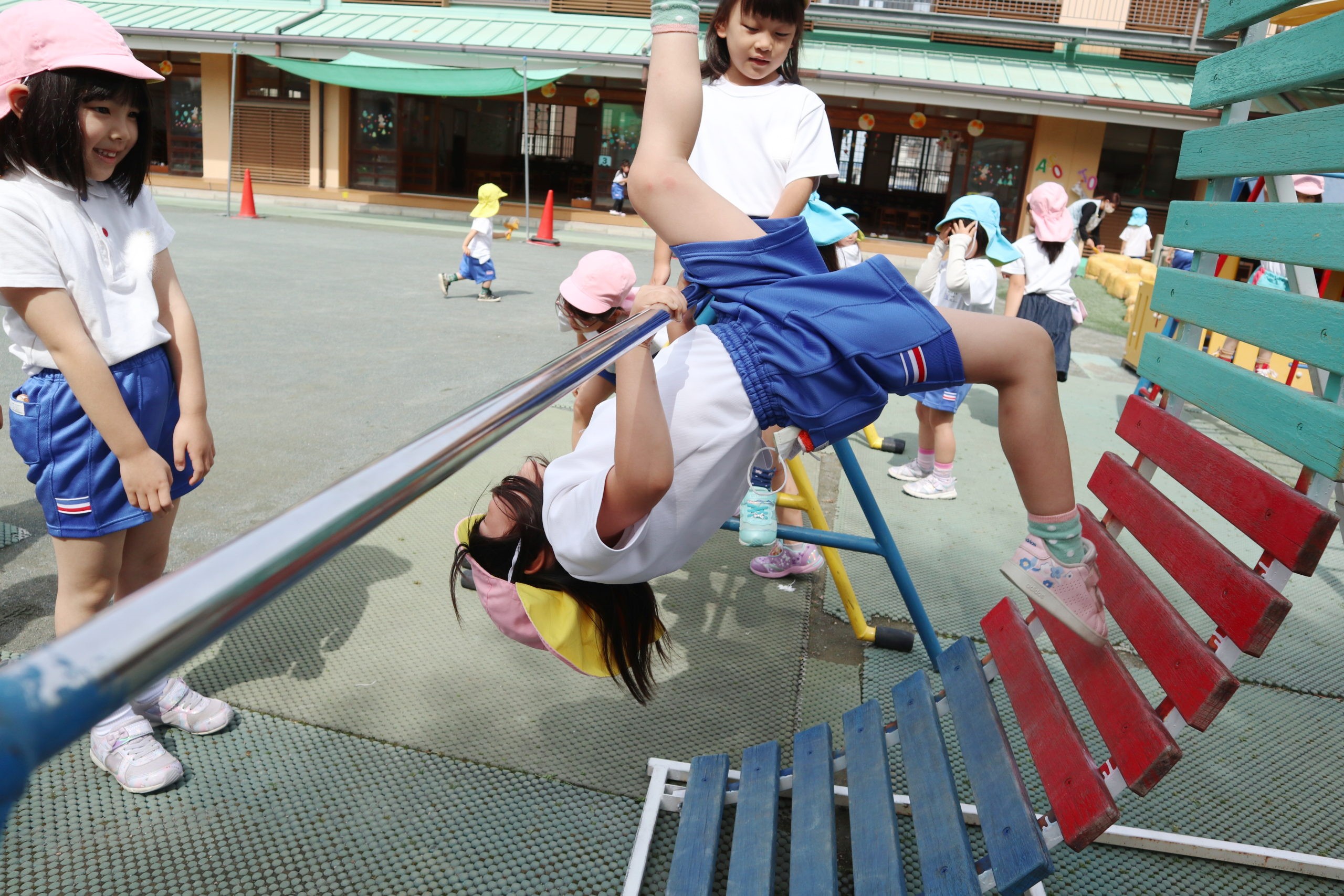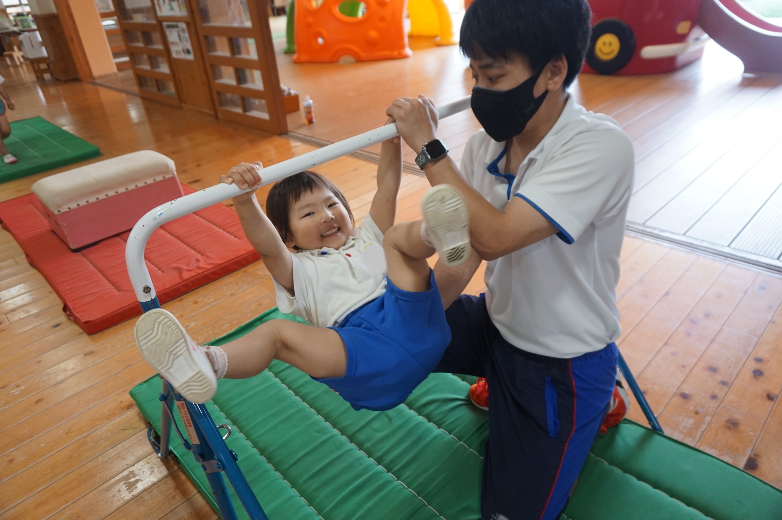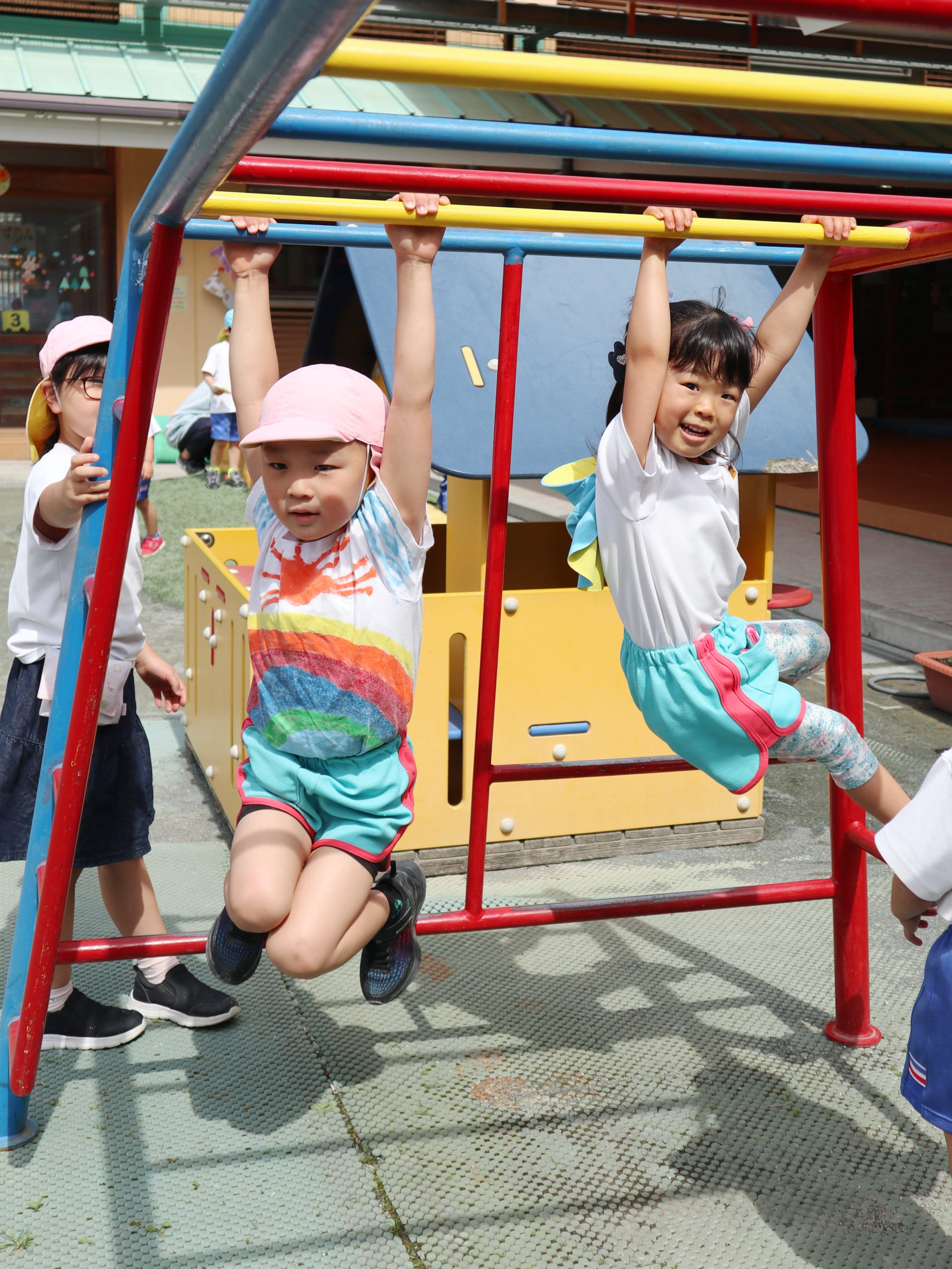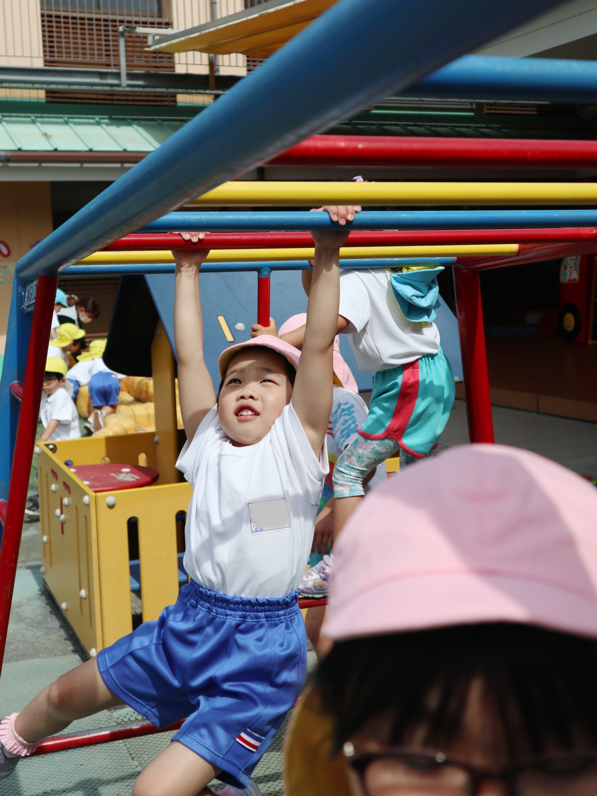 毎日うんていや鉄棒にチャレンジしているこどもたち。両手でぶら下がるのが精いっぱいだった子が「先生、みてみて。3番目の棒まで行ったよ!」「今日は黄色の棒までできたよ。」とうれしそうに教えてくれます。