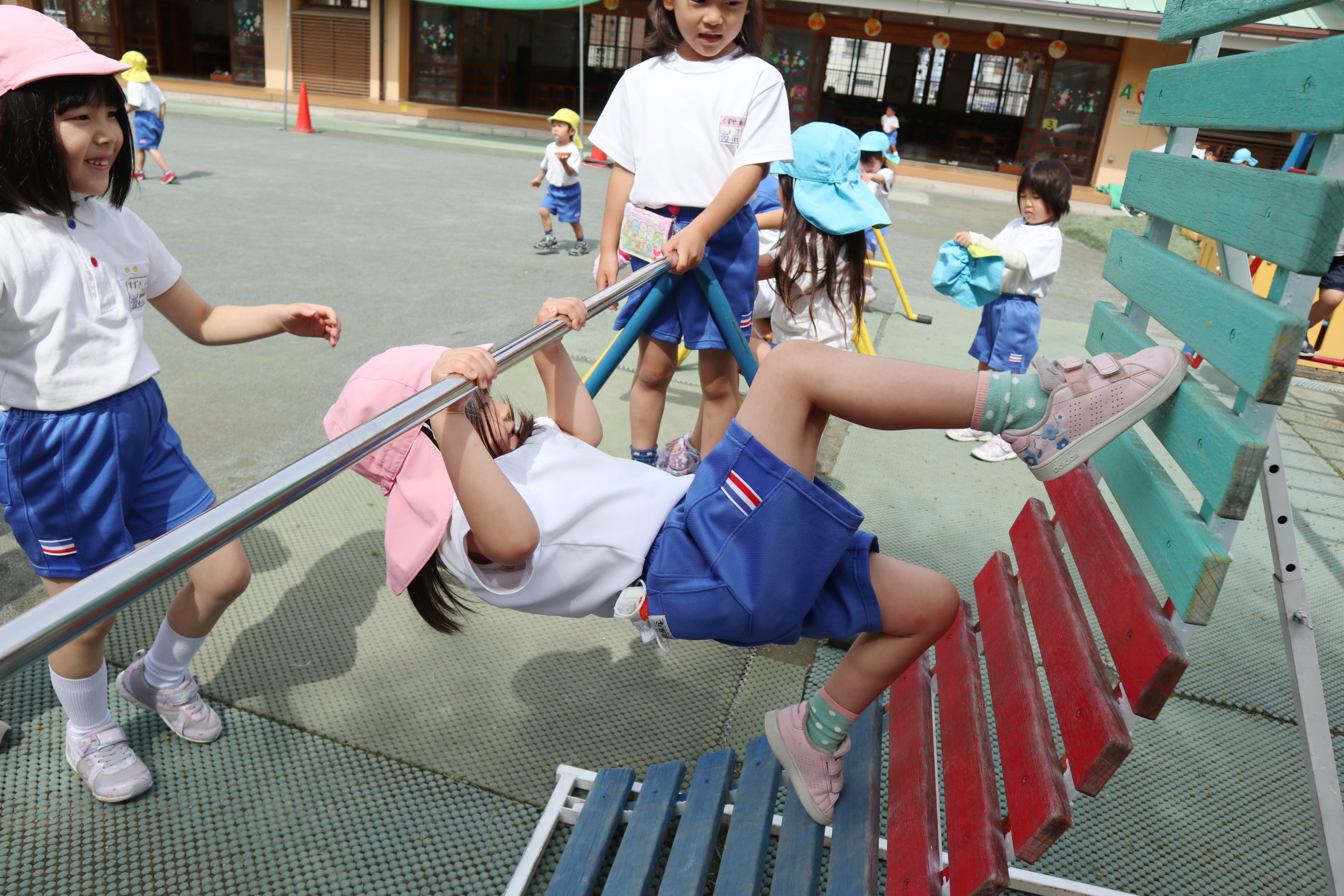 「うんてい、半分まで行けるようになったよ!」と、お家で嬉しそうにお母さんに話したおともだち。朝、登園した際にレンガの塀の向こうからそっと見守るお母さんの姿がありました。「毎日、家へ帰ってきてから厚見小学校で練習をしているんですよ。」とお母さんが話してくれました。幼稚園だけでなく、帰宅してからもこつこつと練習を積み重ねていたのですね。すごいですね。大好きなお父さんやお母さんが頑張りを認めてくれたり、励ましてくれることでいっぱい頑張れるのでしょうね。