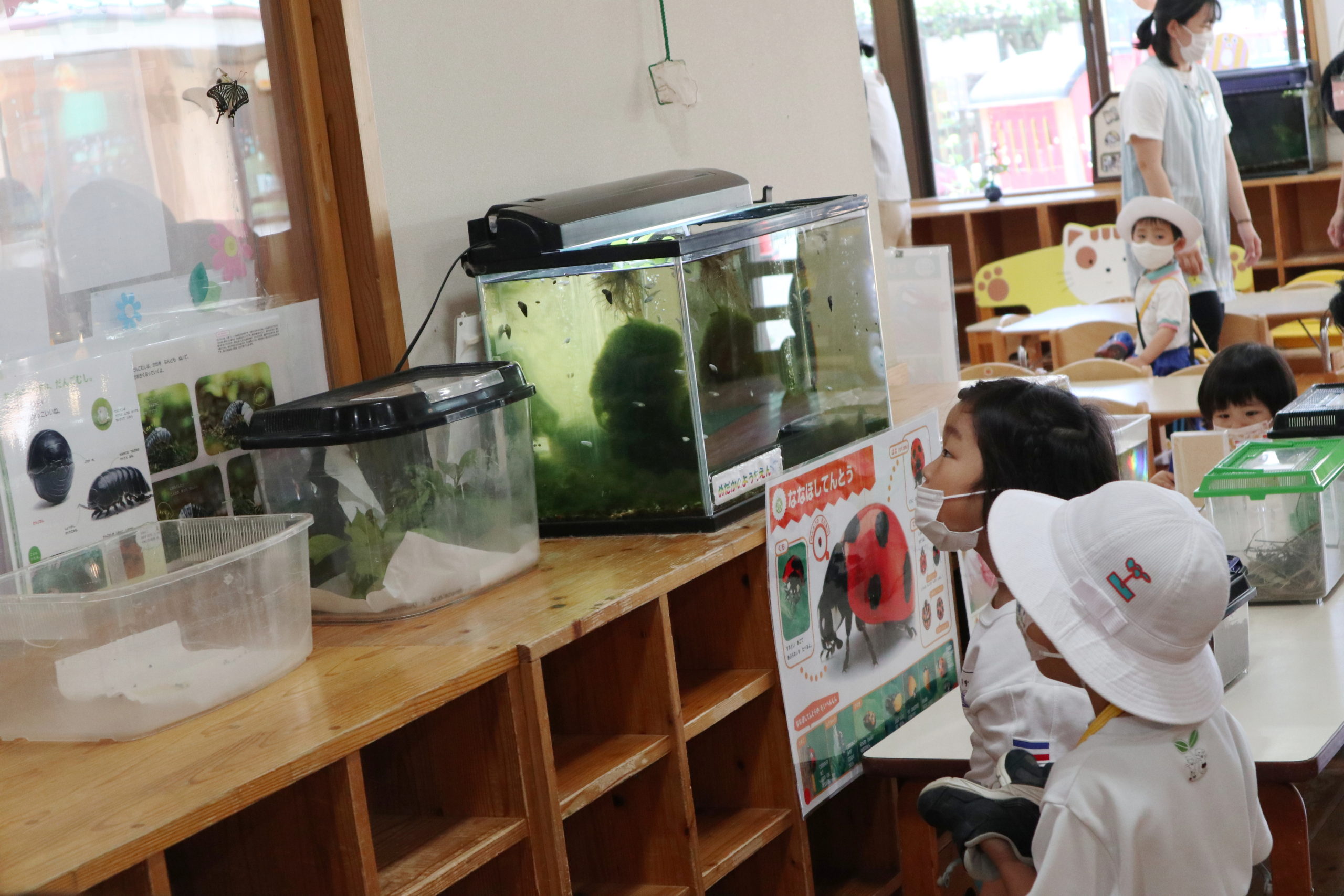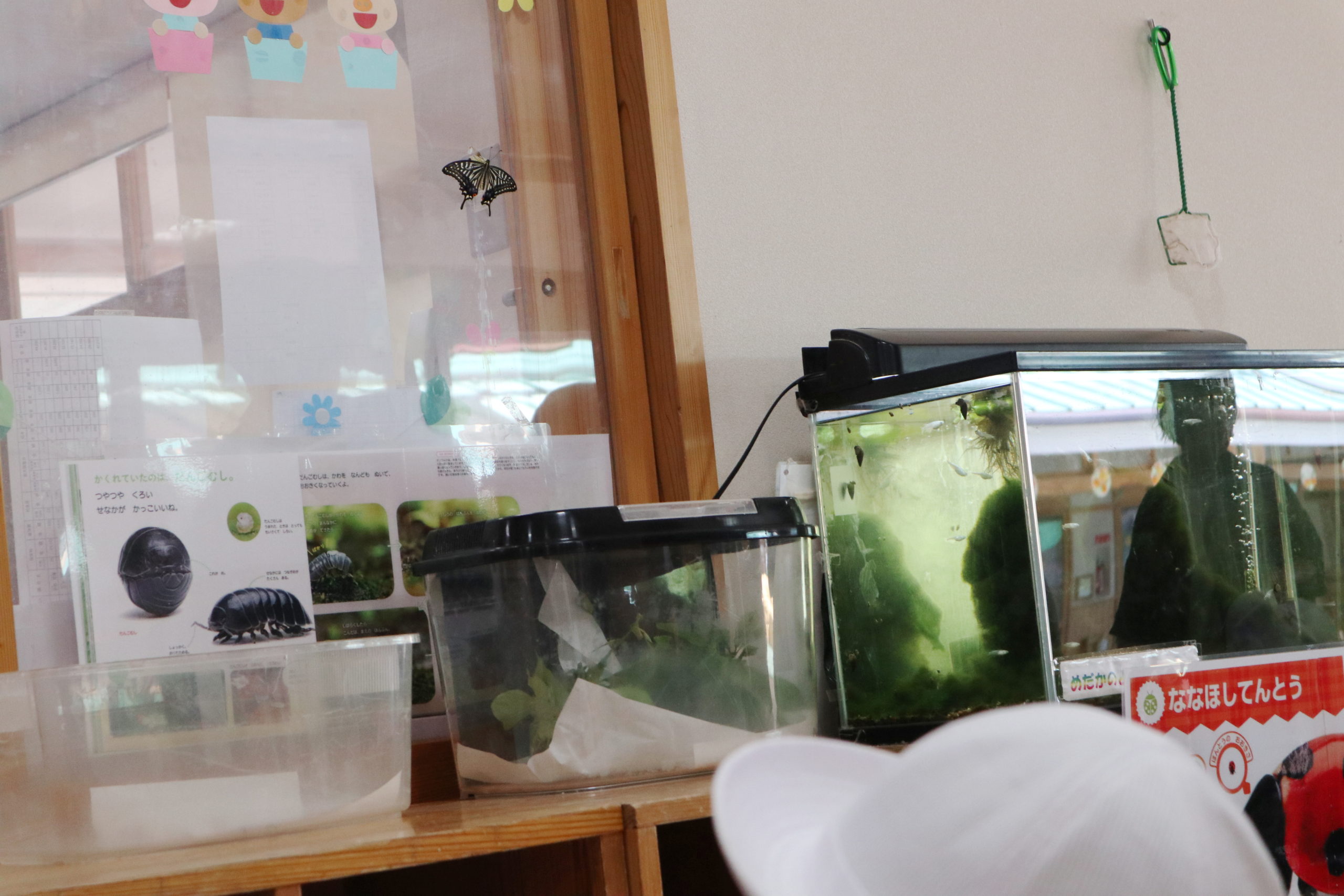 実は、さなぎ時代に子どもたちが触って下に落ちてしまいました。そこで知恵を使って両面テープで窓ガラスにくっつけたという訳です。