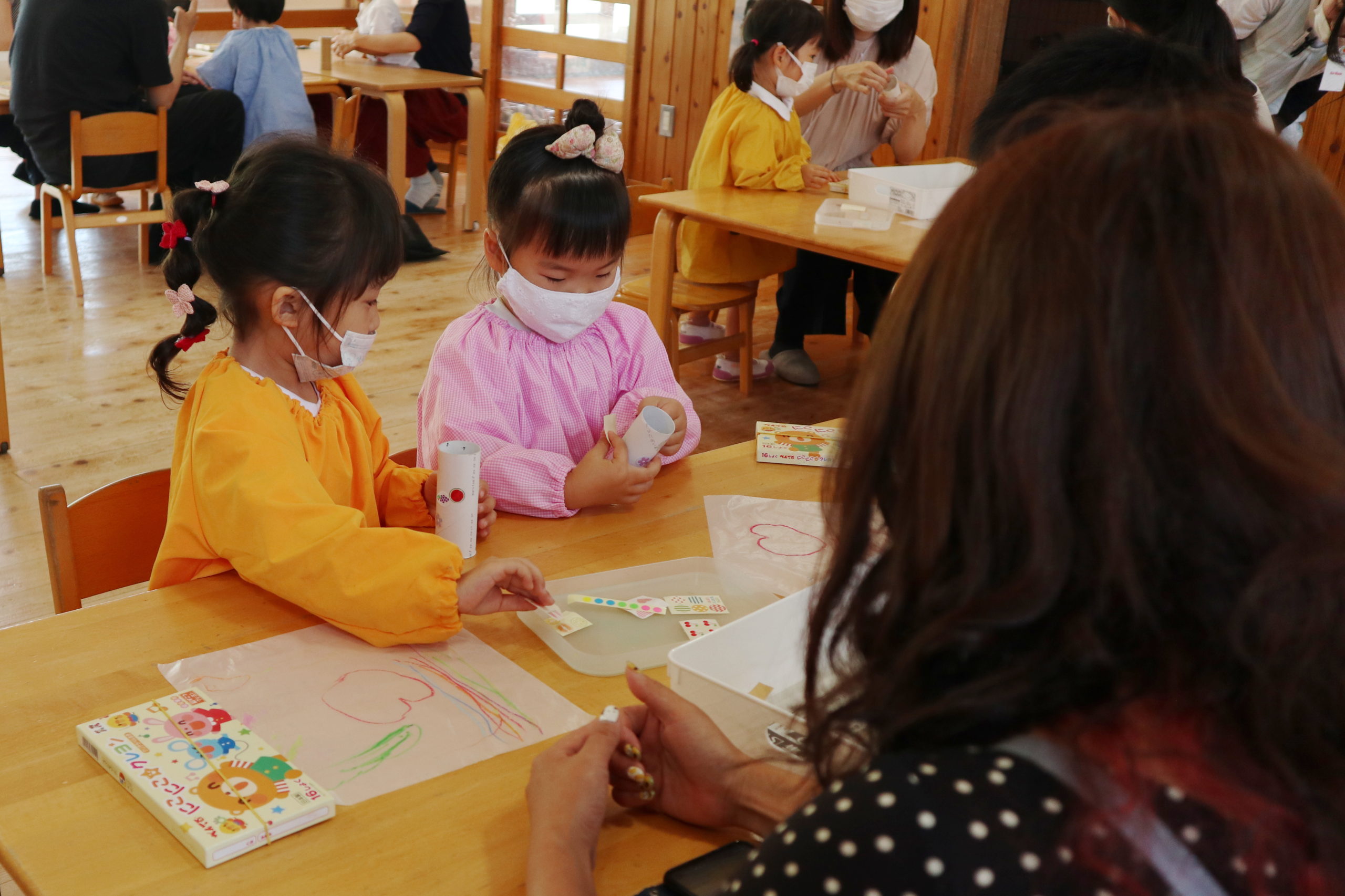 「パパ、次はテープで貼ってね!」「はーい。」パパの腕の見せどころ。