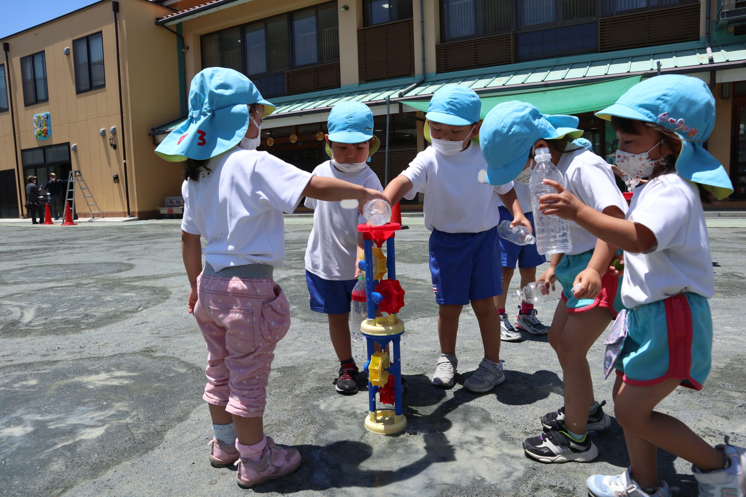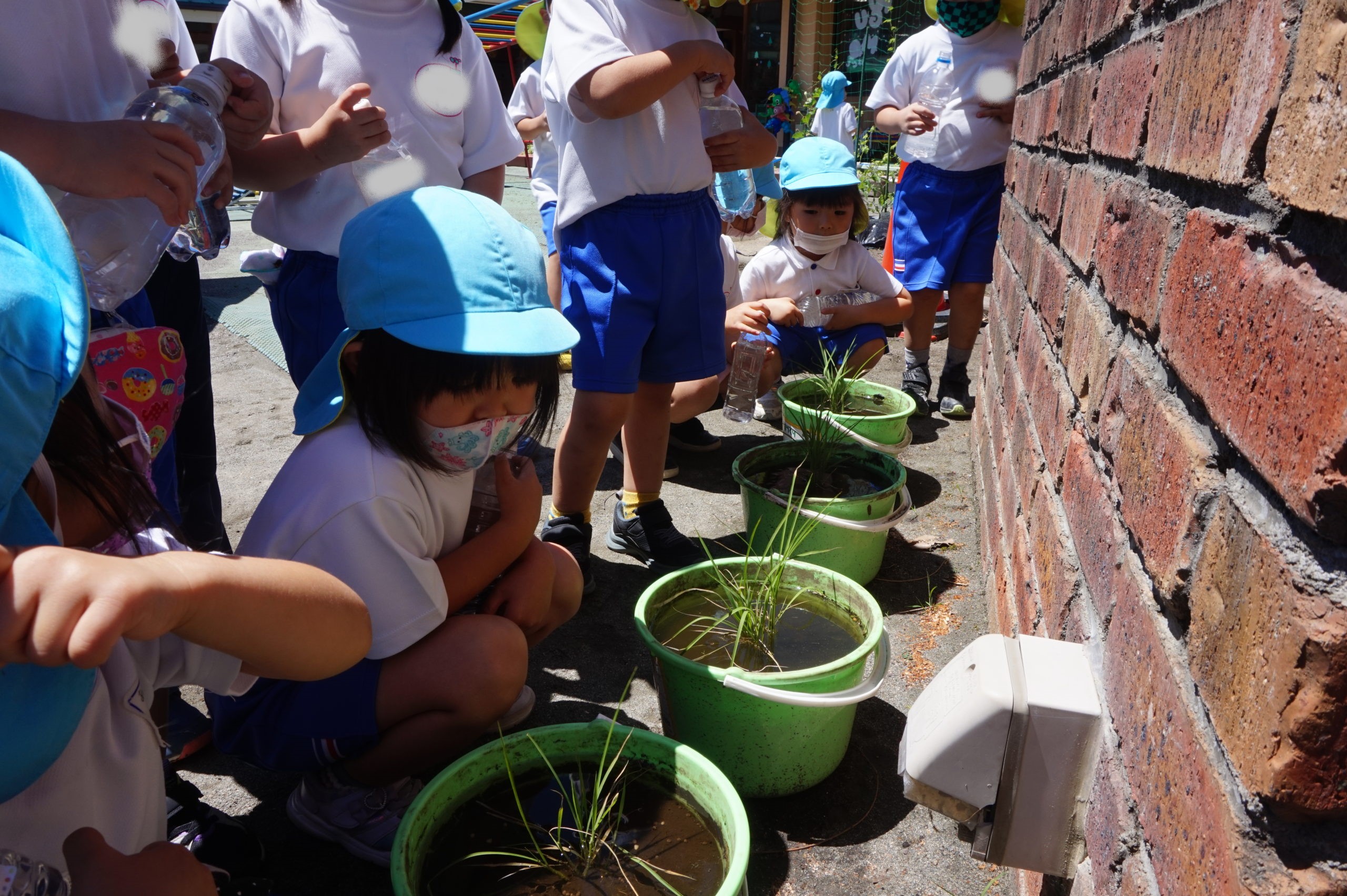 年中組のこどもたちはASOBOTTOで水を汲んでは、稲や野菜、お花の芽に水やりをしています。
